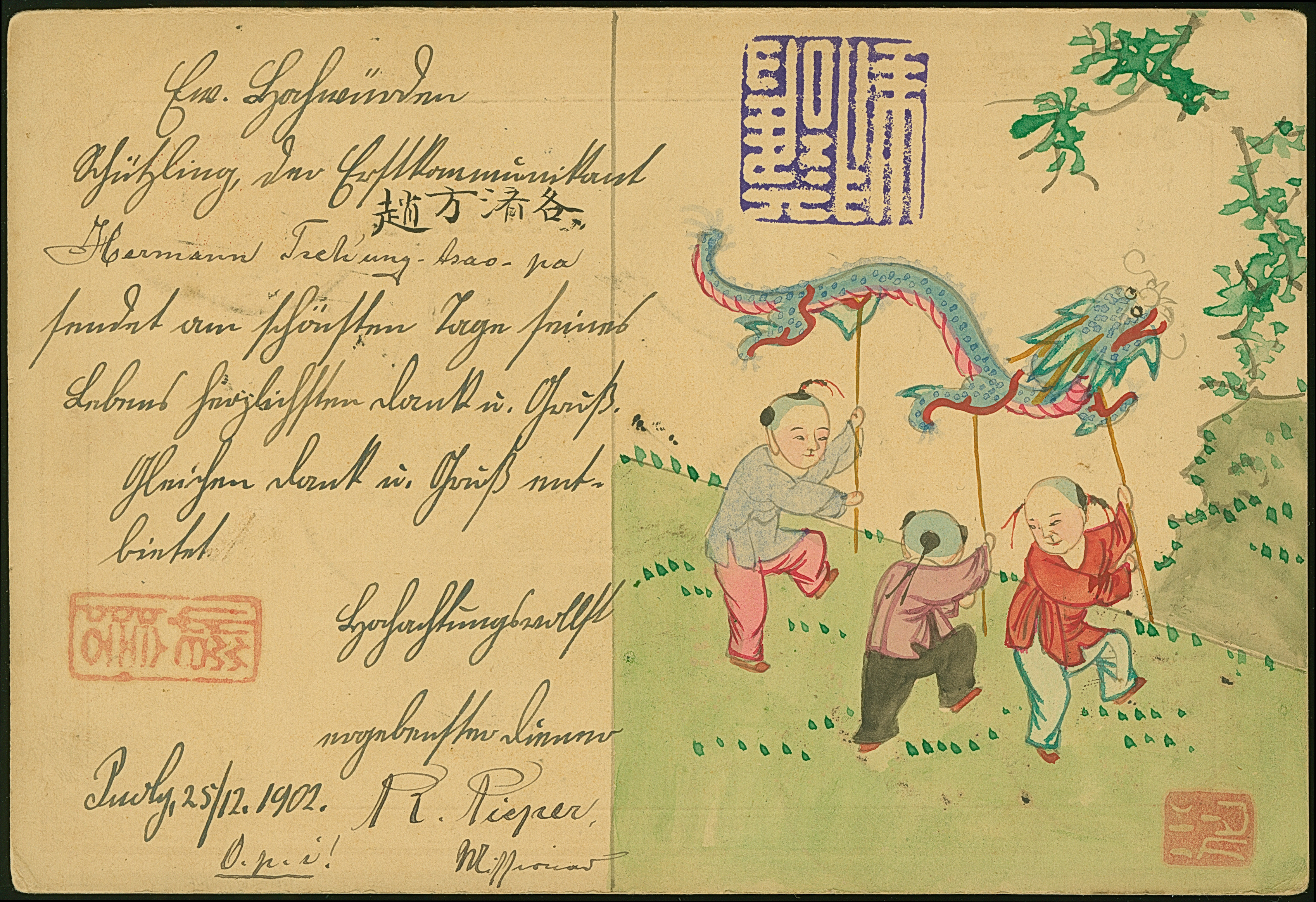 1902, Coiling Dragons ½ c. and 1 c. ochre, two singles of each value, tied by cds “KIAOCHOW 27 DEC 02” to postal stationery card 1 c. to Germany with additional Kiautschou 5 pfg. applied for foreign outbound despatch, very fine. A most appealing multicolour combination franking