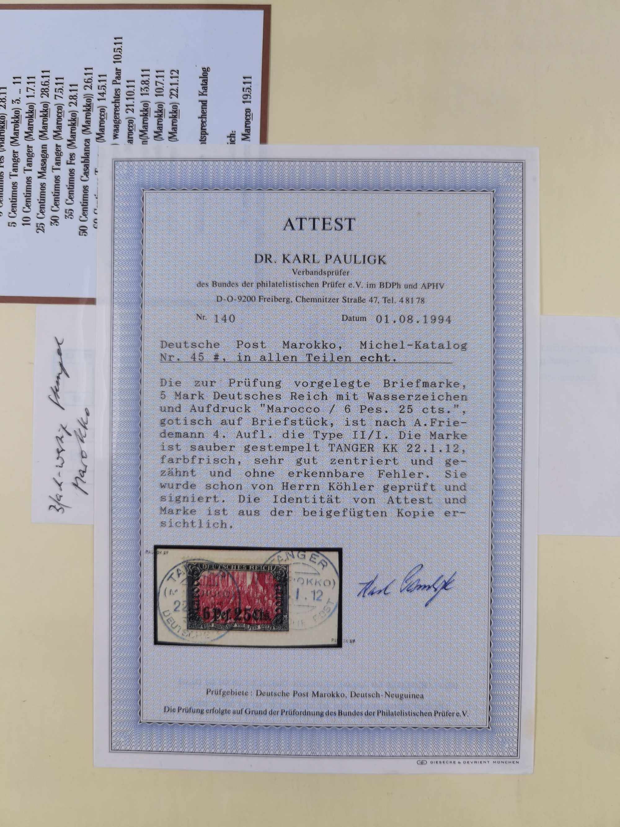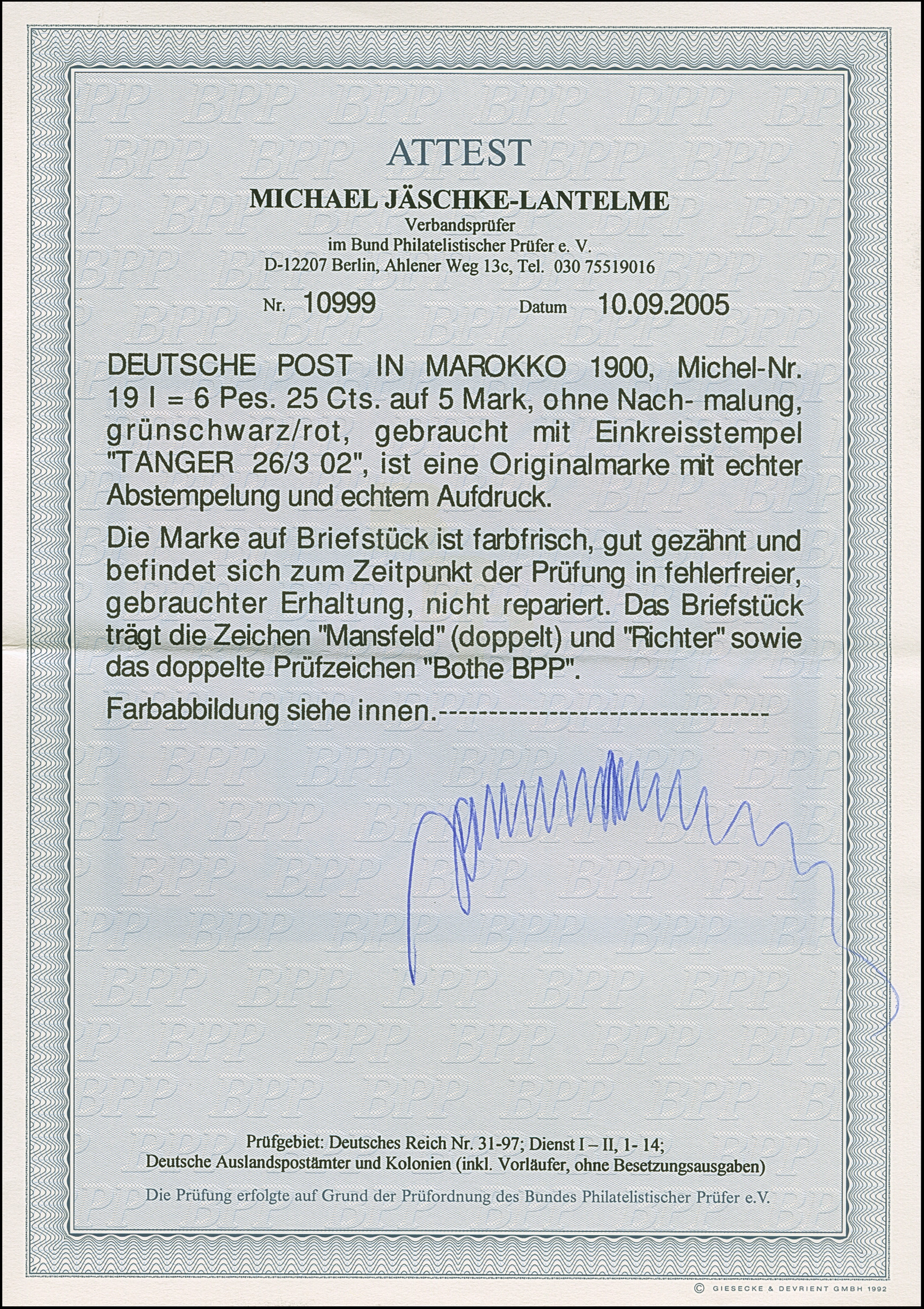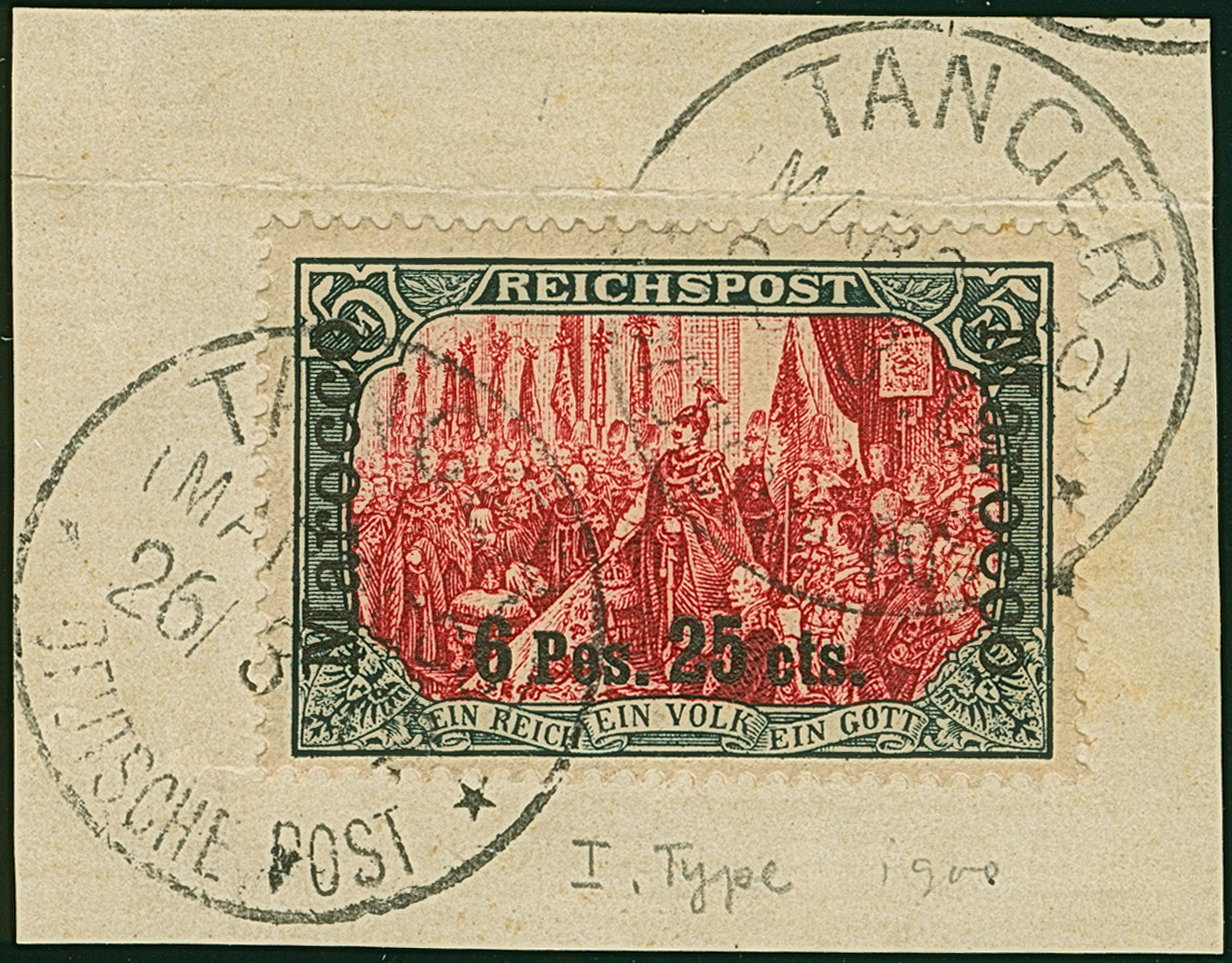 1900/03, 6 Pes. 25 cts auf Reichspost 5 M., Type I ohne Nachmalung mit Stempel “TANGER (MAROCCO) DP 26.3.02” auf Briefstück. Die Marke ist in tadelloser Erhaltung, das Briefstück mit leichten Bugspuren, signiert Richter und doppelt Mansfeld und Bothe BPP sowie Fotoattest Jäschke-L. BPP (2005)