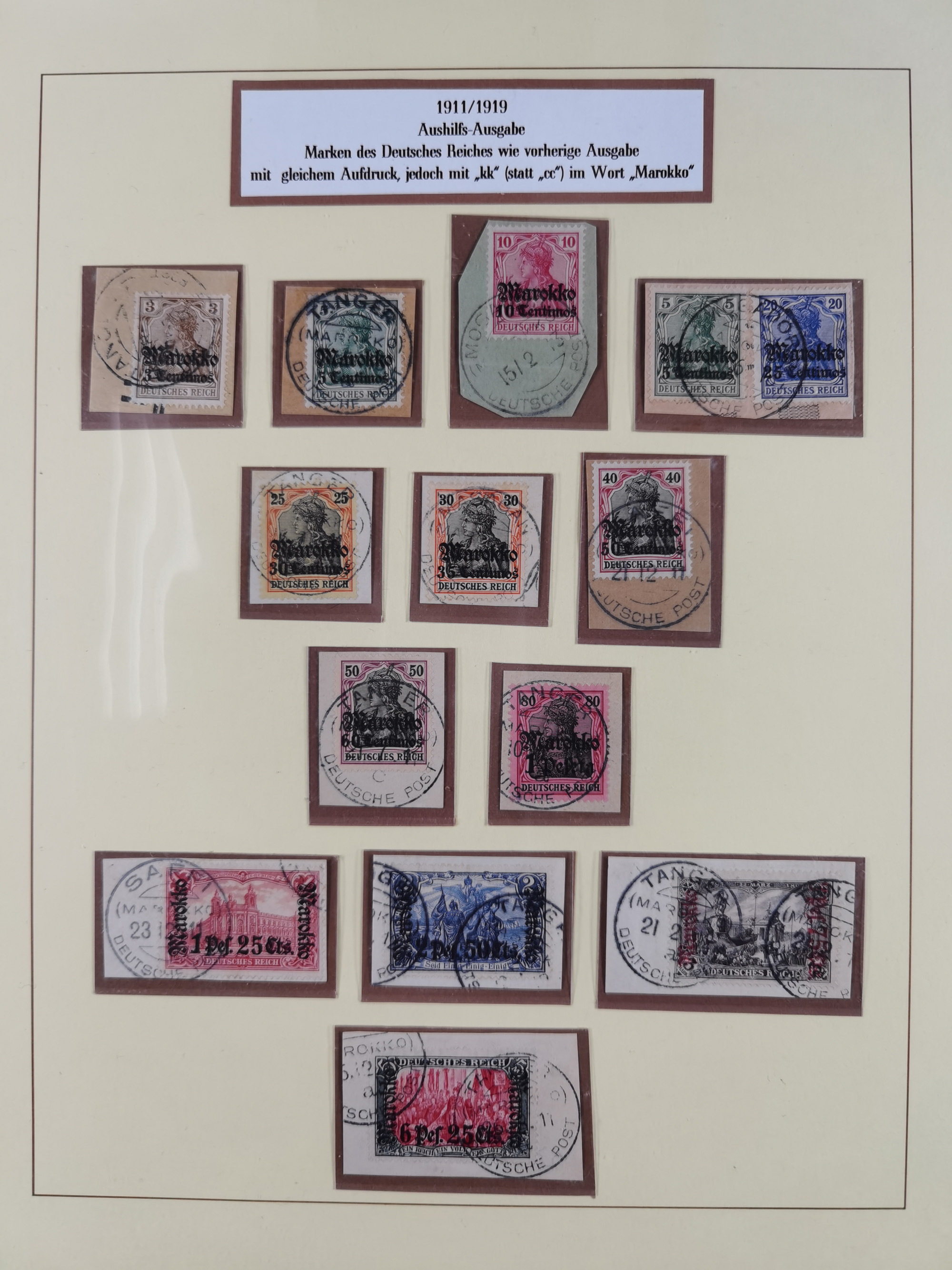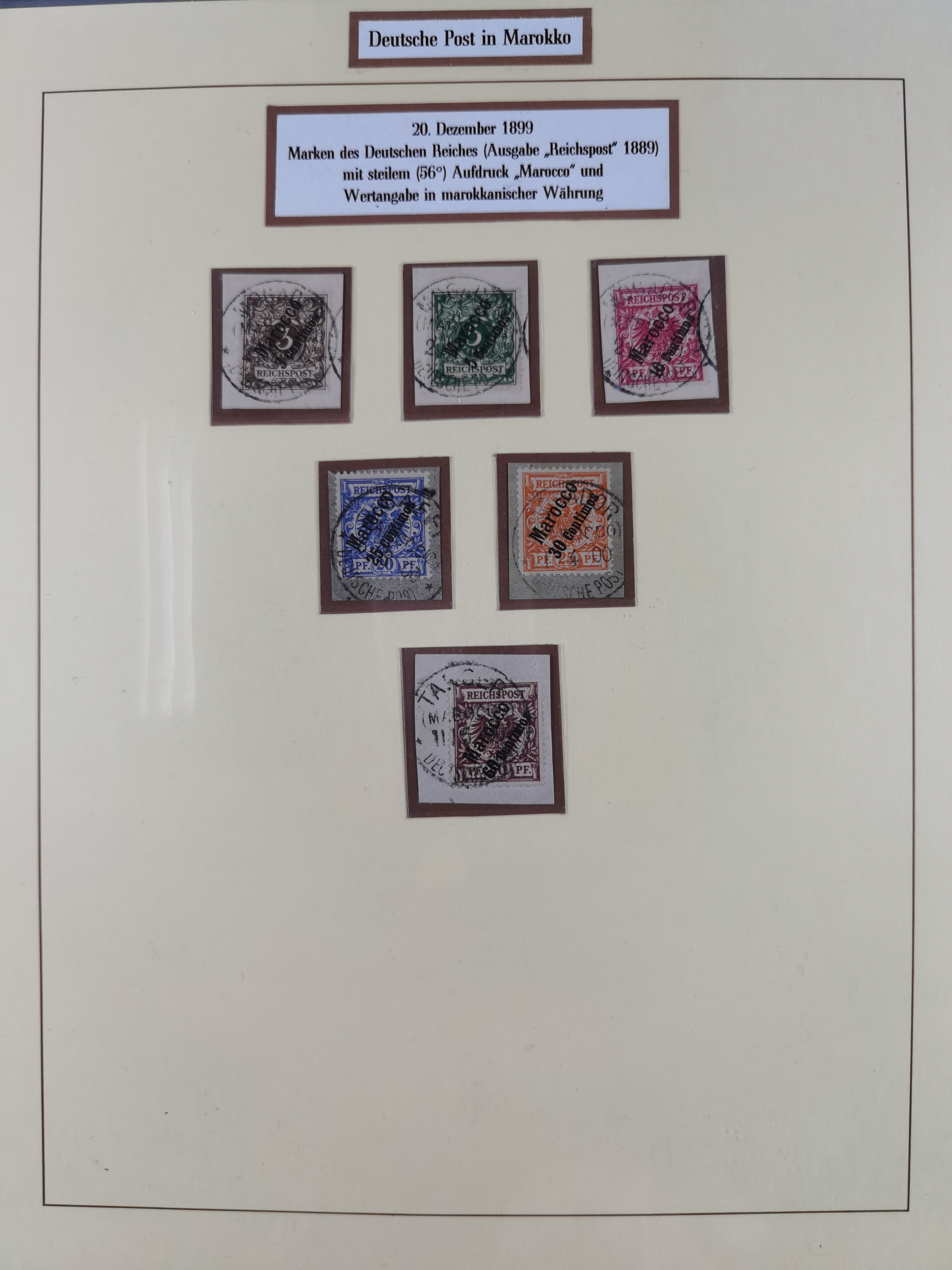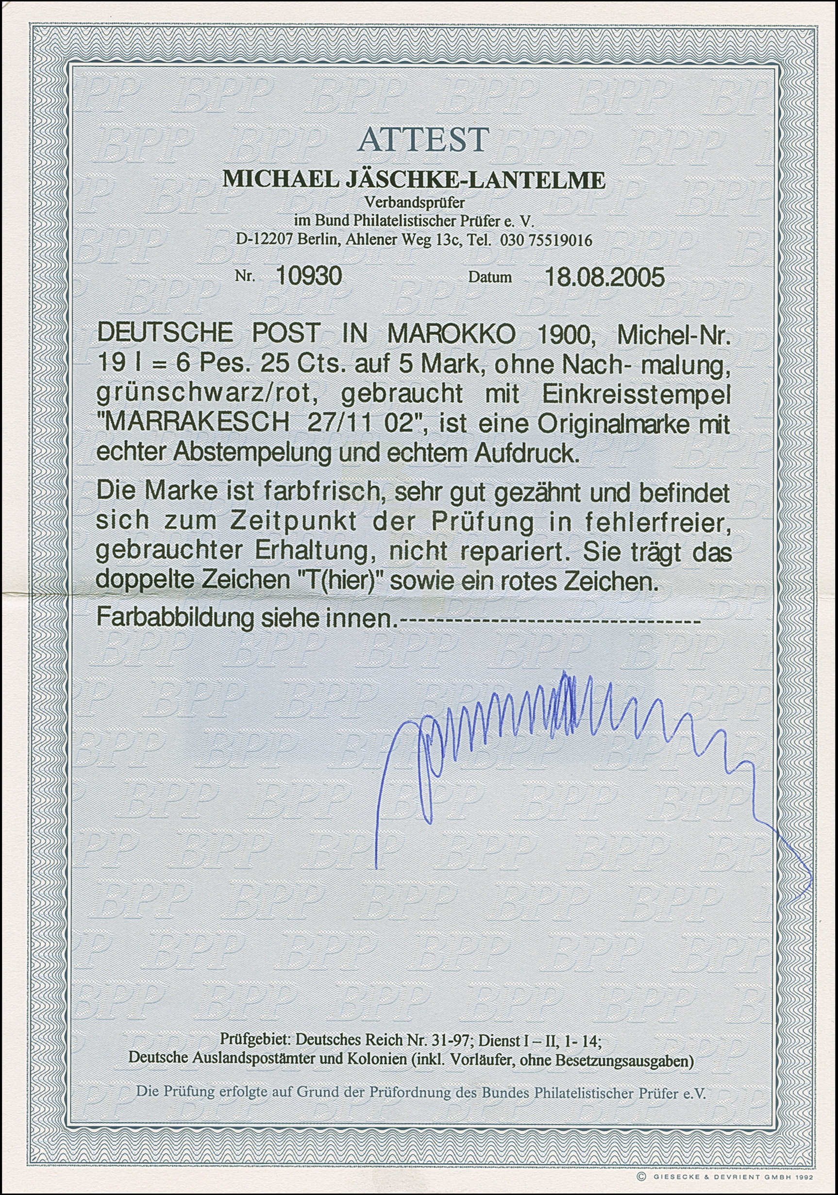 1900/03, 6 Pes. 25 cts auf Reichspost 5 M., Type I ohne Nachmalung mit Stempel “MARRAKESCH 27.11.02”, in tadelloser Erhaltung, doppelt signiert T(hier) und Fotoattest Jäschke-L. BPP (2005)