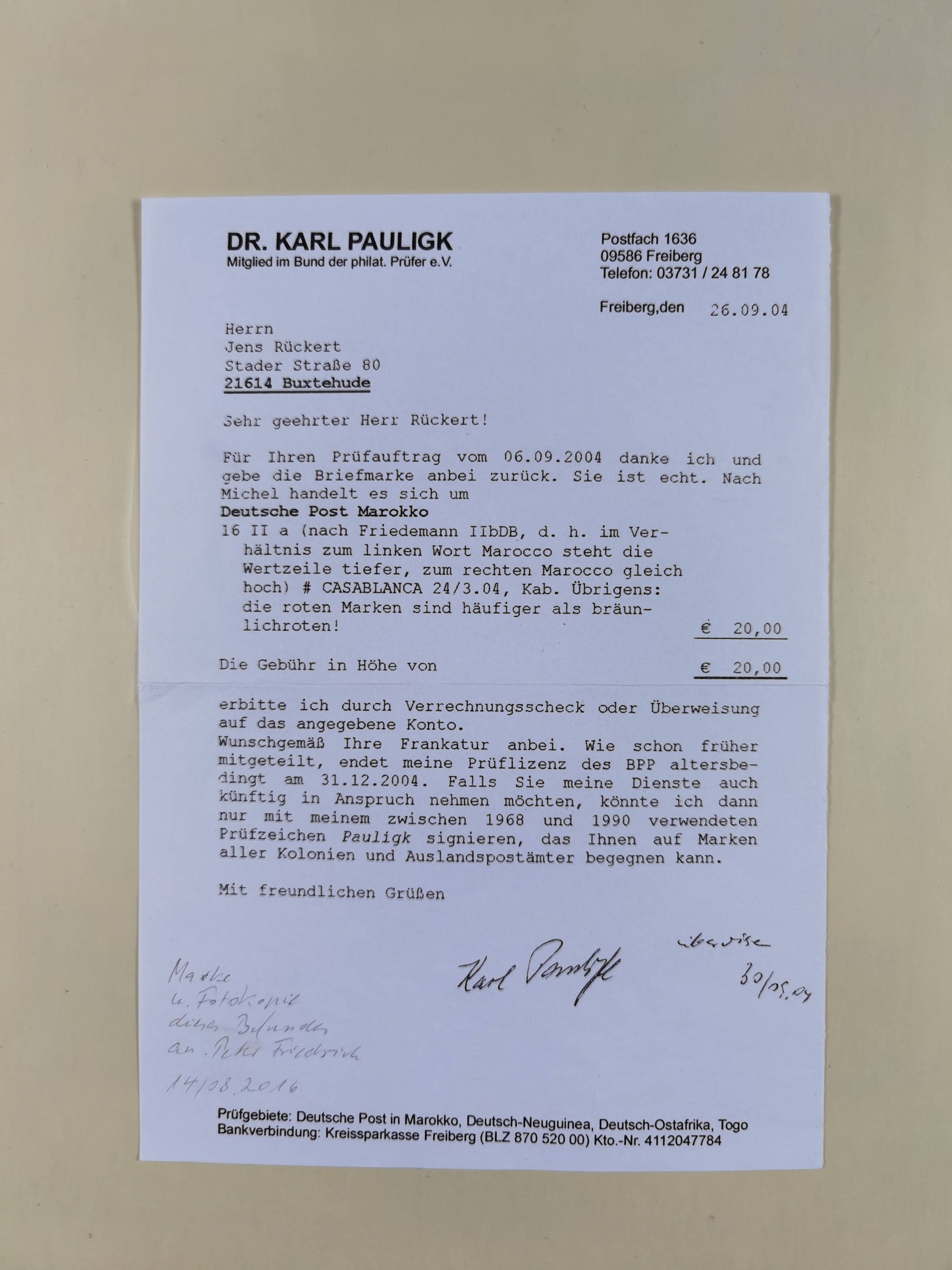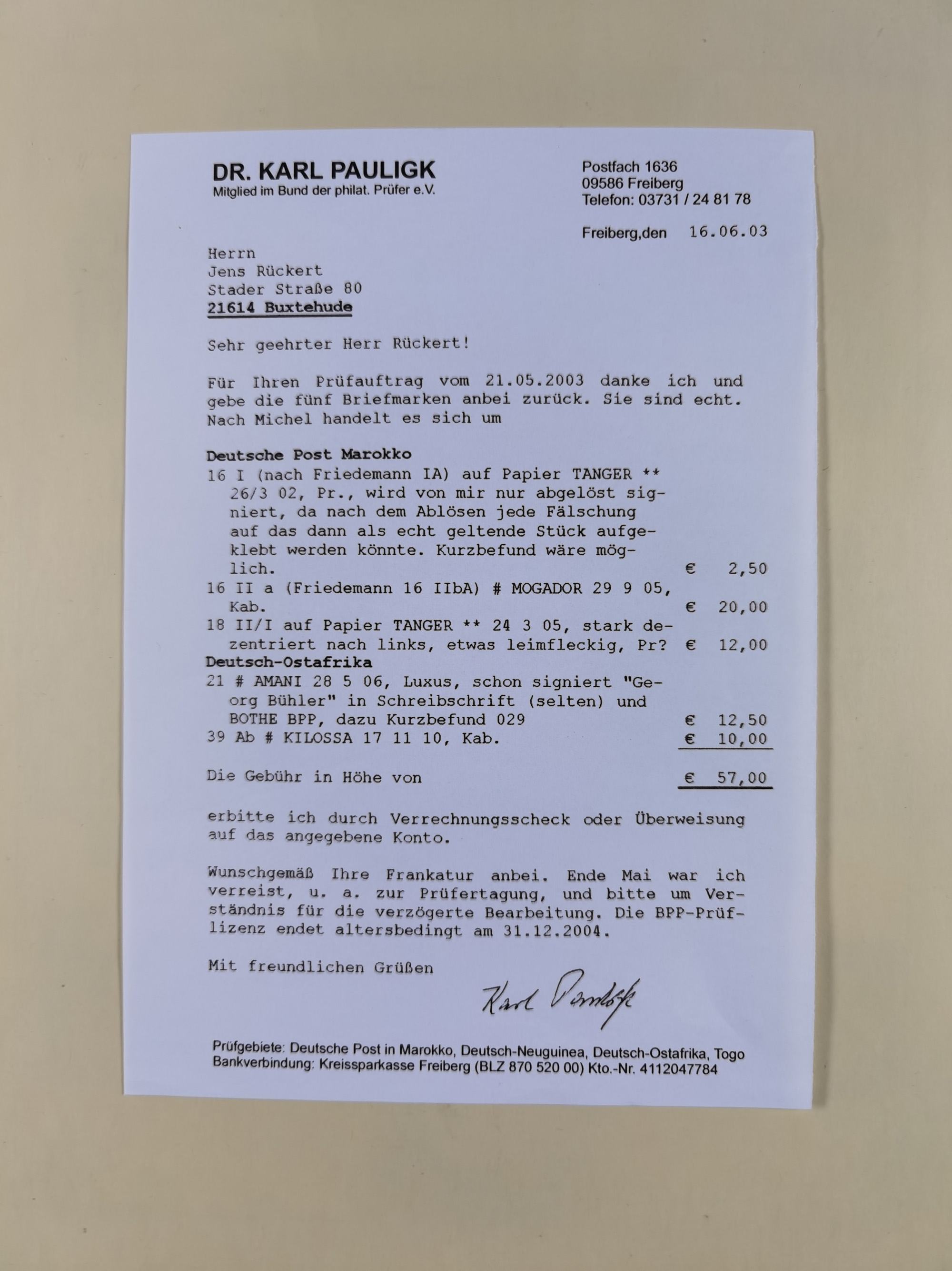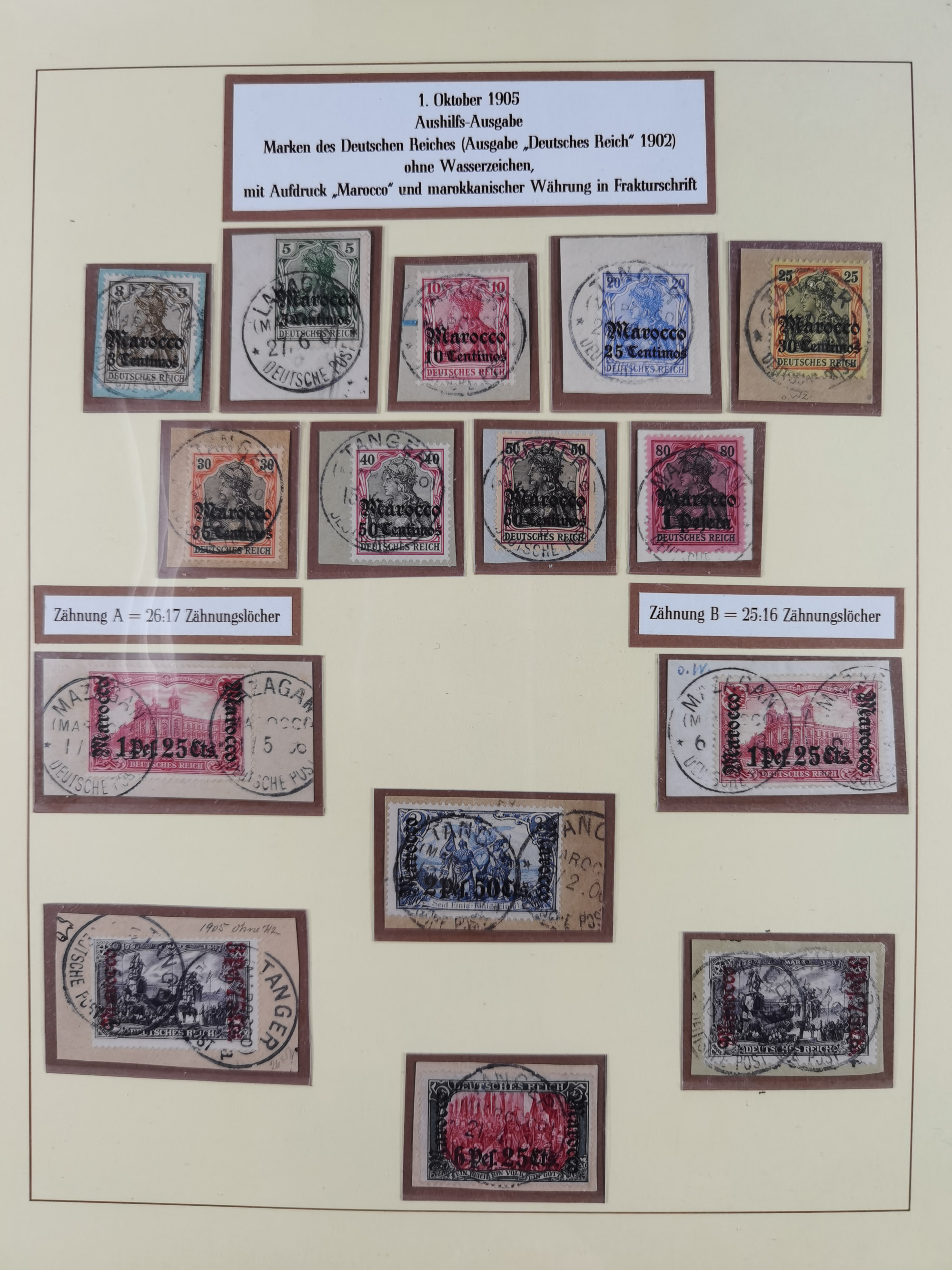 1900/03, 6 Pes. 25 cts auf Reichspost 5 M., Type I ohne Nachmalung mit Stempel “MARRAKESCH 27.11.02”, in tadelloser Erhaltung, doppelt signiert T(hier) und Fotoattest Jäschke-L. BPP (2005)