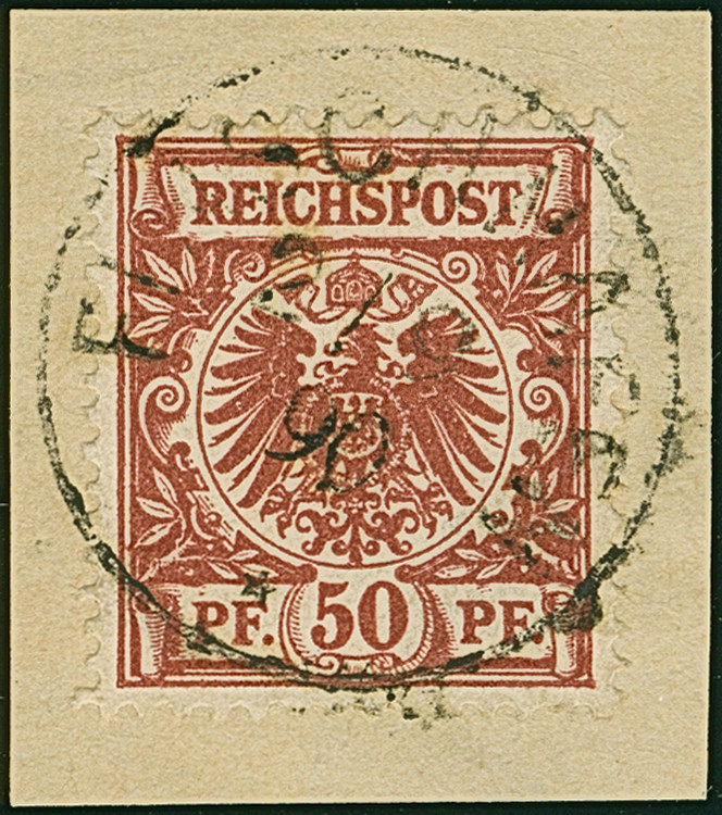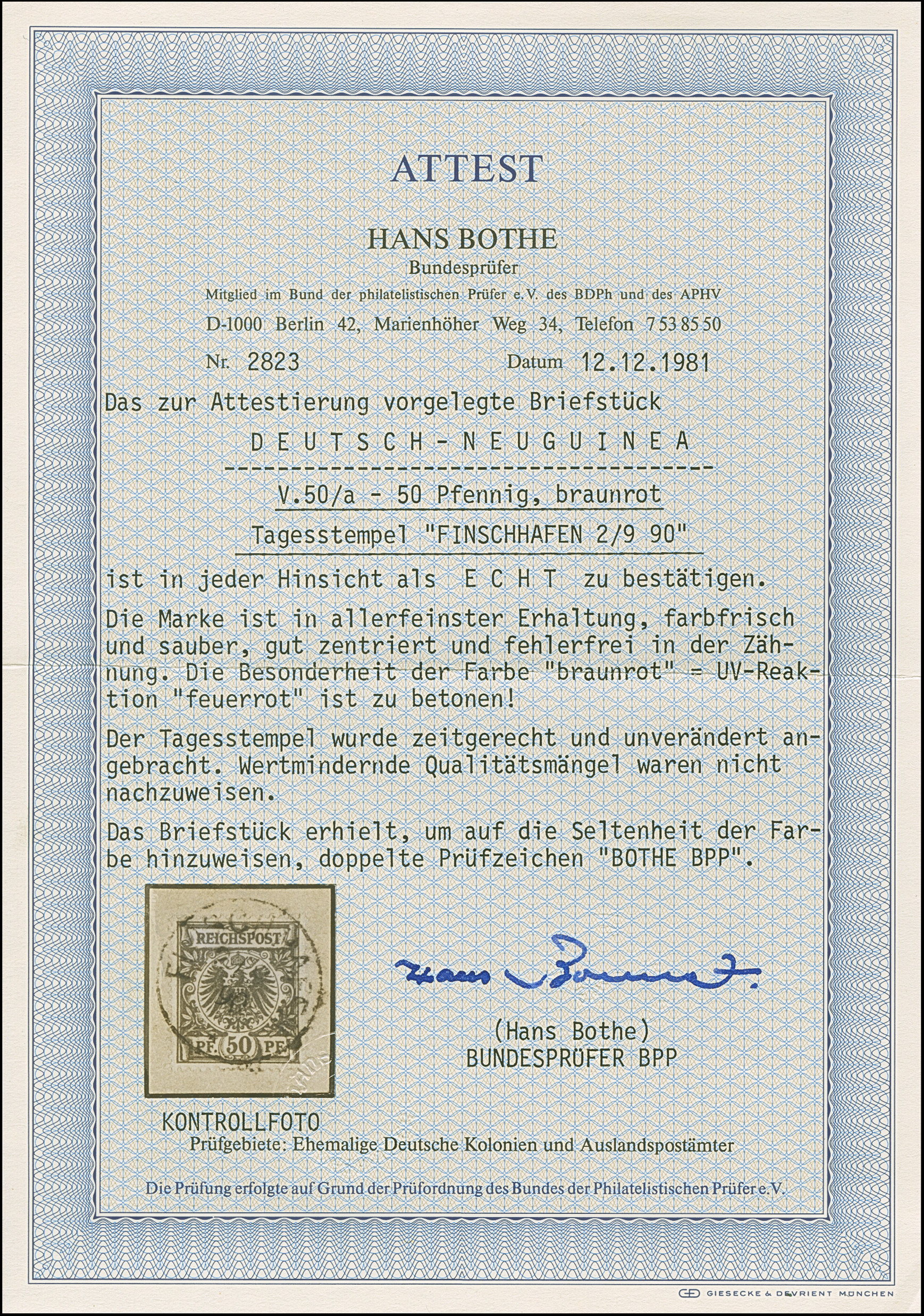 1890, Krone/Adler 50 Pfg. lebhaftbräunlichrot mit EKr. “FINSCHAFEN 2.9.90” auf Briefstück. Die Marke mit kurzem Zahn unten rechts, ansonsten in einwandfreier Erhaltung, doppelt signiert Bothe BPP mit Fotoattest (1981)