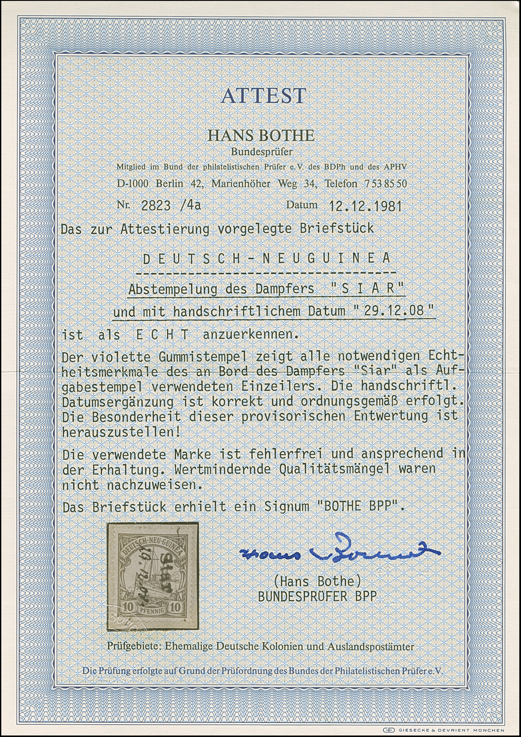 “Siar”, violetter L1 mit handschriftlichem Datum “29.12.08” auf Kaiseryacht 10 Pfg. auf Briefstück, in einwandfreier Erhaltung. Recht seltene Entwertung von den Inselfahrten, signiert Bothe BPP mit Fotoattest (1981)