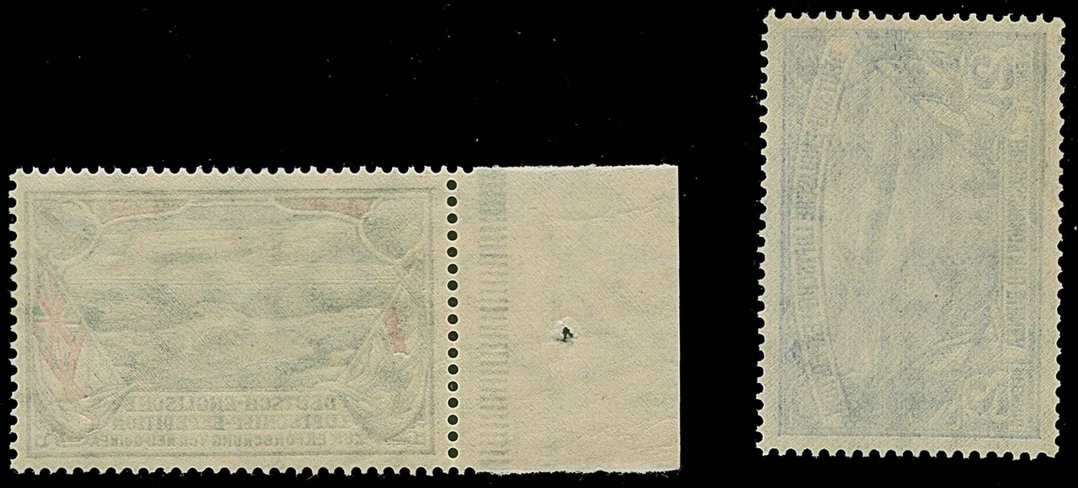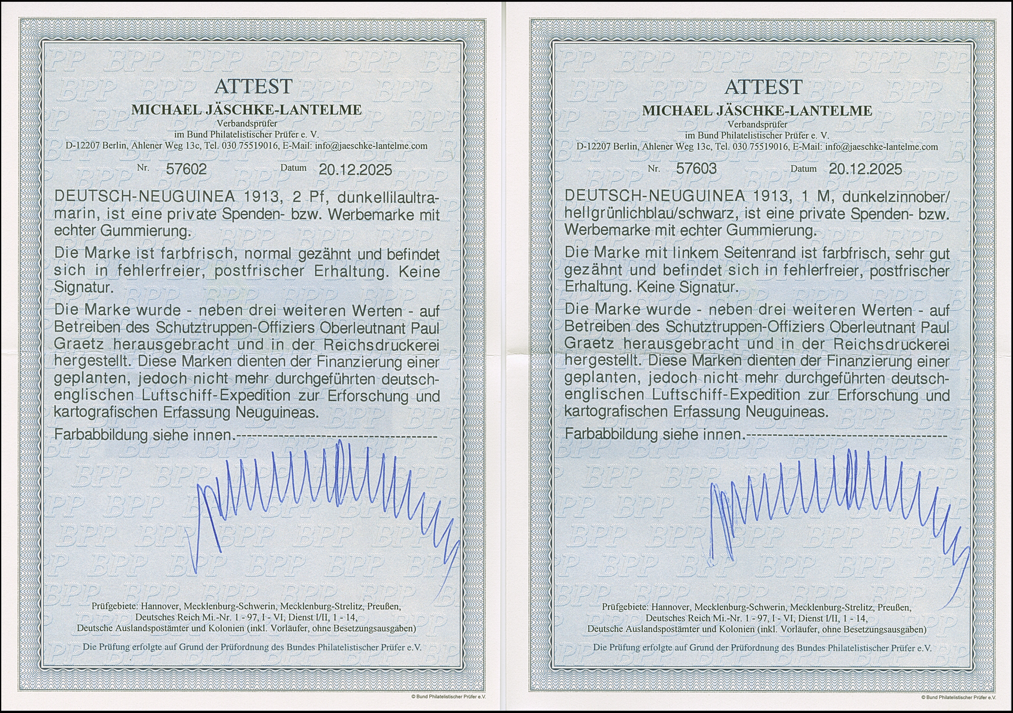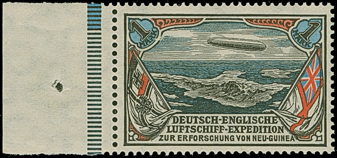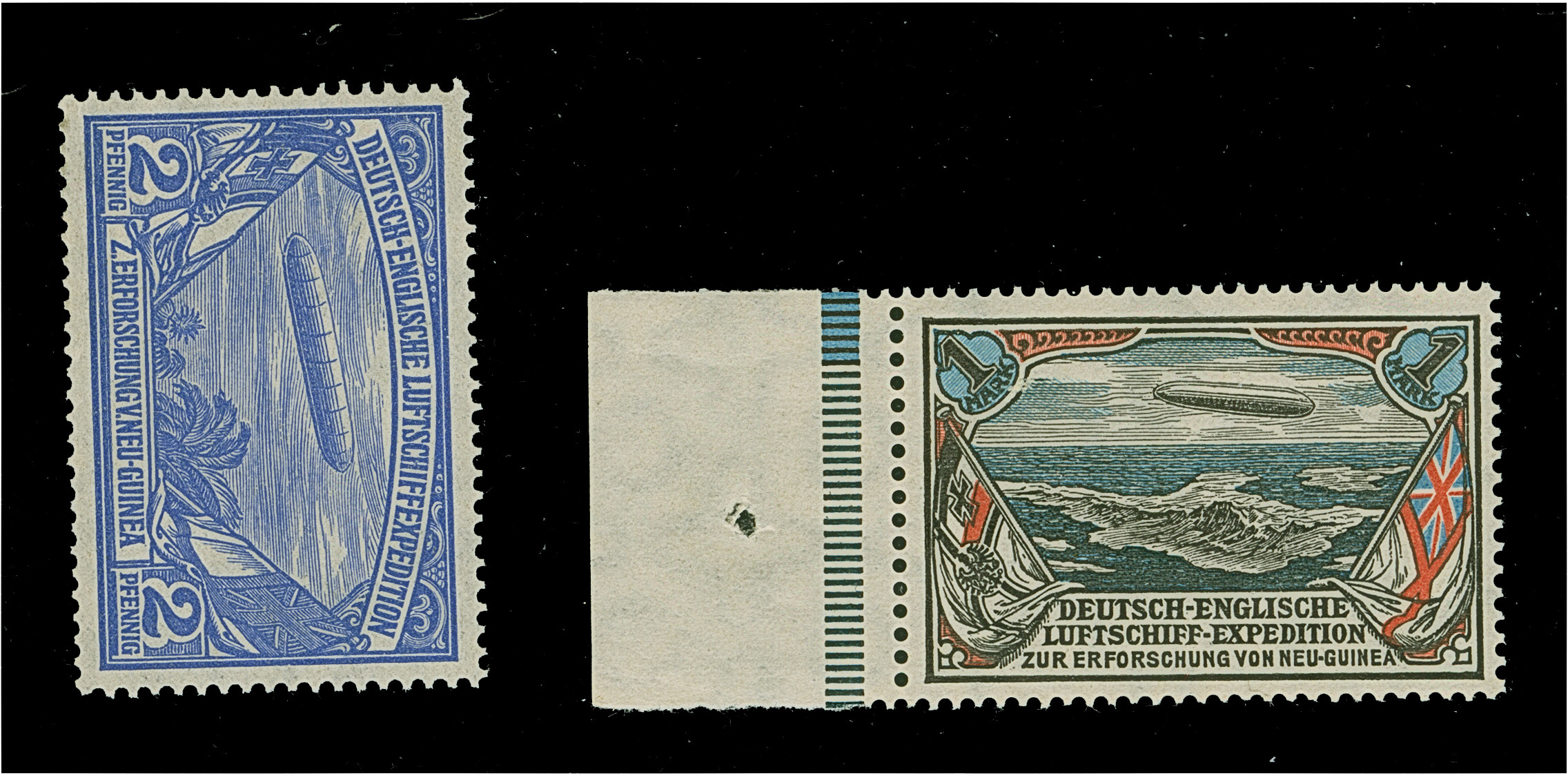 Deutsch-Englische Luftschiff-Expedition zur Erforschung von Neu-Guinea: 1913, private Spenden-Vignette 2 Pfg. dunkelultramarin und 1 M. dunkelzinnober/hellgrünlichblau/schwarz mit Bogenrand links, postfrisch und tadellos, unsigniert, je Fotoattest Jäschke-L. BPP (2025)