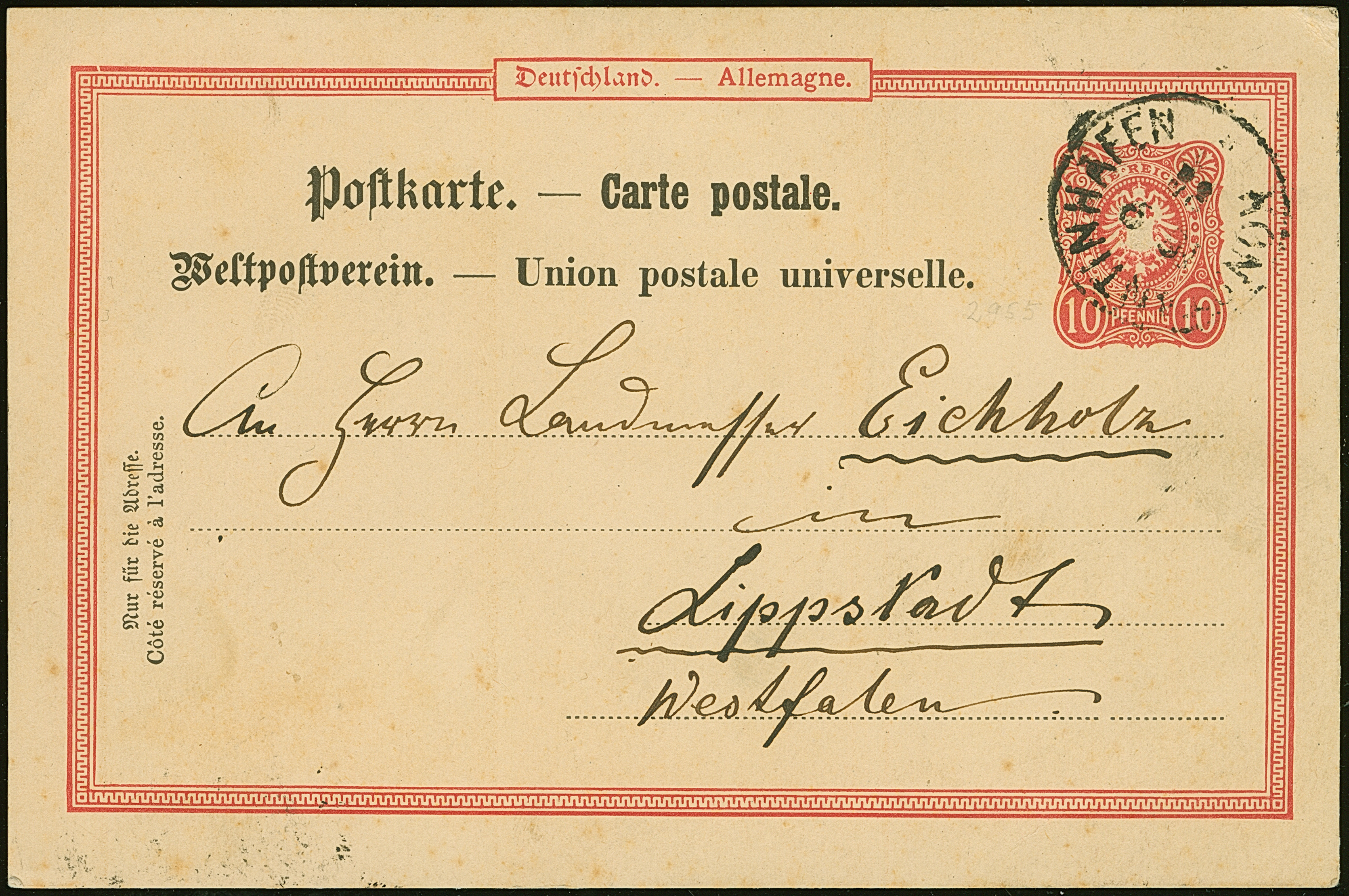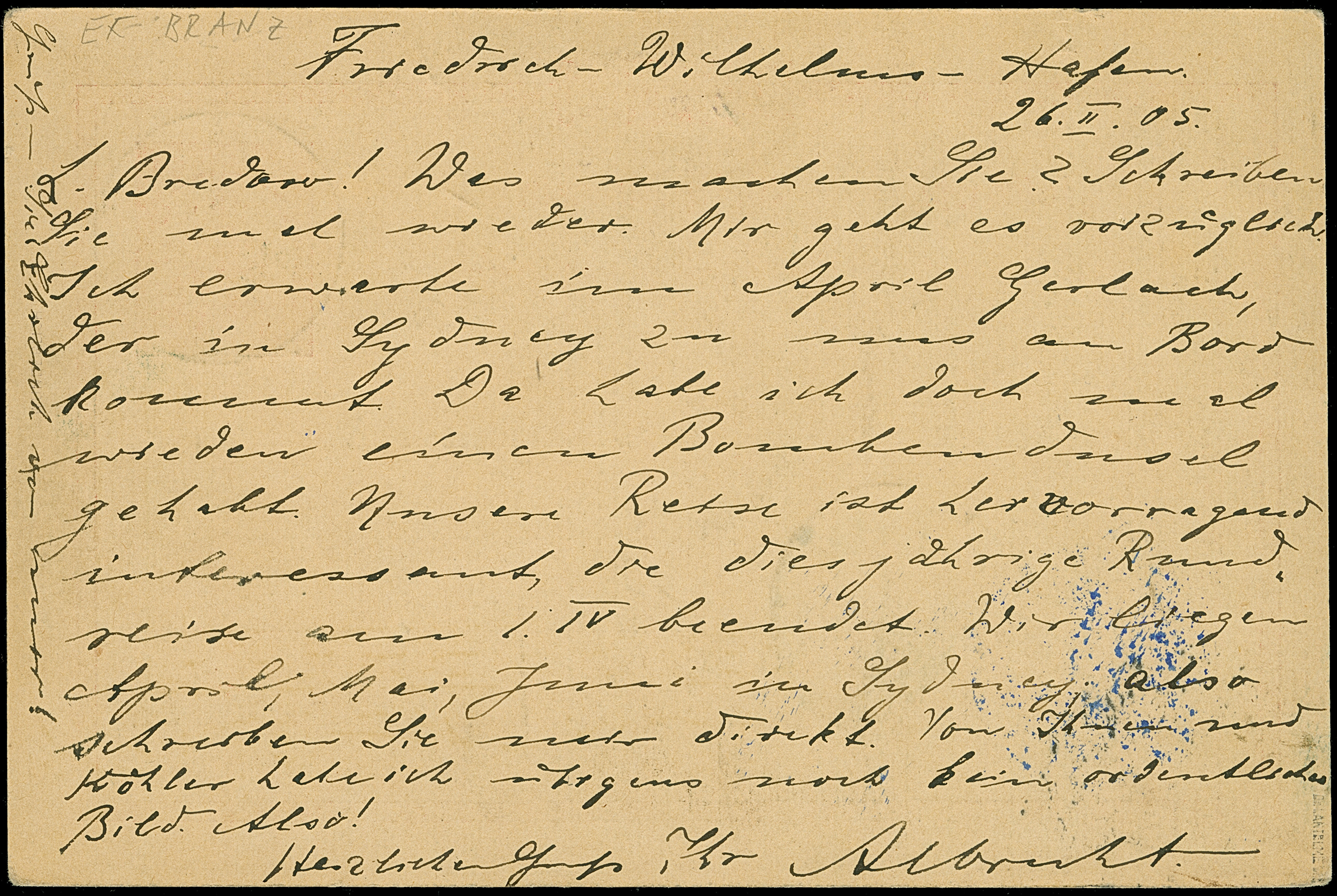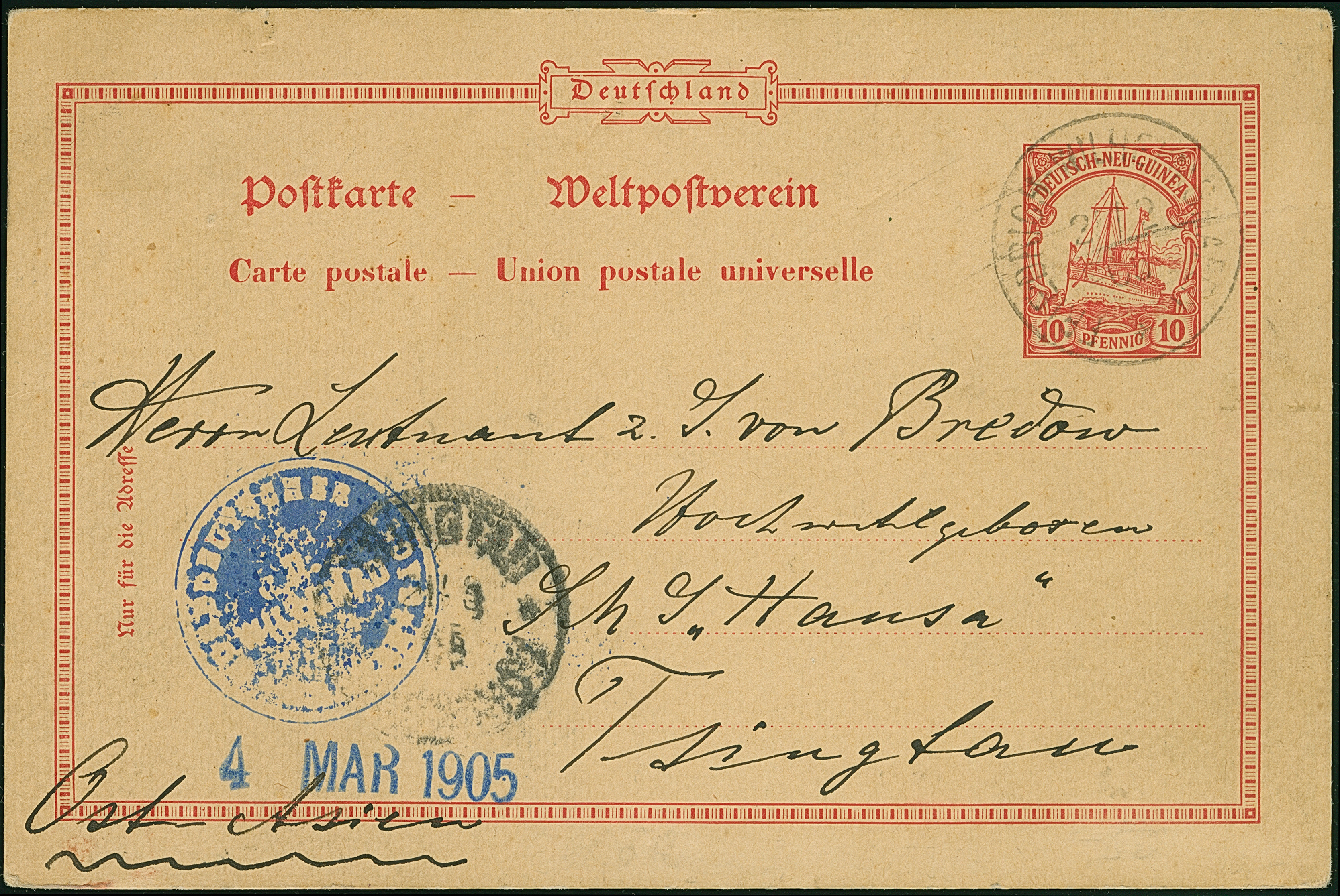 “NORDDEUTSCHER LLOYD BREMEN D. WILLEHAD”, violetter Dienstsiegel mit Datums-L1 “4 MAR 1905” als Übernahmestempel auf DNG Ganzsachenkarte Kaiseryacht 10 Pfg. mit Stempel “FRIEDRICH-WILHELMSHAFEN 27.2.05” an den Leutnant von Bredow auf der SMS Hansa in Tsingtau, in guter Erhaltung. In dieser Kombination ein außergewöhnlicher Beleg aus dem Bedarf, signiert Dr. Lantelme BPP