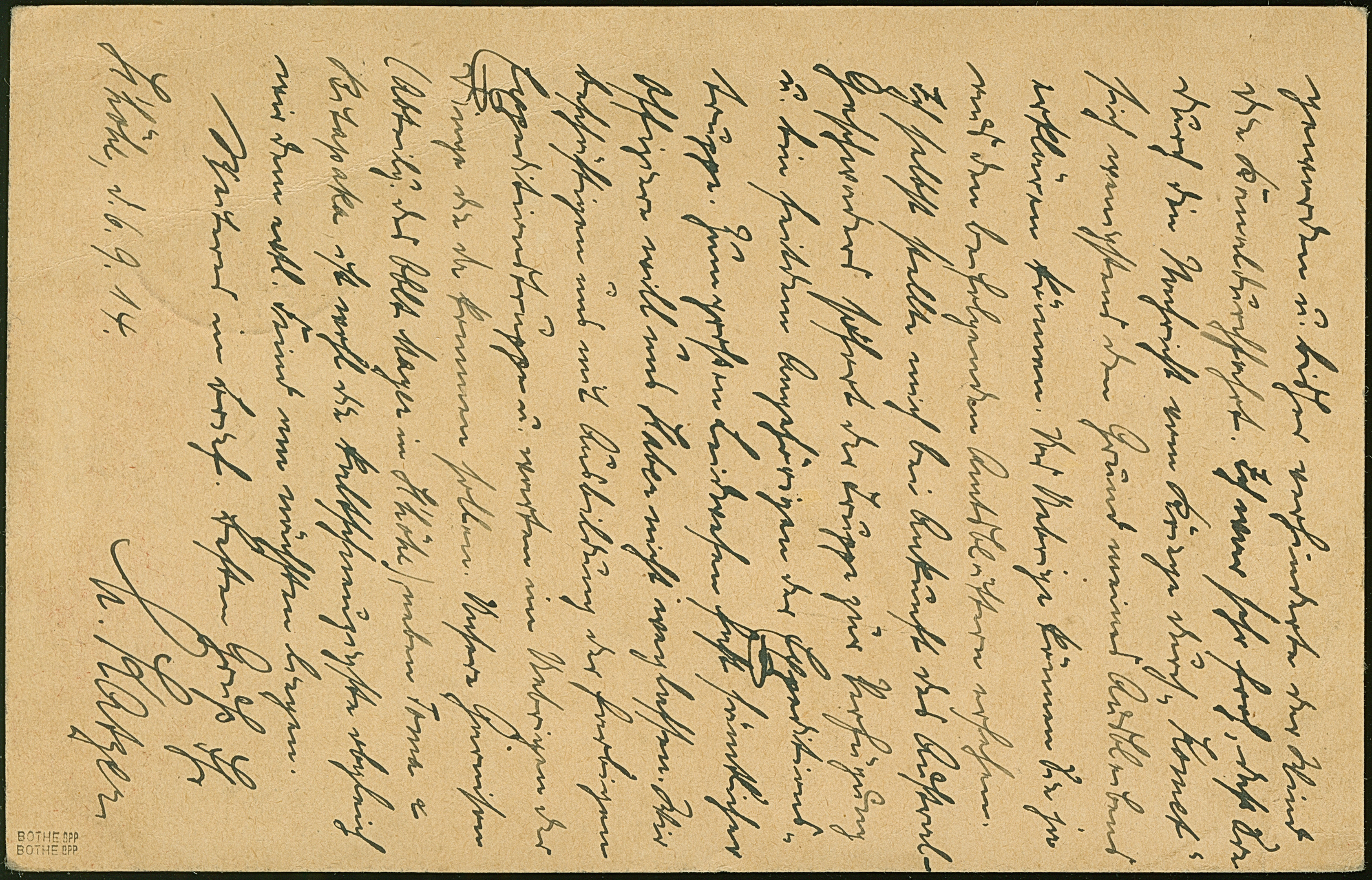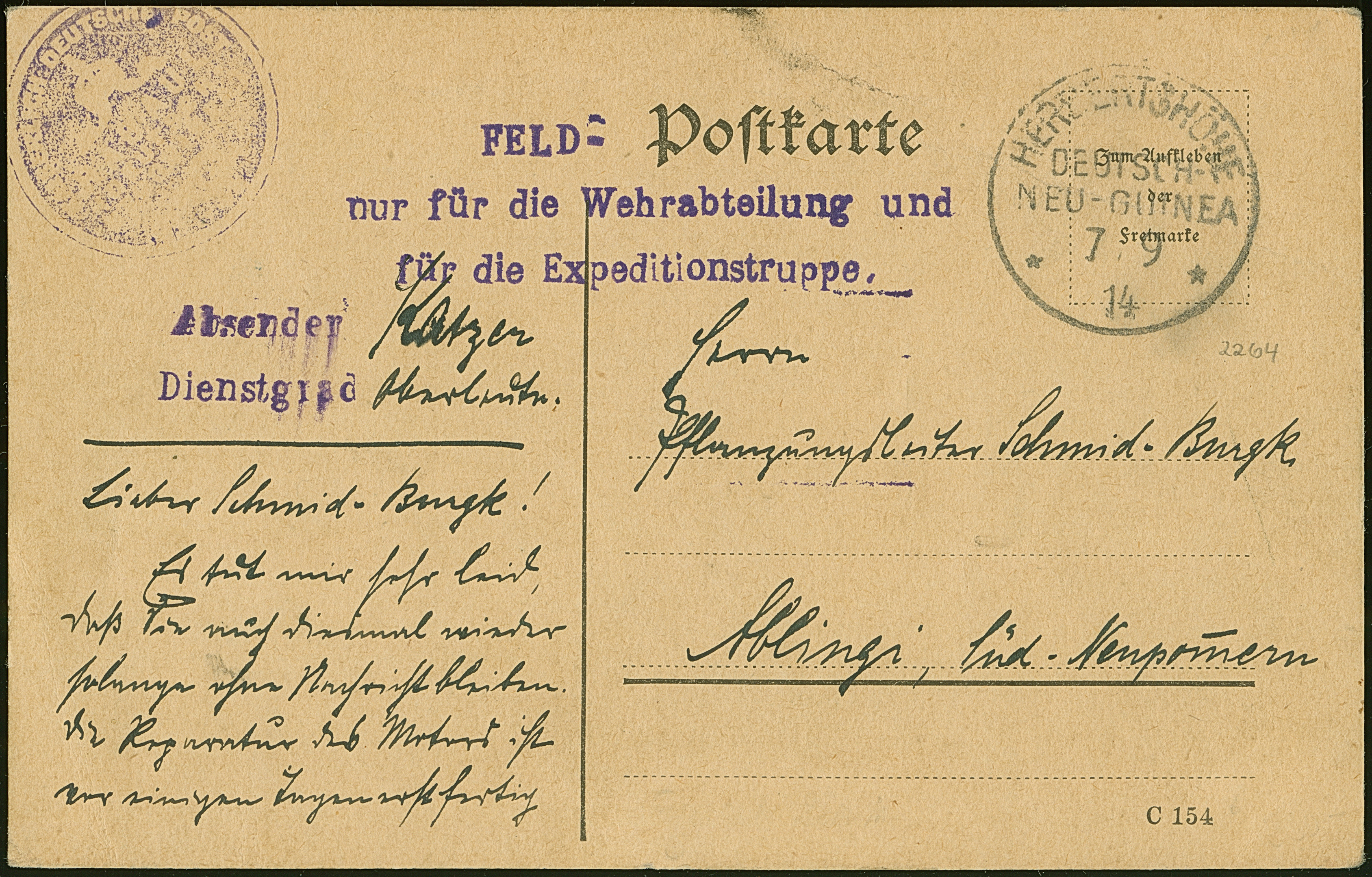 Kriegspost: 1914, amtlich verausgabte Feldpostkarte “FELD- nur für die Wehrabteilung und für die Expeditionstruppe” und violettem Dienstsiegel von Rabaul, bedarfsgebraucht von “HERBERTSHÖHE DNG 7.9.14” mit sehr viel Text nach Ablingi, Süd-Neupommern. Die Karte rechts oben mit diagonalem Bug, ansonsten in guter Erhaltung. Bedarfsgebrauchte Feldpostkarten in dieser Art sind innerhalb von DNG bisher in nur wenigen Exemplaren bekannt, eine große Seltenheit aus Deutsch-Neuguinea während des 1. Weltkrieges, doppelt signiert Bothe BPP