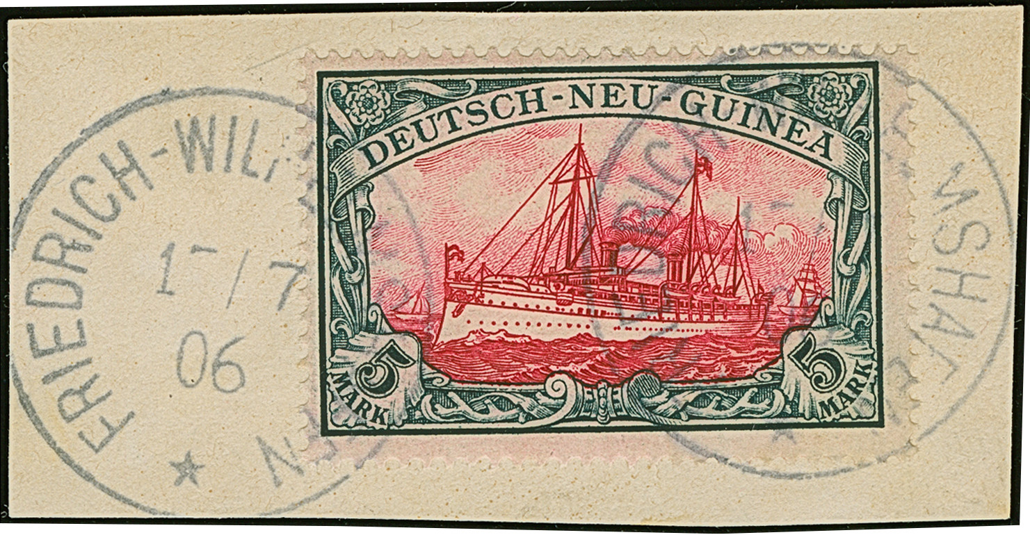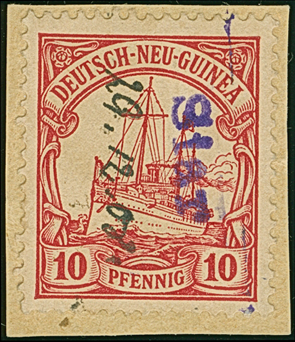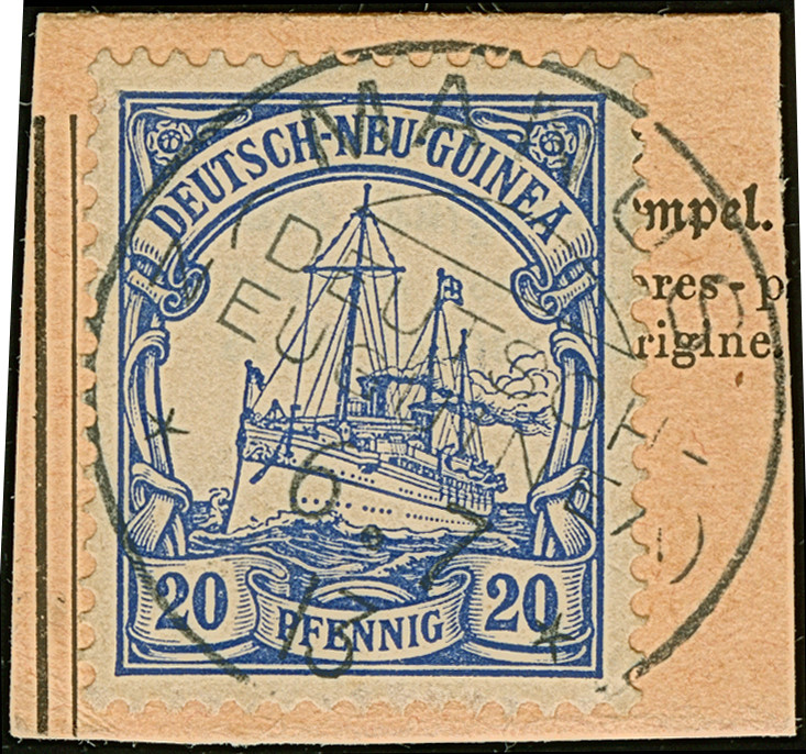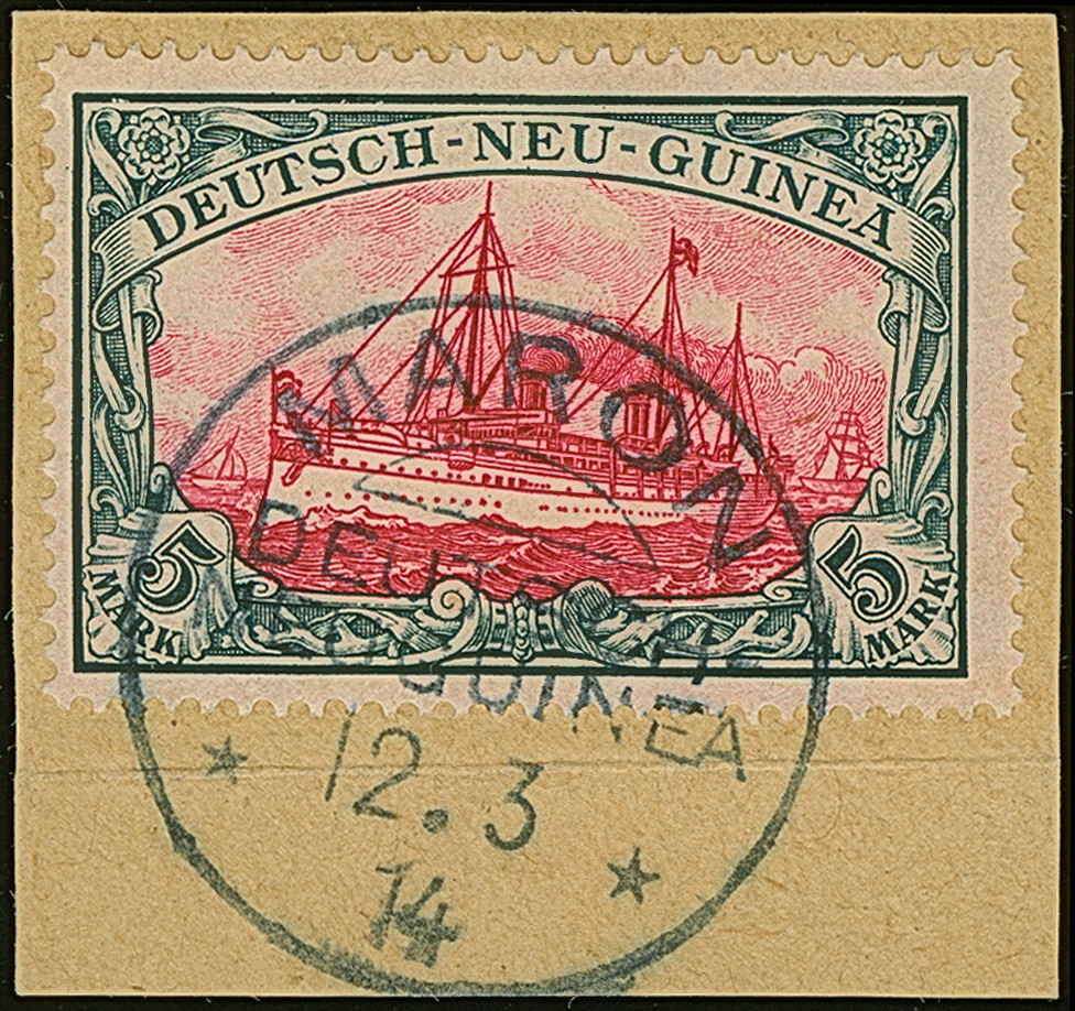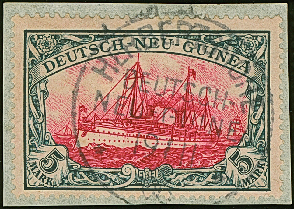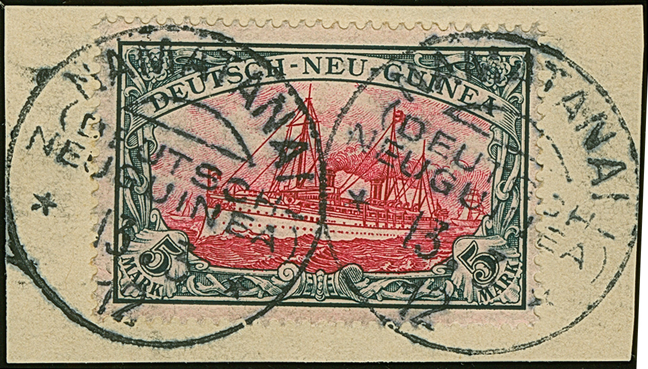 “NAMATANAI (DNG) 13.3.12” zweimal klar auf Kaiseryacht 5 M. auf Briefstück, in einwandfreier Erhaltung. Ein schönes Exemplar mit besserem Stempel, sign. Dr. Lantelme BPP mit Fotoattest (1991)