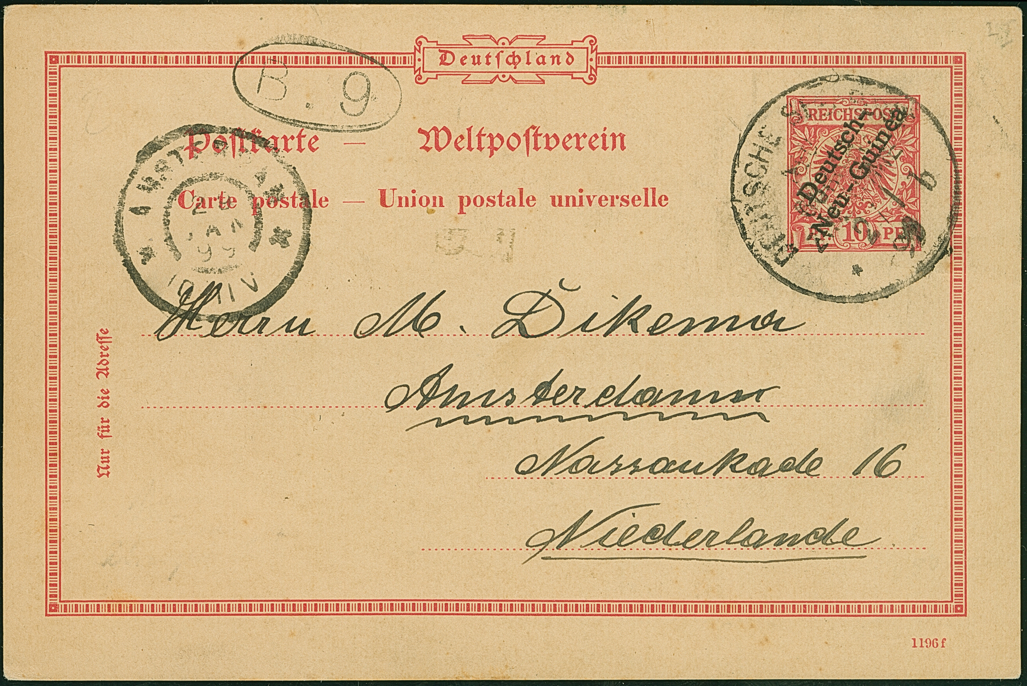“DSP NEU-GUINEA ZWEIGLINIE *b 2.1.99” (Dampfer Stettin) recht klar auf Aufdruck-Ganzsachenkarte 10 Pfg. mit Text mit Datierung “Berlinhafen  13/XII.98” nach Amsterdam mit vorderseitigem Ankunftsstempel, in guter Erhaltung