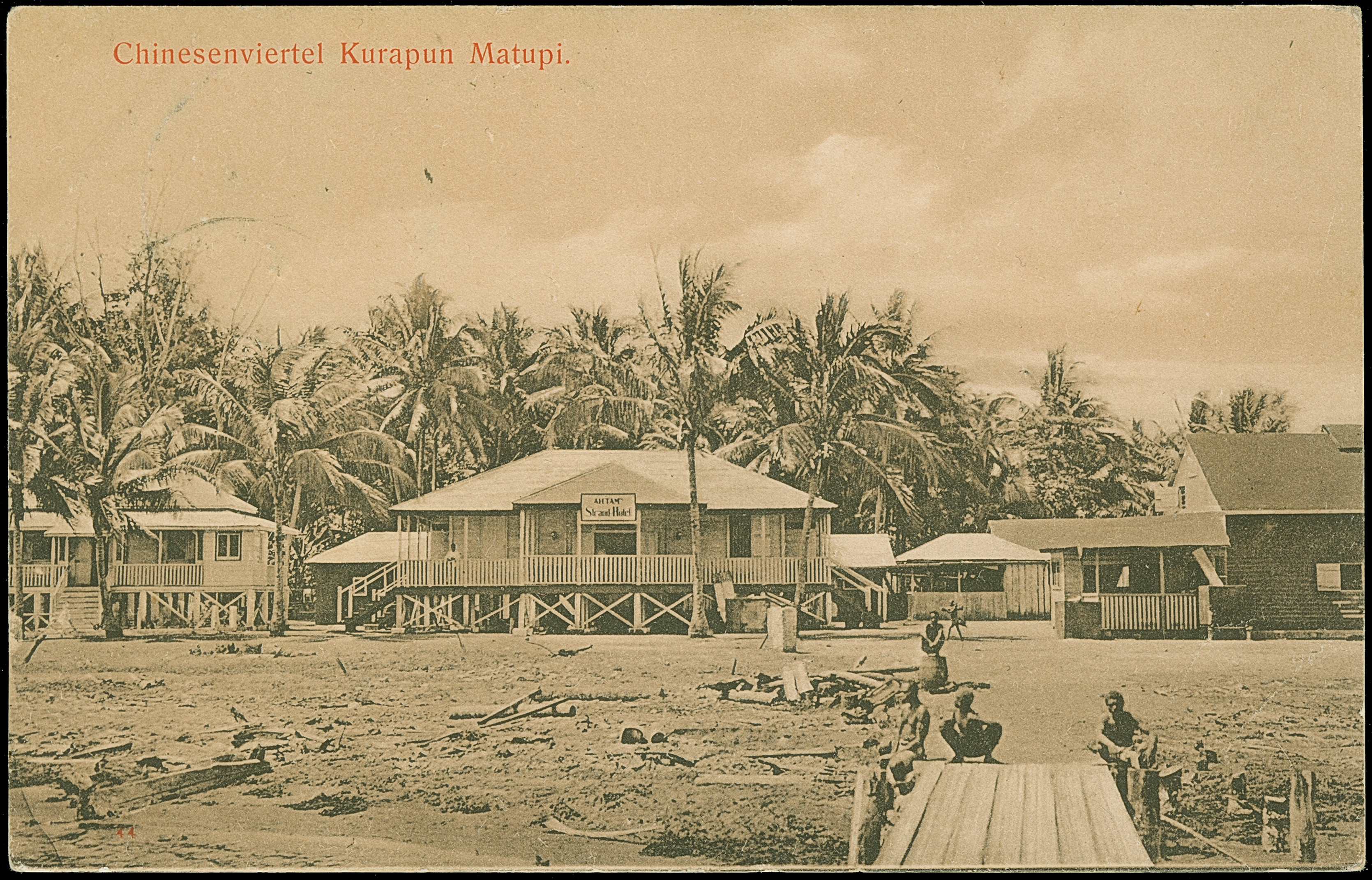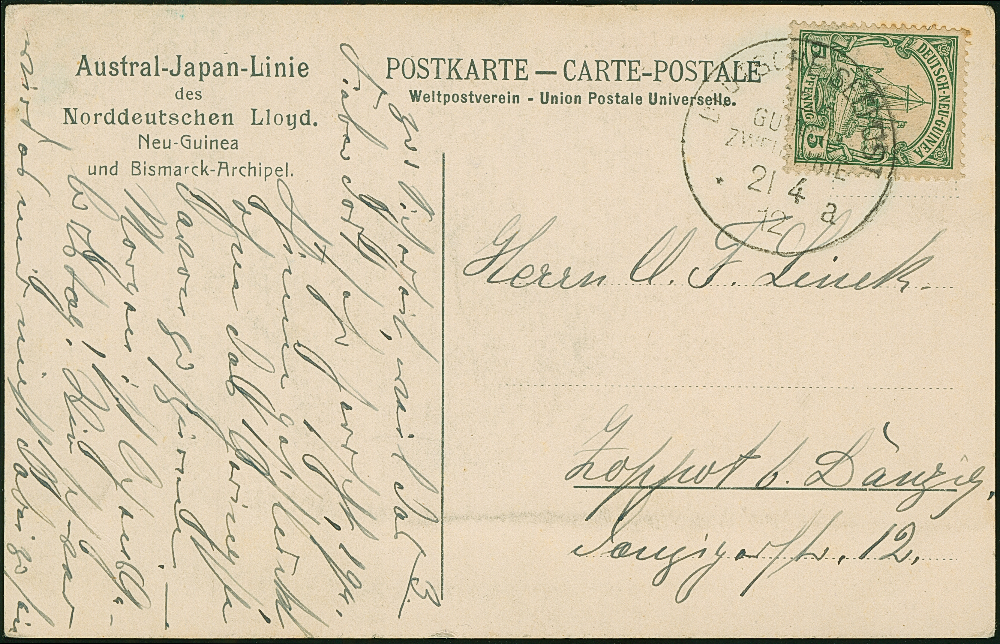 “DSP NEU-GUINEA ZWEIGLINIE *a 21.4.12” (Dampfer Coblenz) sehr klar auf Kaiseryacht 5 Pfg. auf Vordruck-Ansichtskarte “Chinesenviertel Kurapun Matupi” der Austral.-Japan-Linie" mit Text nach Zoppot, in guter Erhaltung