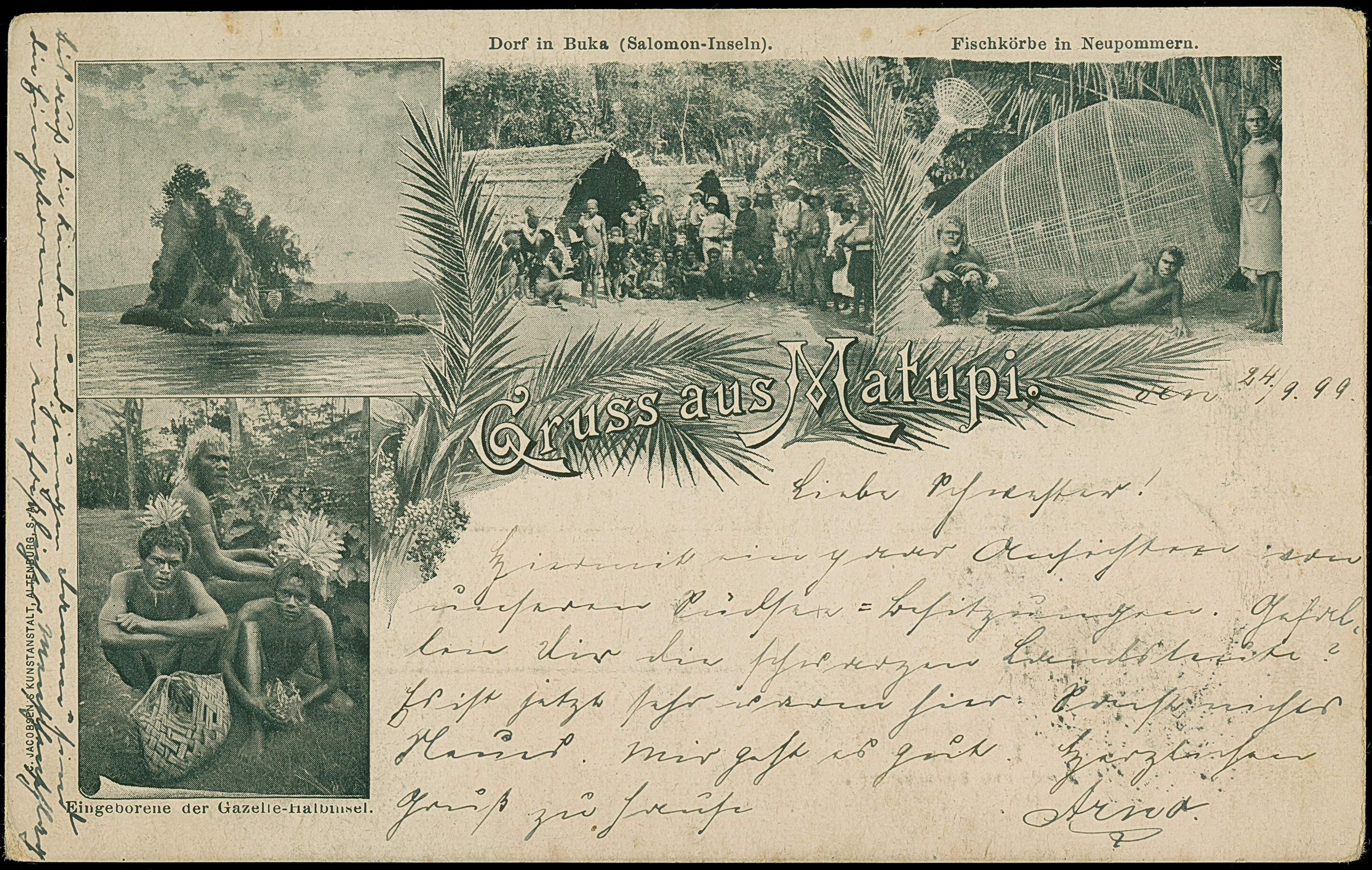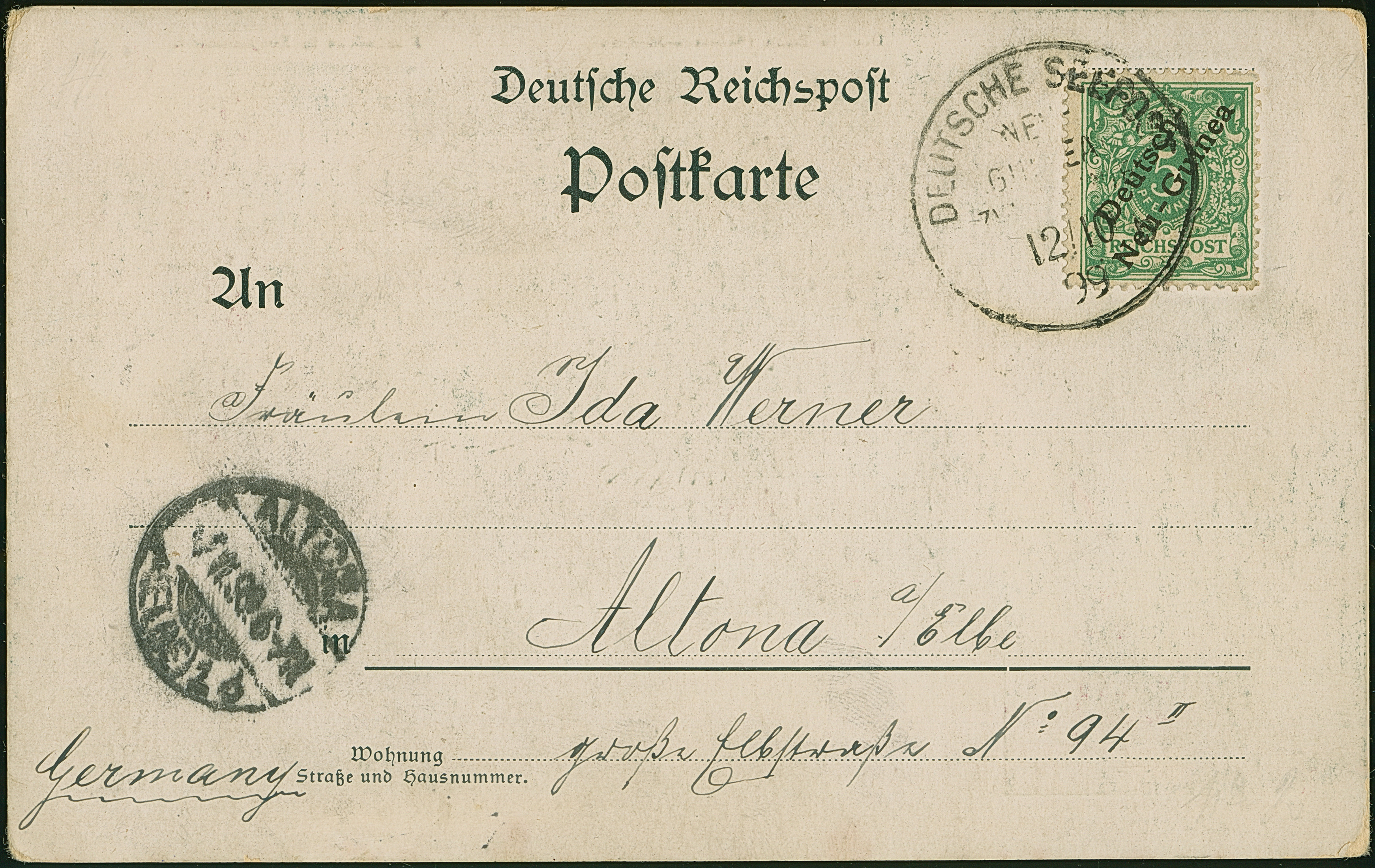 “DSP NEU-GUINEA-ZWEIGLINIE *b 12.10.99” (Dampfer Stettin) recht klar auf Ausgabe 1897 5 Pfg. auf Ansichtskarte “Gruss aus Matupi” mit viel Text nach Altona mit vorderseitigem Ankunftsstempel, in guter Erhaltung