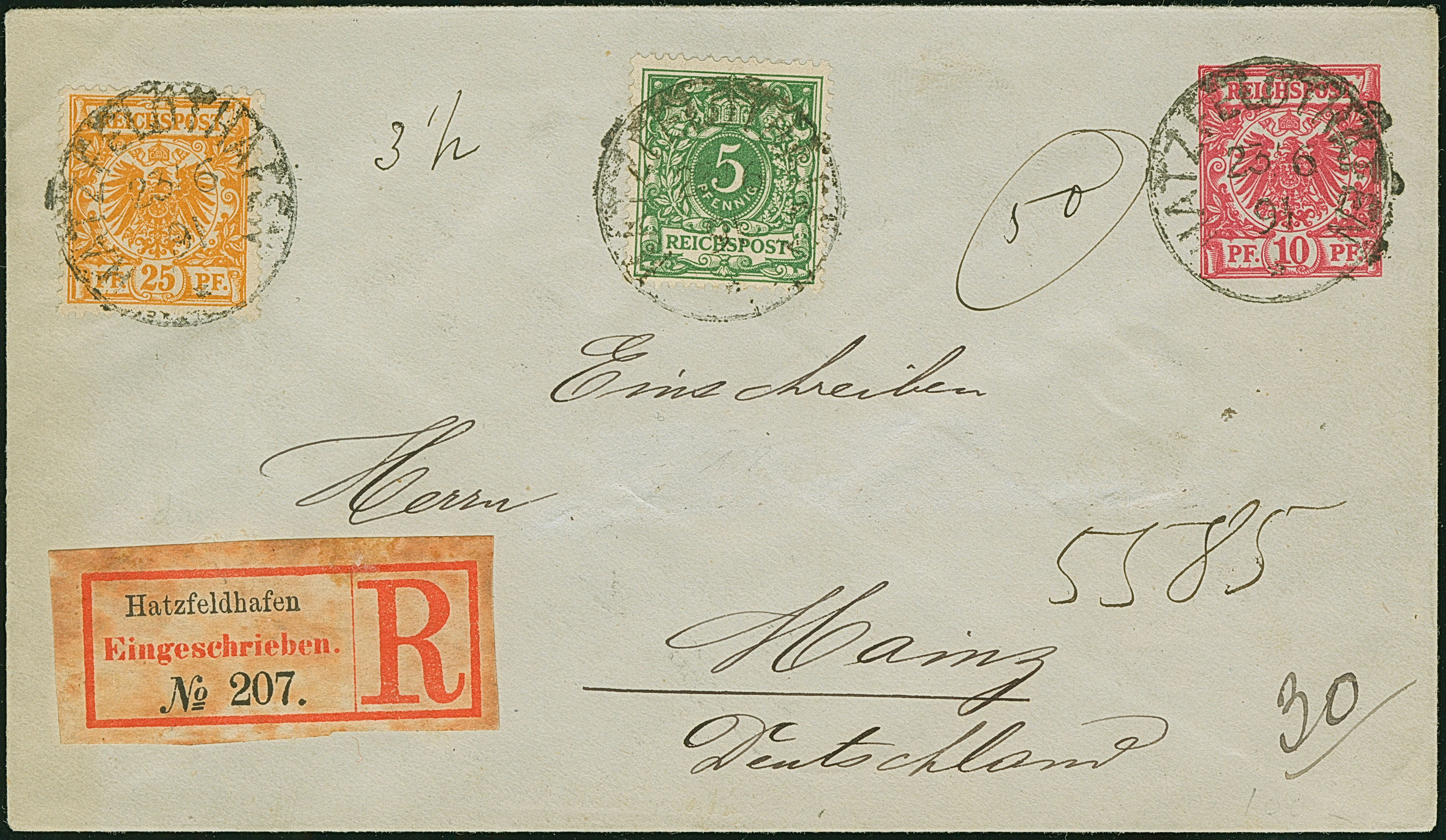 1890, Krone/Adler 25 Pfg. gelborange und 5 Pfg. gelblichgrün je mit Stempel “HATZFELDTHAFEN 23.6.91” als tarifgerechte Zufrankatur auf Ganzsachenumschlag 10 Pfg. als R-Brief mit geschnittenem R-Zettel “Hatzfeldhafen” via Soerabaija und Weltevreden nach Mainz mit Ausgabestempel. Teil der Adresse radiert (Roesner), ansonsten in sehr guter Erhaltung. Briefe mit dieser Entwertung sind sehr selten