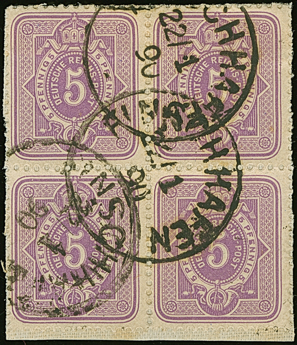 1888, 5 Pfg. violettpurpur im angetrennten Viererblock mit Stempel “FINSCHHAFEN 22.1.90” auf Briefstück. Die farbfrischen Marken sind gut gezähnt, die rechte obere Marke mit Druckstelle, ansonsten trotz Randklebung in einwandfreier Erhaltung, sign. Grobe und Bothe BPP