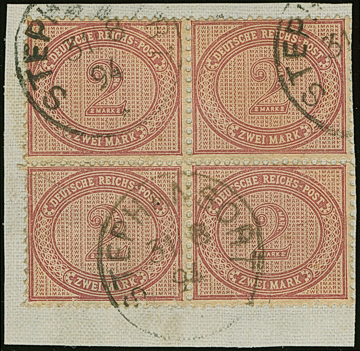 1890, 2 M. dunkelrotkarmin im angetrennten Viererblock mit Stempel “STEPHANSORT 31.8.94” auf Briefstück. Die linke untere Marke mit Einriss und wie die rechte untere Marke mit Randkerben, die beiden oberen Marken sind in einwandfreier Erhaltung. Trotz der Einschränkungen ein nicht häufiger Viererblock, sign. Bothe BPP