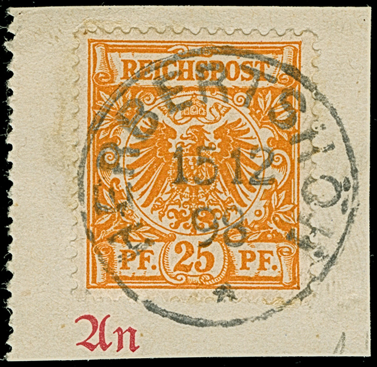 1890, Krone/Adler 25 Pfg. gelblichorange mit sehr klarem Stempel “HERBERTSHÖH * 15.12.98” auf Briefstück, in einwandfreier Erhaltung, sign. Bothe BPP