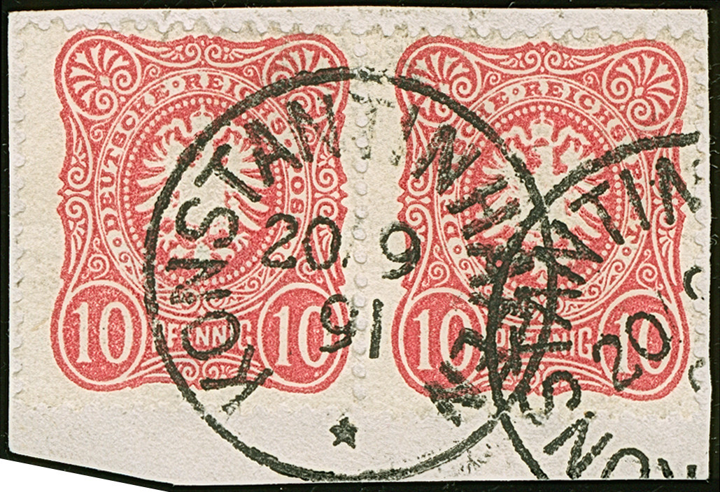 “KONSTANTINHAFEN 20.9.91” sehr klar auf waagerechtem Paar Vorläufer-Ausgabe 1888 10 Pfg. dunkelrosarot auf Briefstück. Die farbfrischen Marken sind oben etwas unregelmäßig gezähnt und in einwandfreier Erhaltung. Eine auf dieser Ausgabe seltene Entwertung, doppelt sign. Dr. Steuer BPP