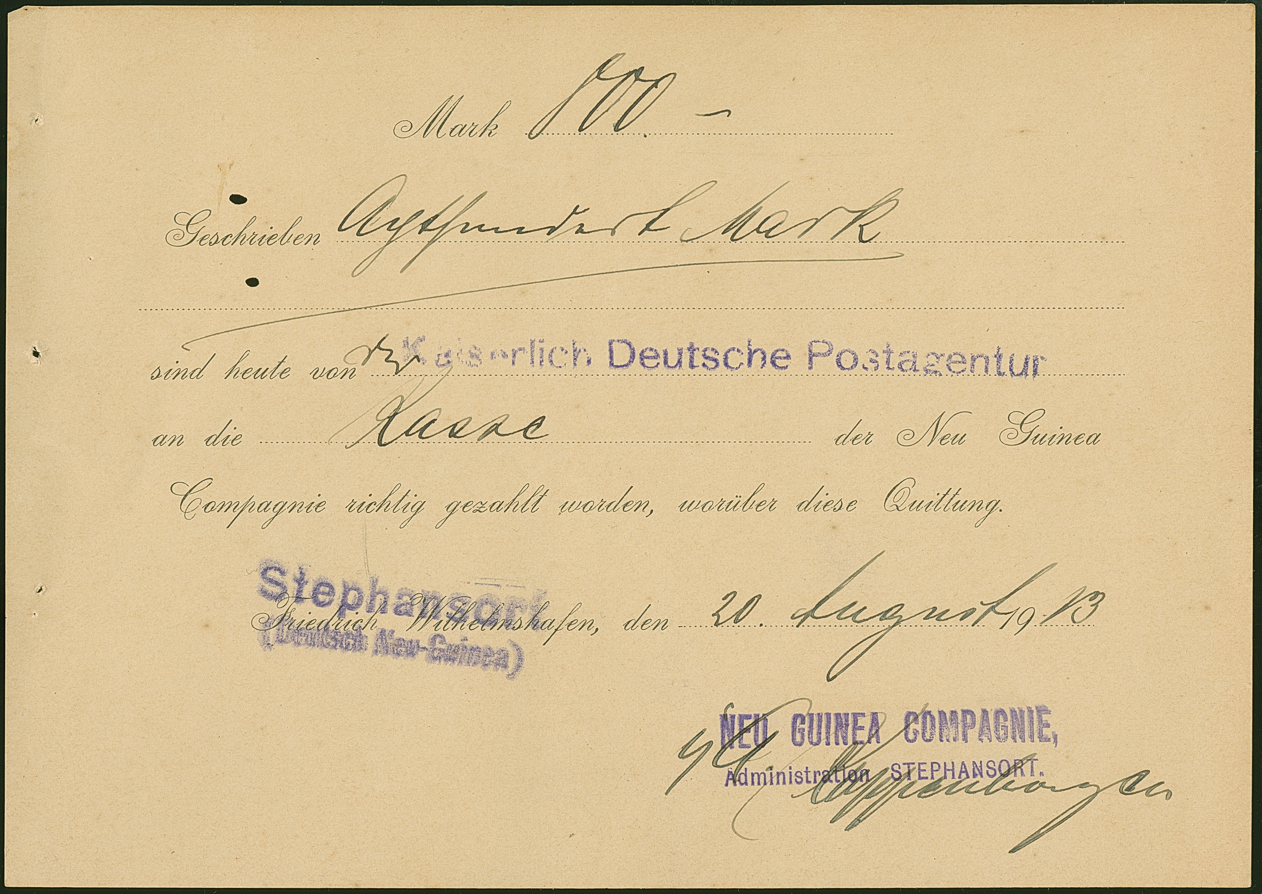1913, Vordruck-Quittung der Kaiserlich Deutsche Postangentur über 800 M. mit violettem L2 “Stephansort (Deutsch-New-Guinea)” auf Vordruck “Friedrich Wilhelmshafen” und zweitem L2 “NEU GUINEA COMPAGNIE Administratten STEPHANSORT” mit Unterschrift, in guter Erhaltung