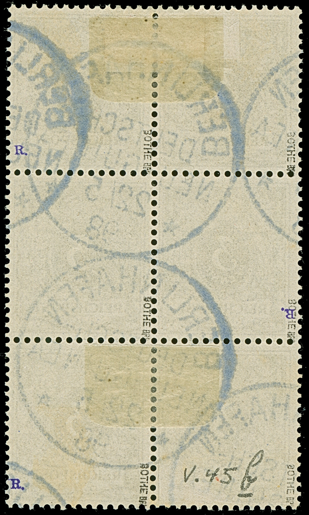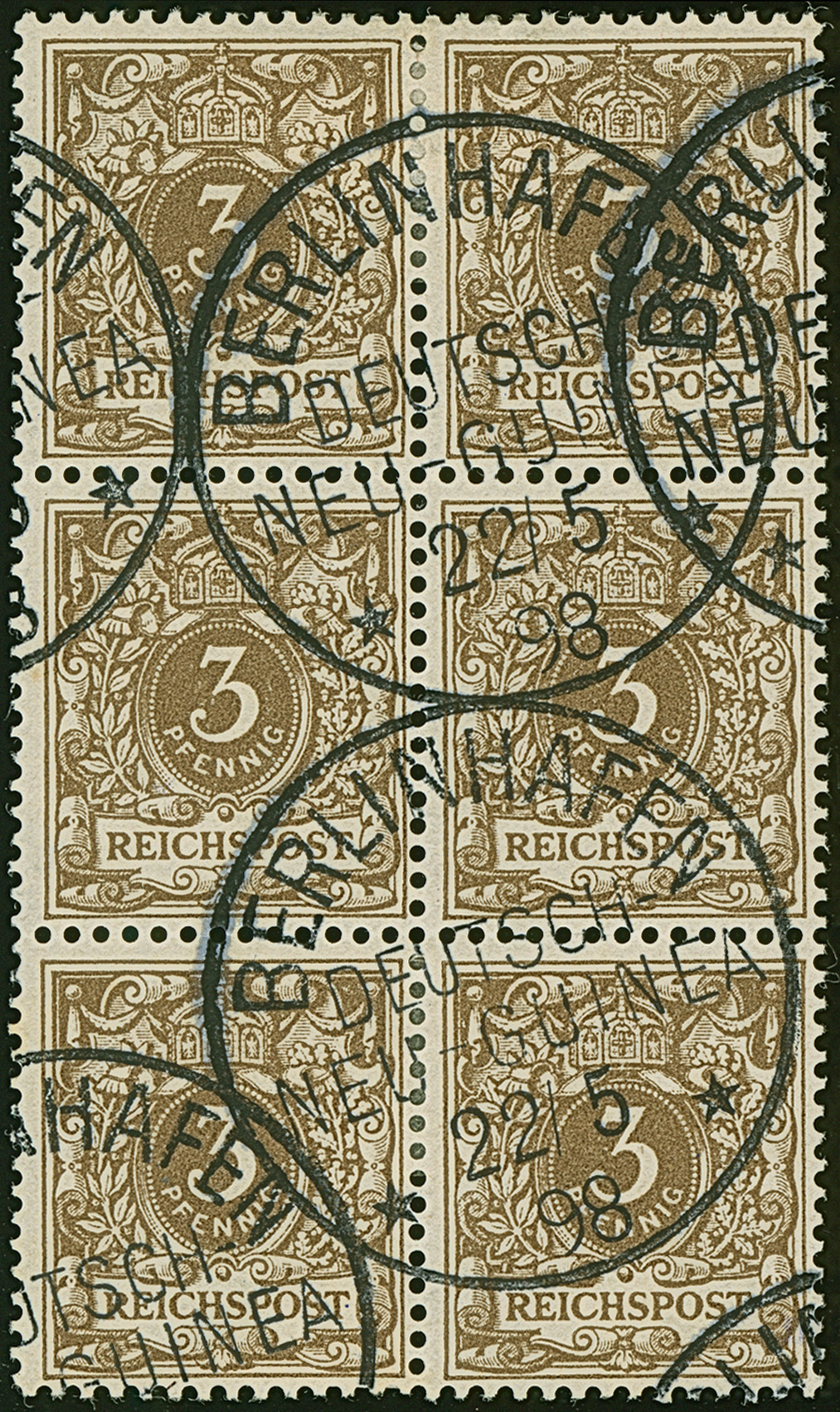 1890, Krone/Adler 3 Pfg. mittelbraun im senkrechten 6er-Block mit sehr klaren Stempelabschlägen “BERLINHAFEN DNG 22.5.98”, in einwandfreier Erhaltung, sign. Bothe BPP