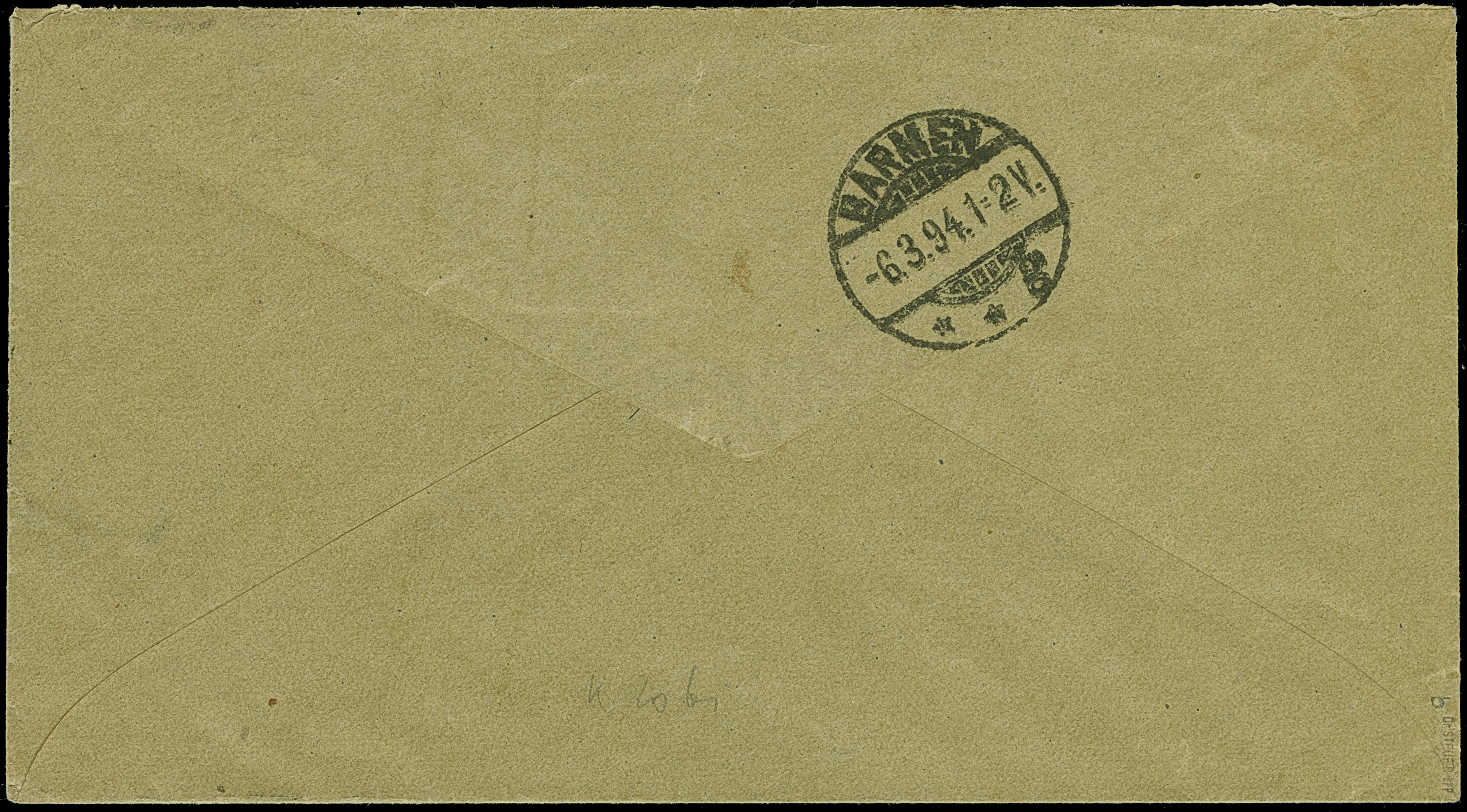 1890, Krone/Adler 10 Pfg. lebhaftrosarot mit Stempel "FRIEDRICH-WILHEMSHAFEN 20.1.94" im senkrechten Paar als tarifgerechte Mehrfachfrankatur auf Brief an das Missionshaus in Barmen mit Ankunftsstempel, in guter Erhaltung, signiert R. Steuer BPP