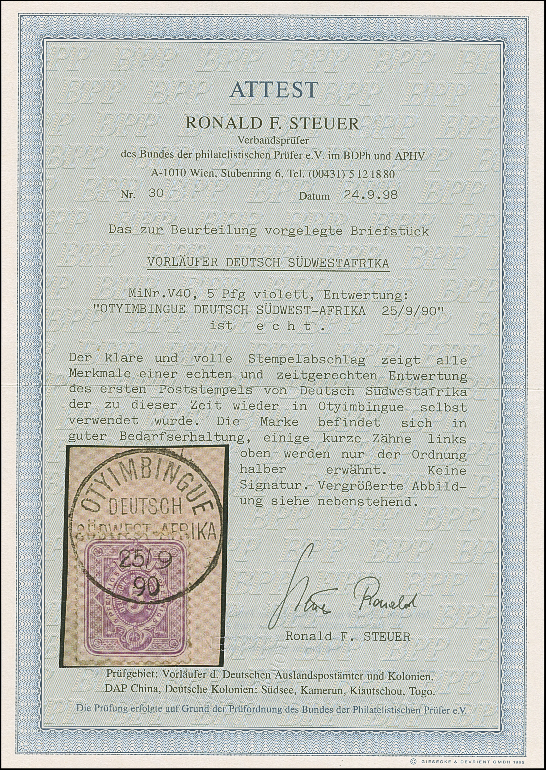 1888, 5 Pfg. violettpurpur mit klarem Stempel “OTYIMNGUE DSWA 15.9.90” auf Briefstück. Die Marke mit wenigen verkürzten Zähnen und Patina in den Zahnspitzen, ansonsten in einwadfreier Erhaltung, Fotoattest R. Steuer BPP (1998)