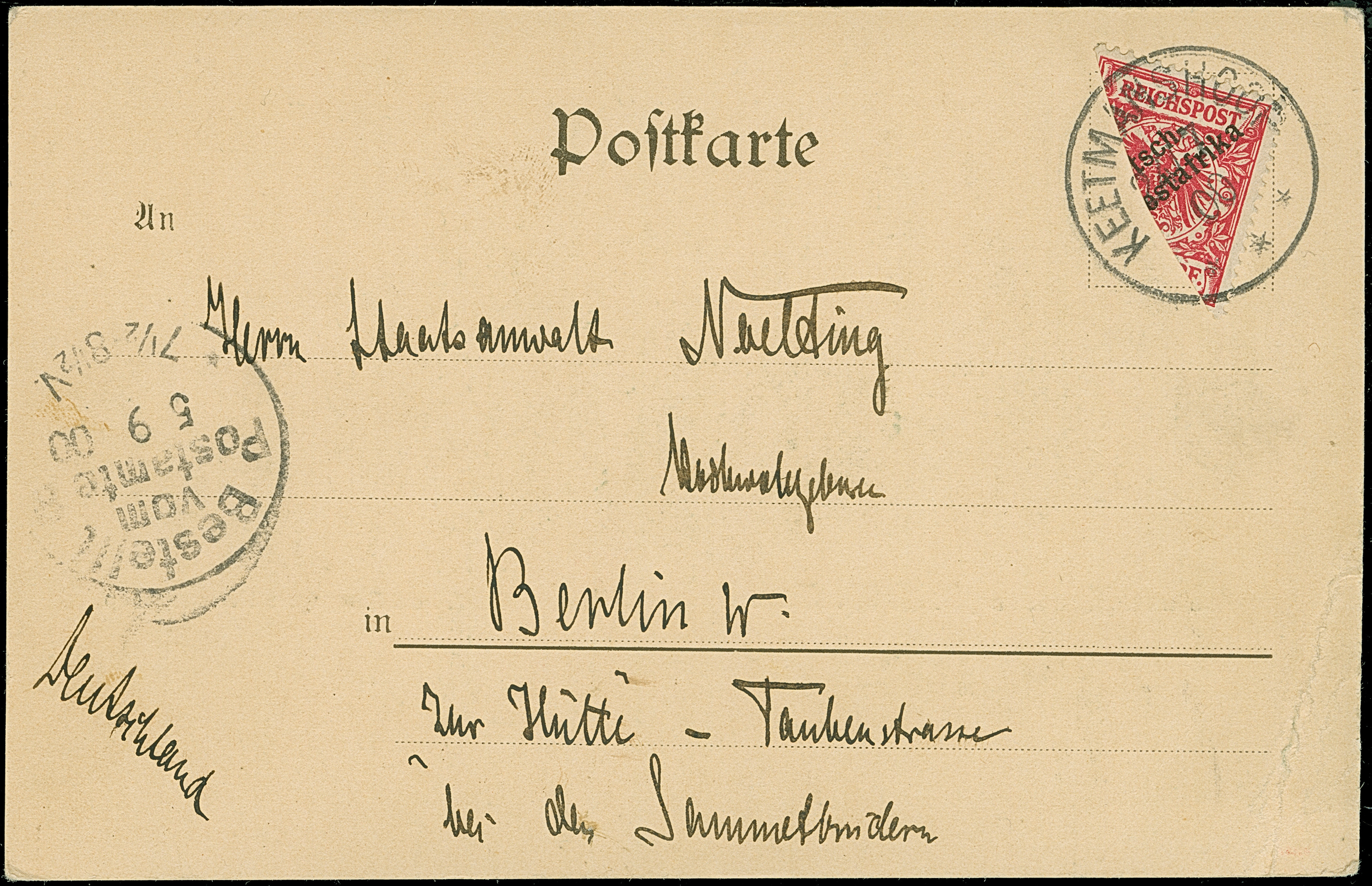 1900, 10 Pfg. diagonal halbiert (rechte Hälfte) mit Stempel “KEETMANSHOOP 24.7.00” auf Ansichtskarte mit Text nach Berlin mit vorderseitigen Ankunftsstempel. Die Karte rechts mit Randbug, die Marke ist in einwandfreier Erhaltung, doppelt signiert Bothe