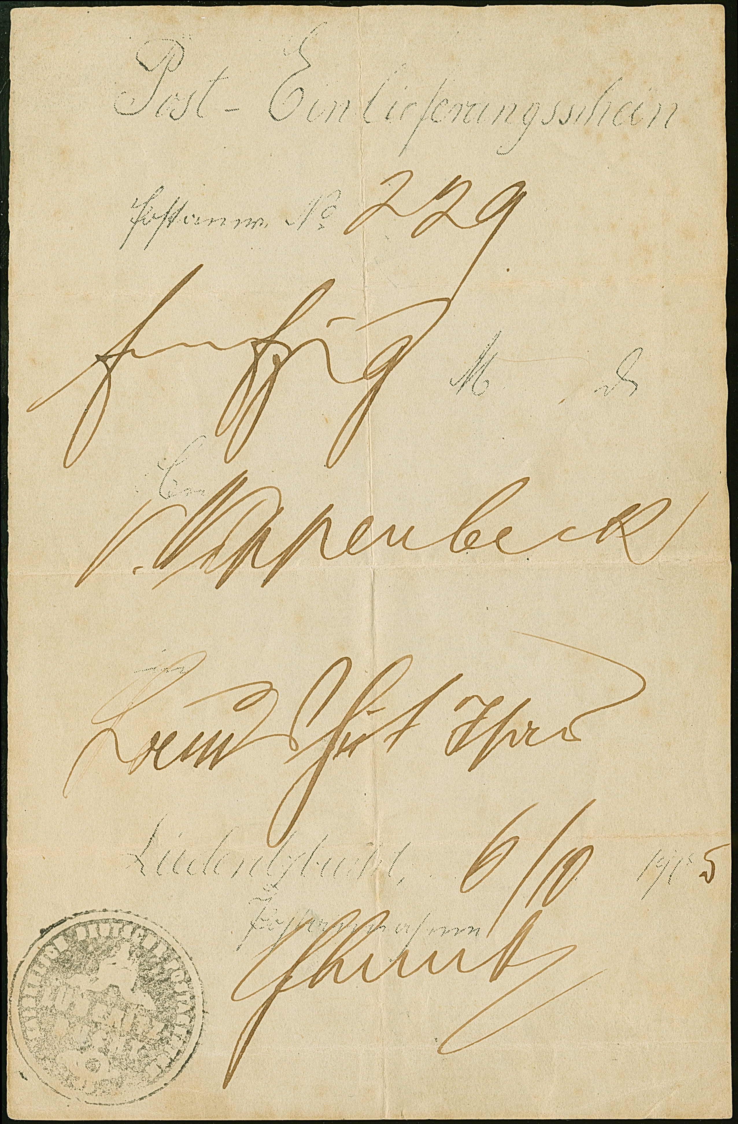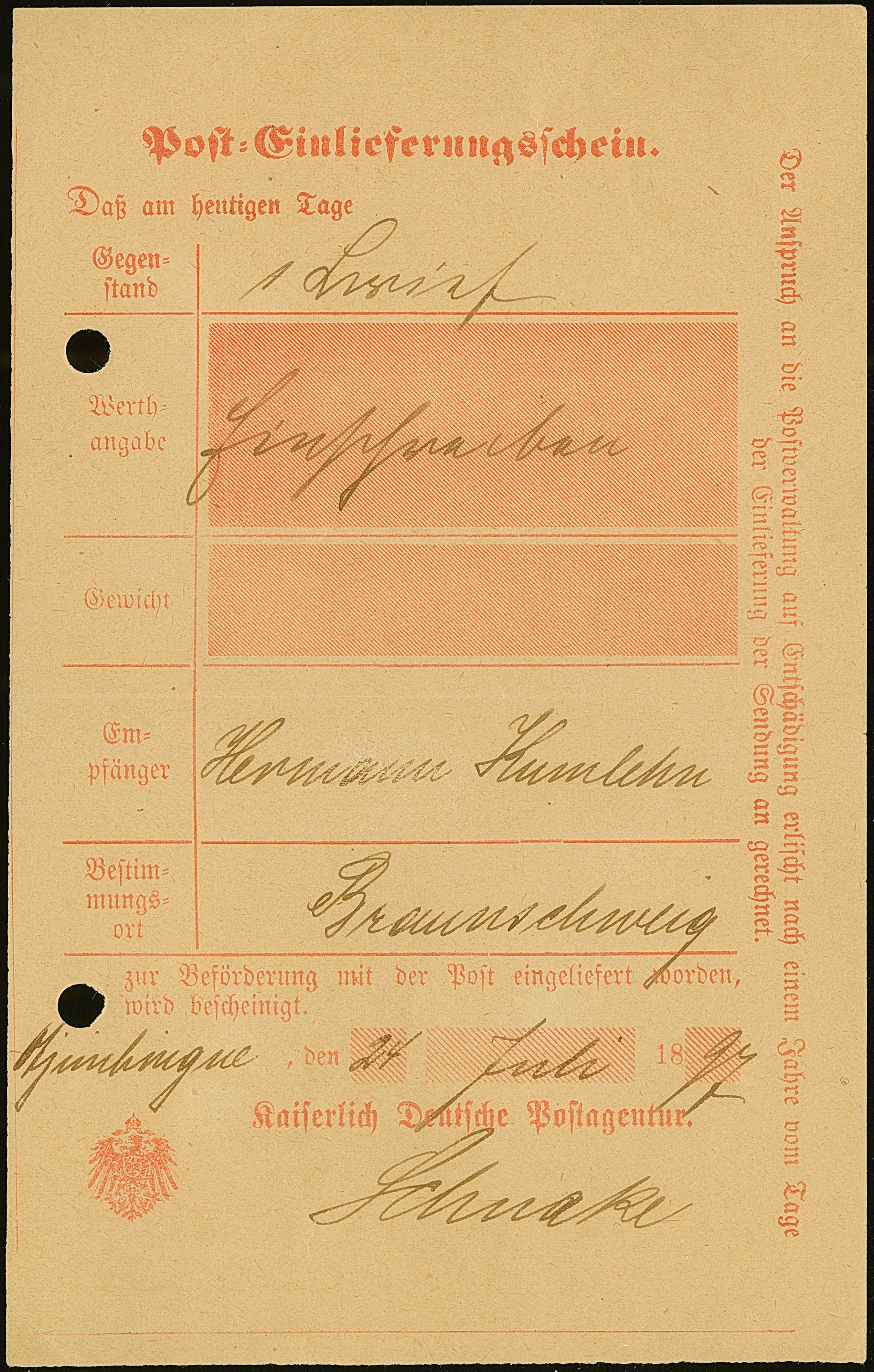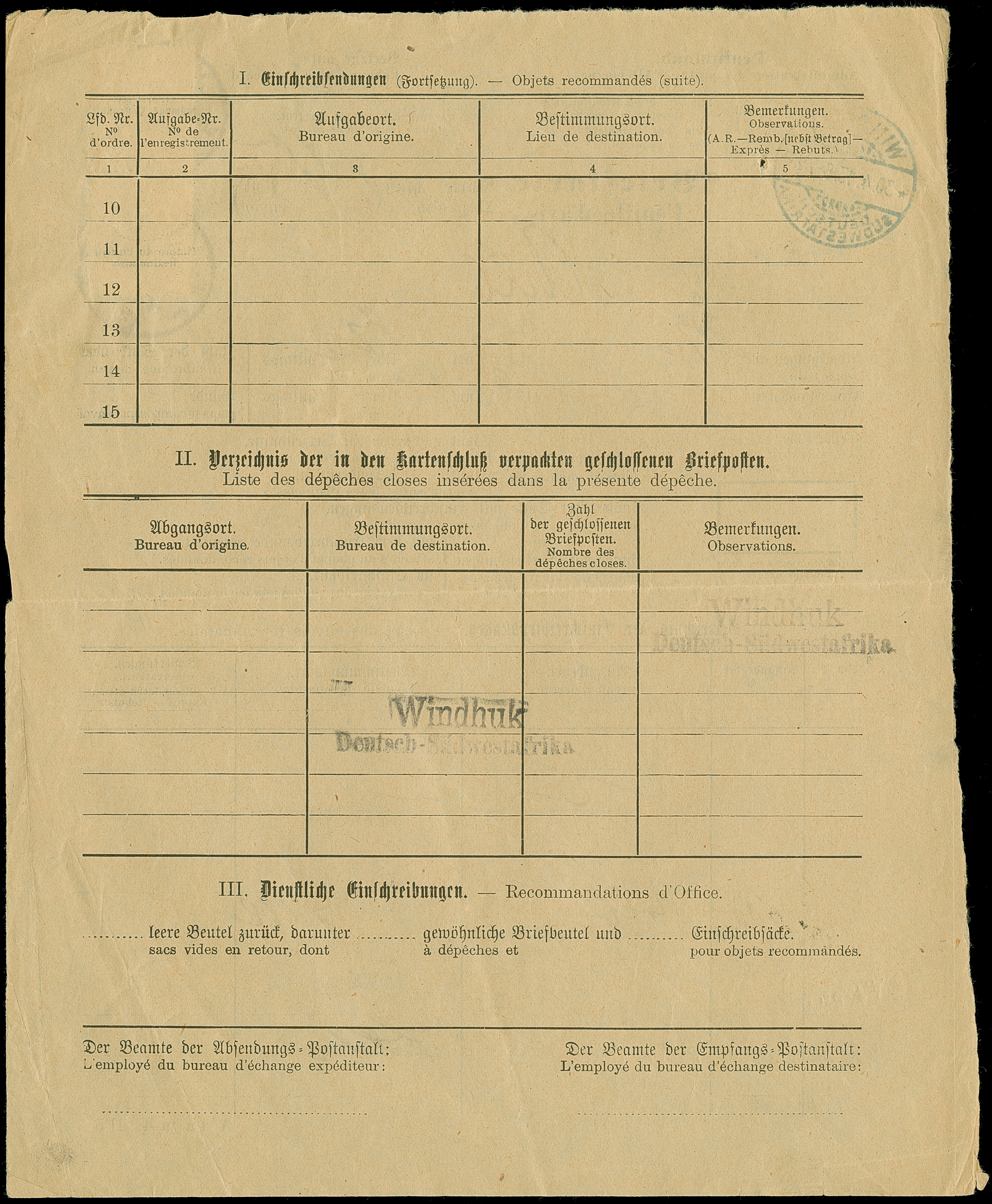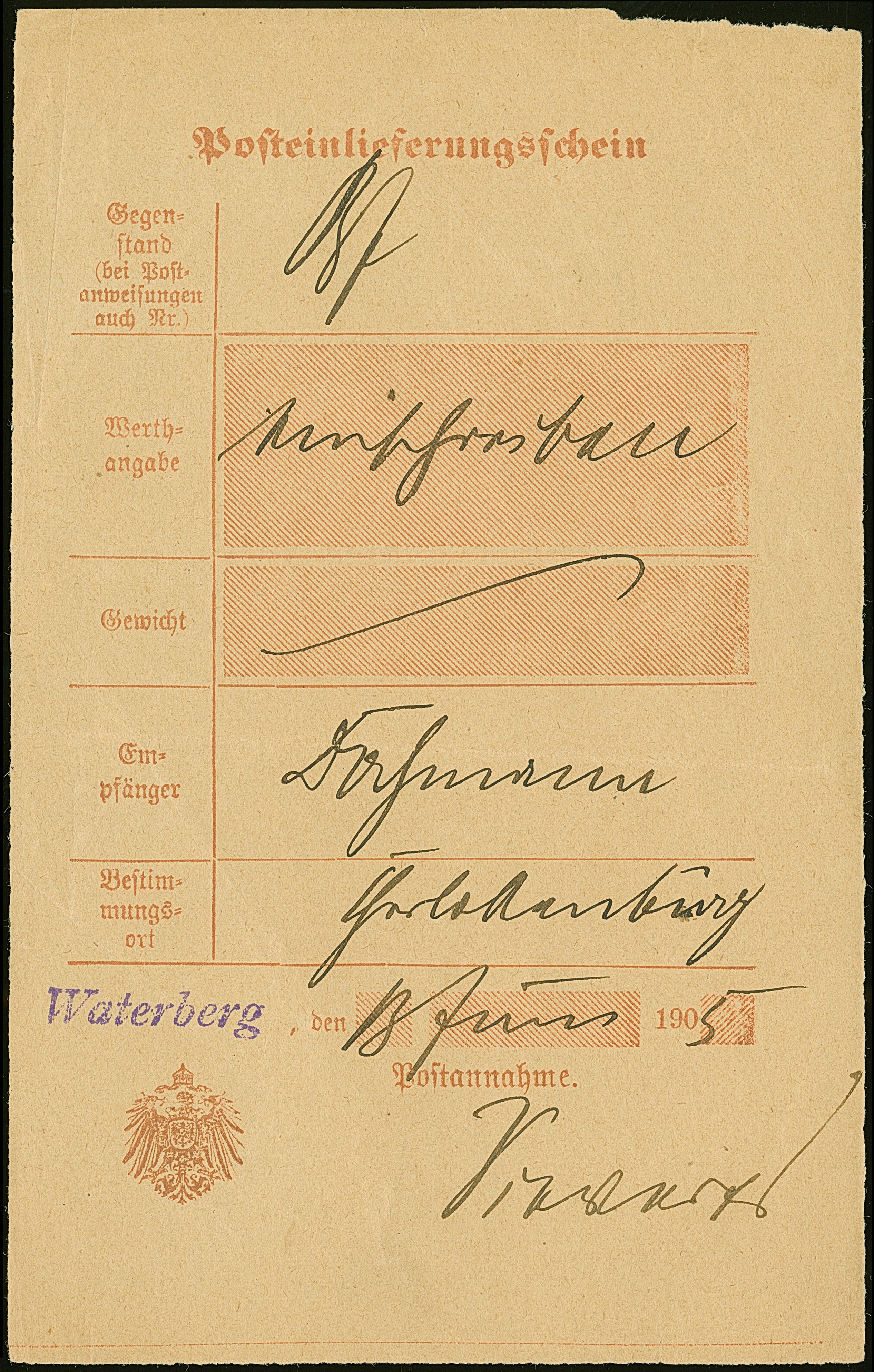 1906, provisorischer Posteinlieferungsschein für eine Postansweisung von Lüderitzbucht (6.6.1905) mit Dienstsiegel. Das Formular wurde mehrfach gefaltet, ansonsten in guter Erhaltung. In dieser Form sehr selten