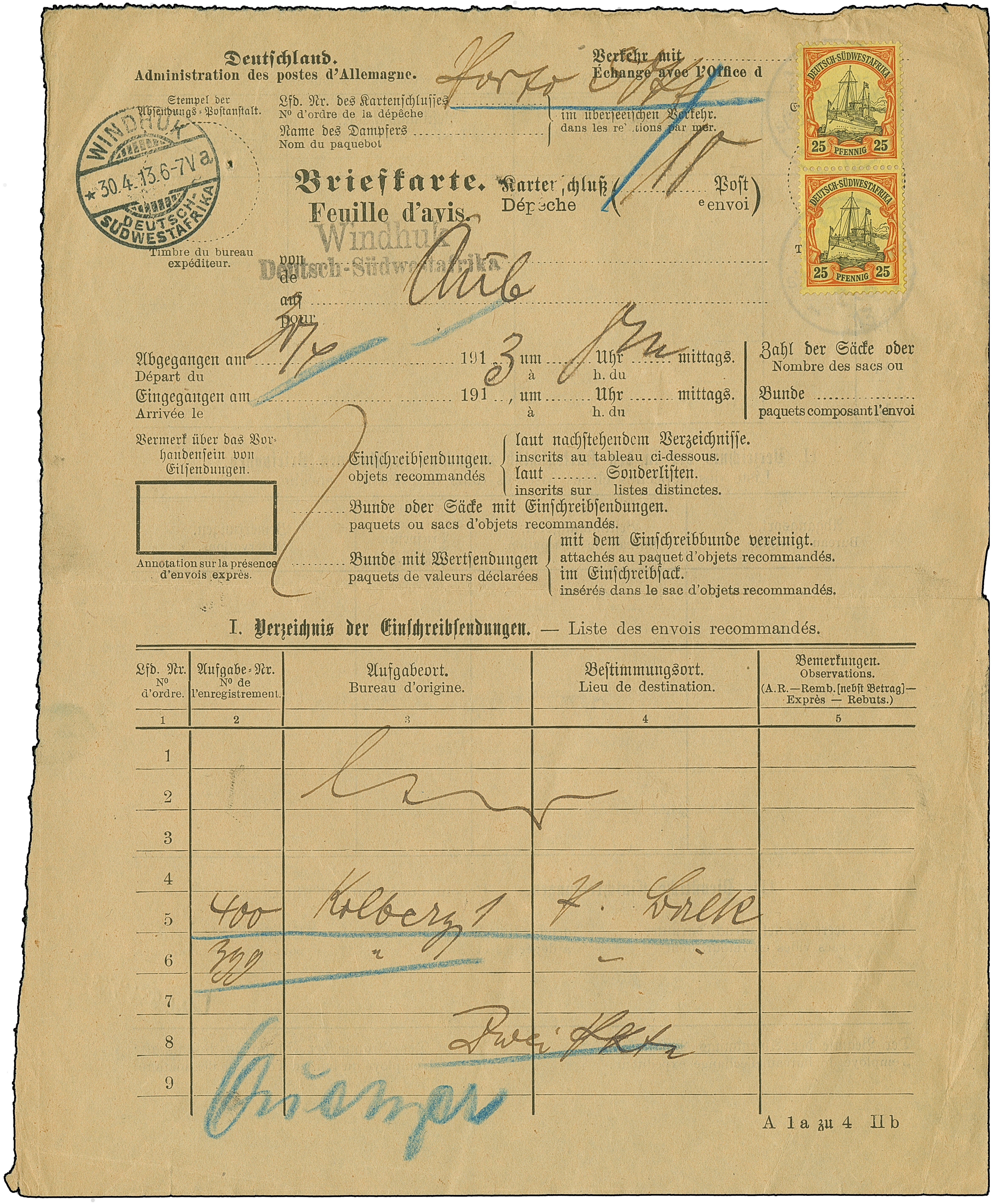 1901, Kaiseryacht 25 Pfg. im senkrechten Paar mit üblich schwachem Stempel “AUB 30.4.13” auf Briefkarten-Formular von Windhuk mit Poststempel und L2 “Windhuk Deutsch-Südwestafrika”. Das Formular mit üblicher Faltung und kleinen Randfehlern. Eine recht seltene Entwertung auf frankiertem Formular