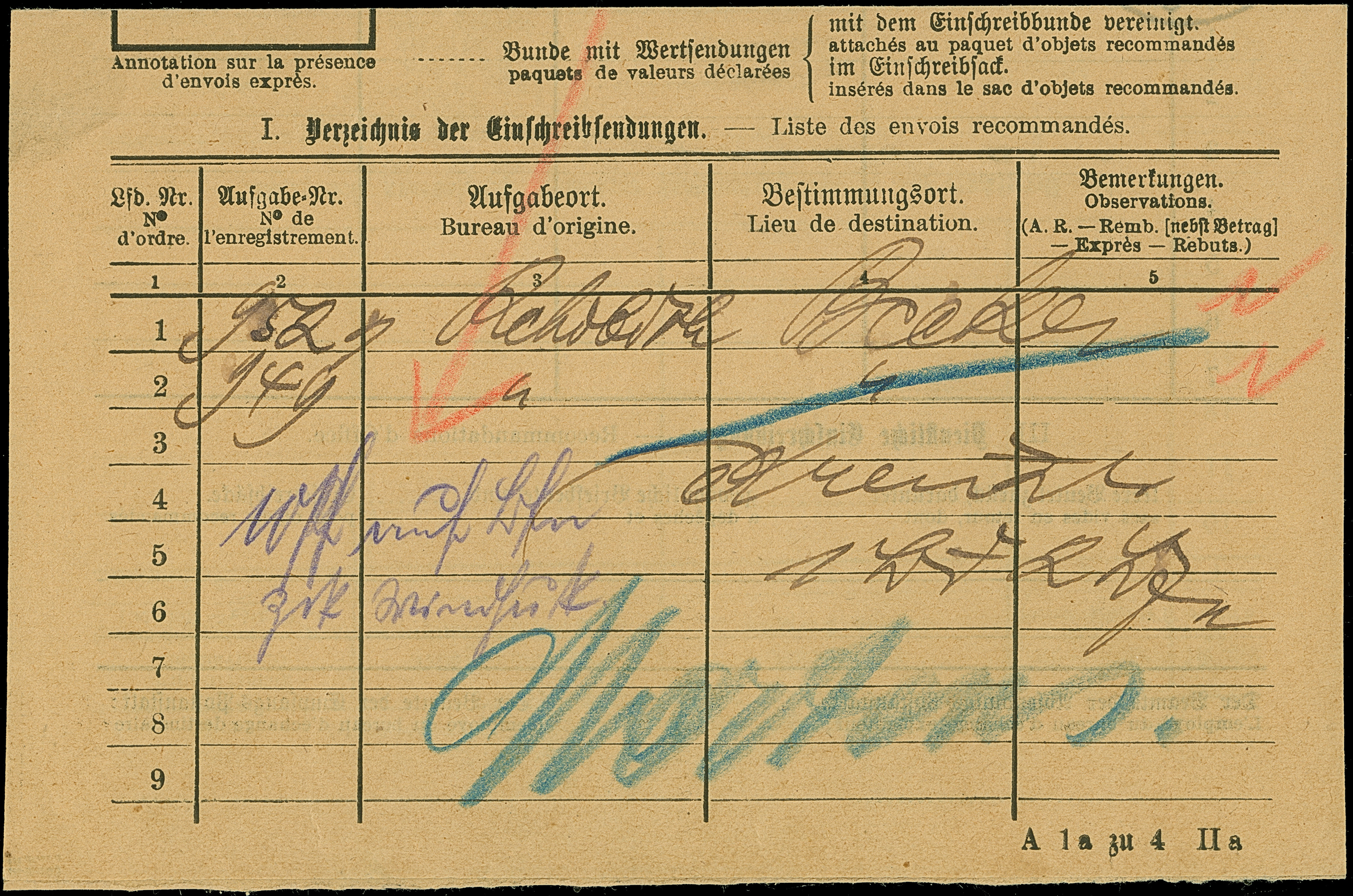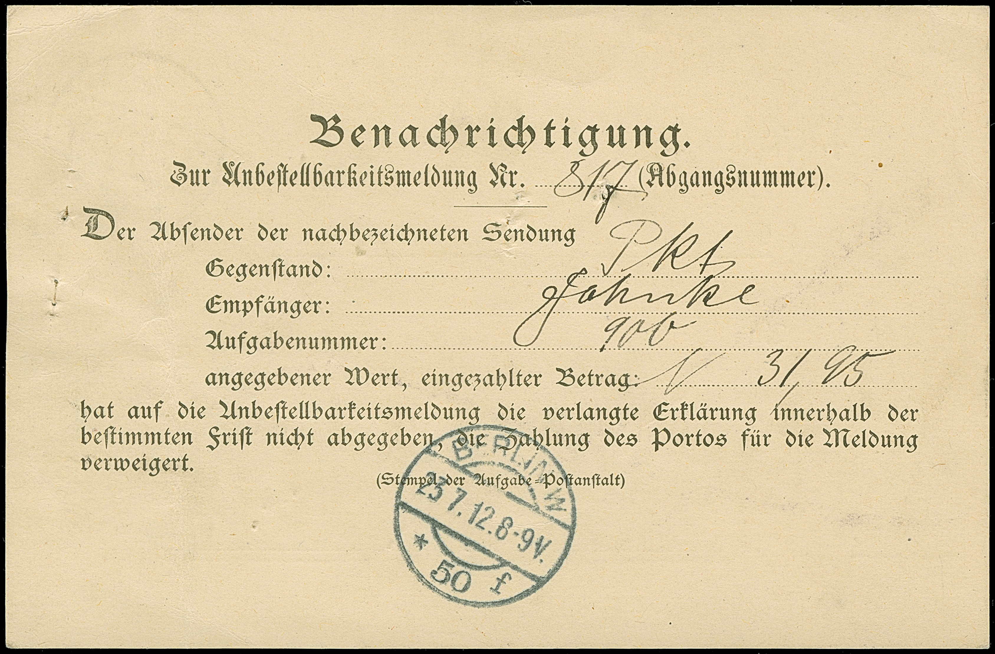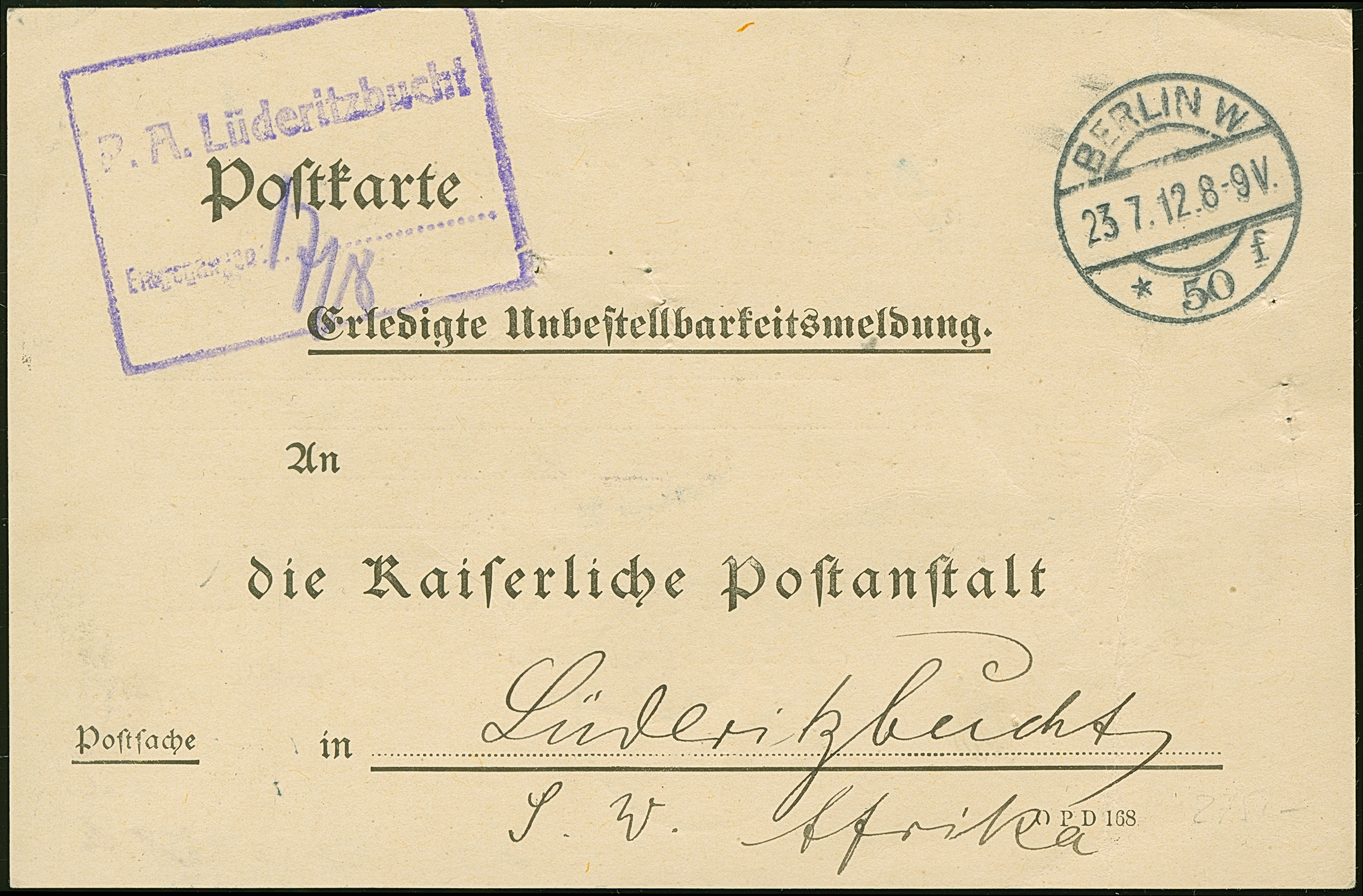 1912, Postsachen-Vordruckkarte “Erledigte Unbestellbarkeitsmeldung” von “BERLIN W50 273.7.12 an das Postamt Lüderitzbucht mit vorderseitigem Eingangsstempel ”P.A. Lüderitzbucht Eingegangen (17.8)". Das Formular mit kleiner Hefterlochung und diagonalem Bug rechts, ansonsten in guter Erhaltung. Eine seltene Formular-Verwendung mit Destination Deutsch-Südwestafrika