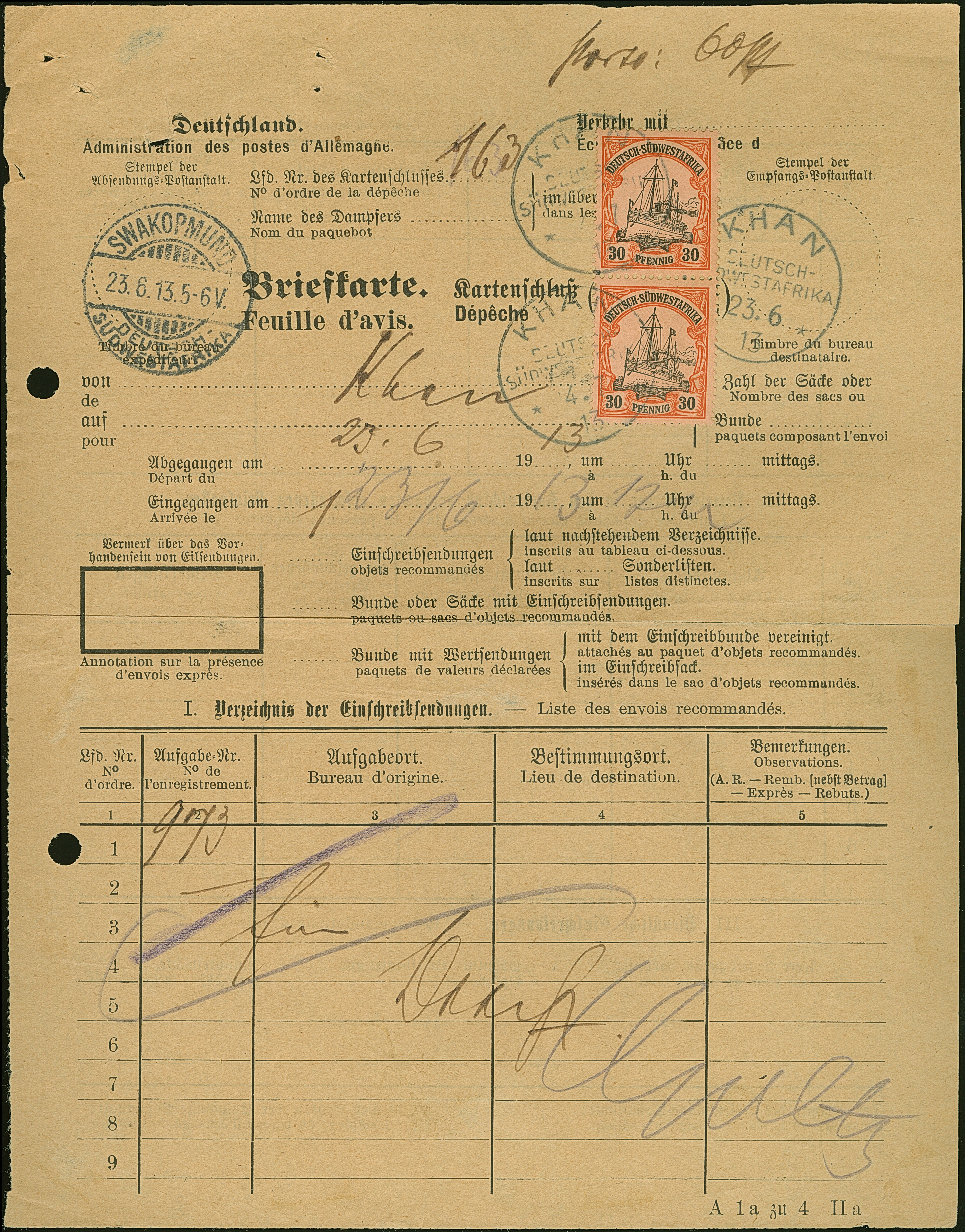 1901, Kaiseryacht 30 Pfg. im senkrechten Paar mit Stempel “KHAN DSWA 4.7.13” auf Briefkarten-Formular von “SWAKOPMUND DSWA 23.6.13” mit allen Vermerken und Stempeln. Das Formular mit den üblichen Faltspuren und links mit Aktenlochung, ansonsten in guter Erhaltung