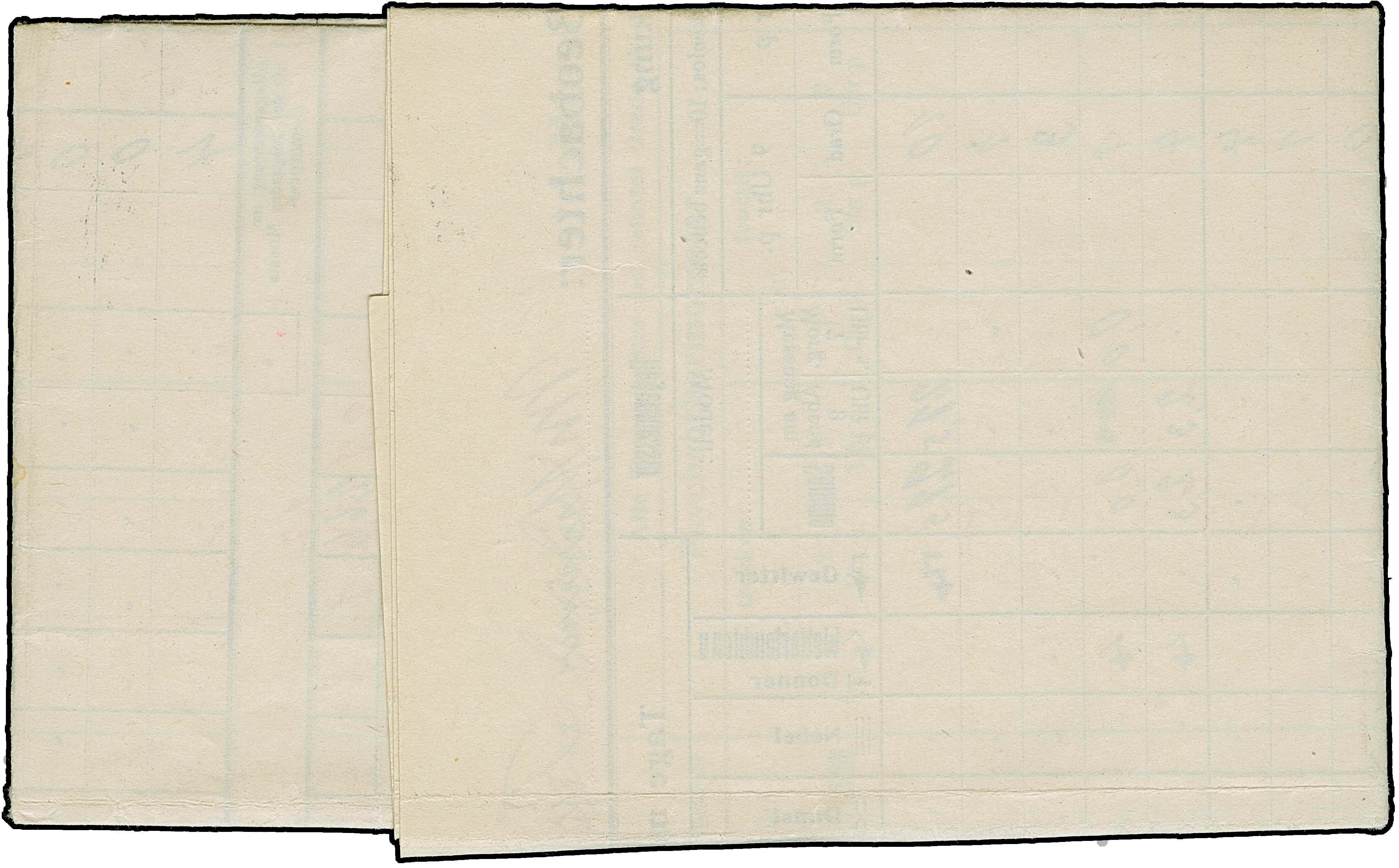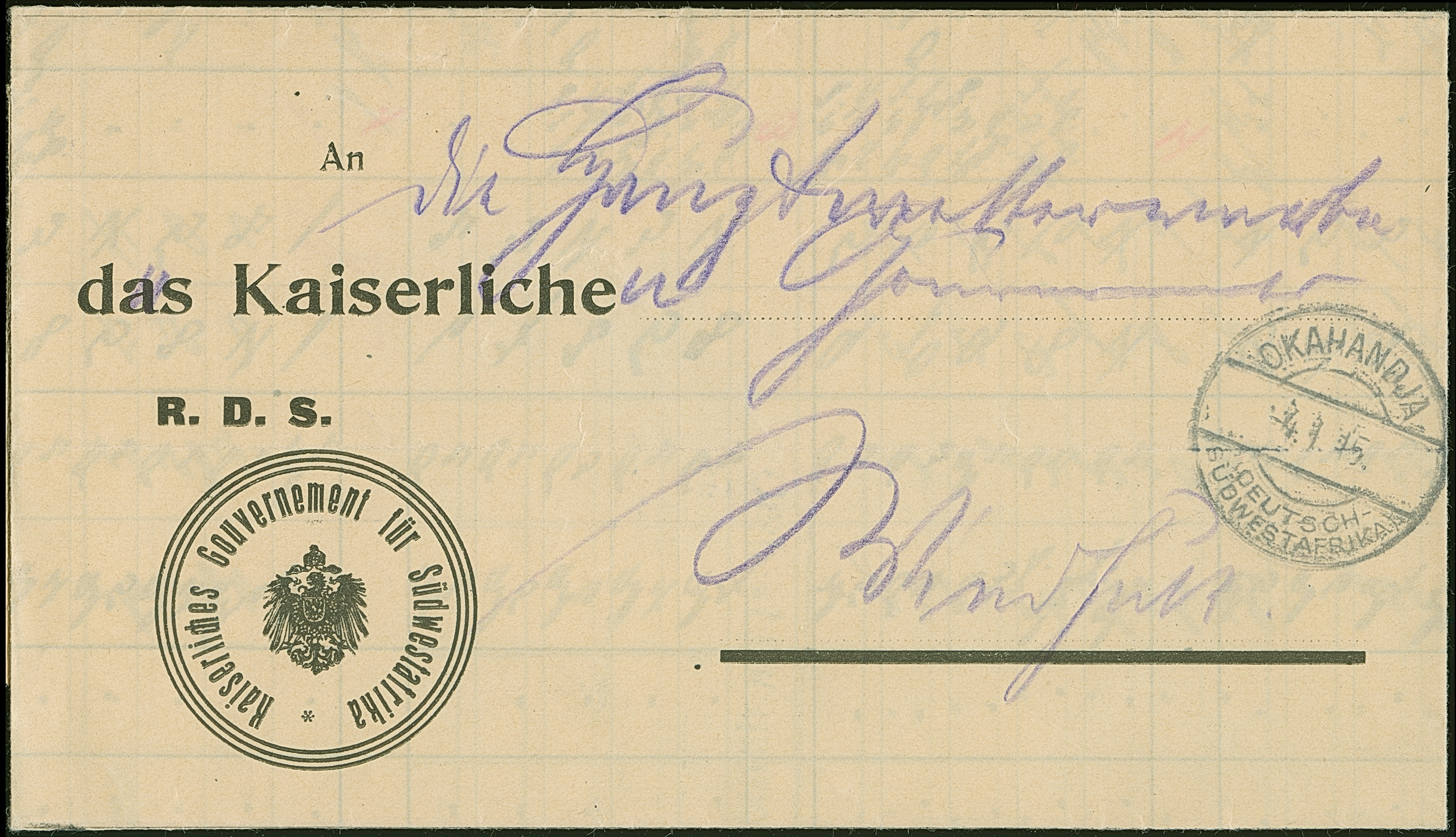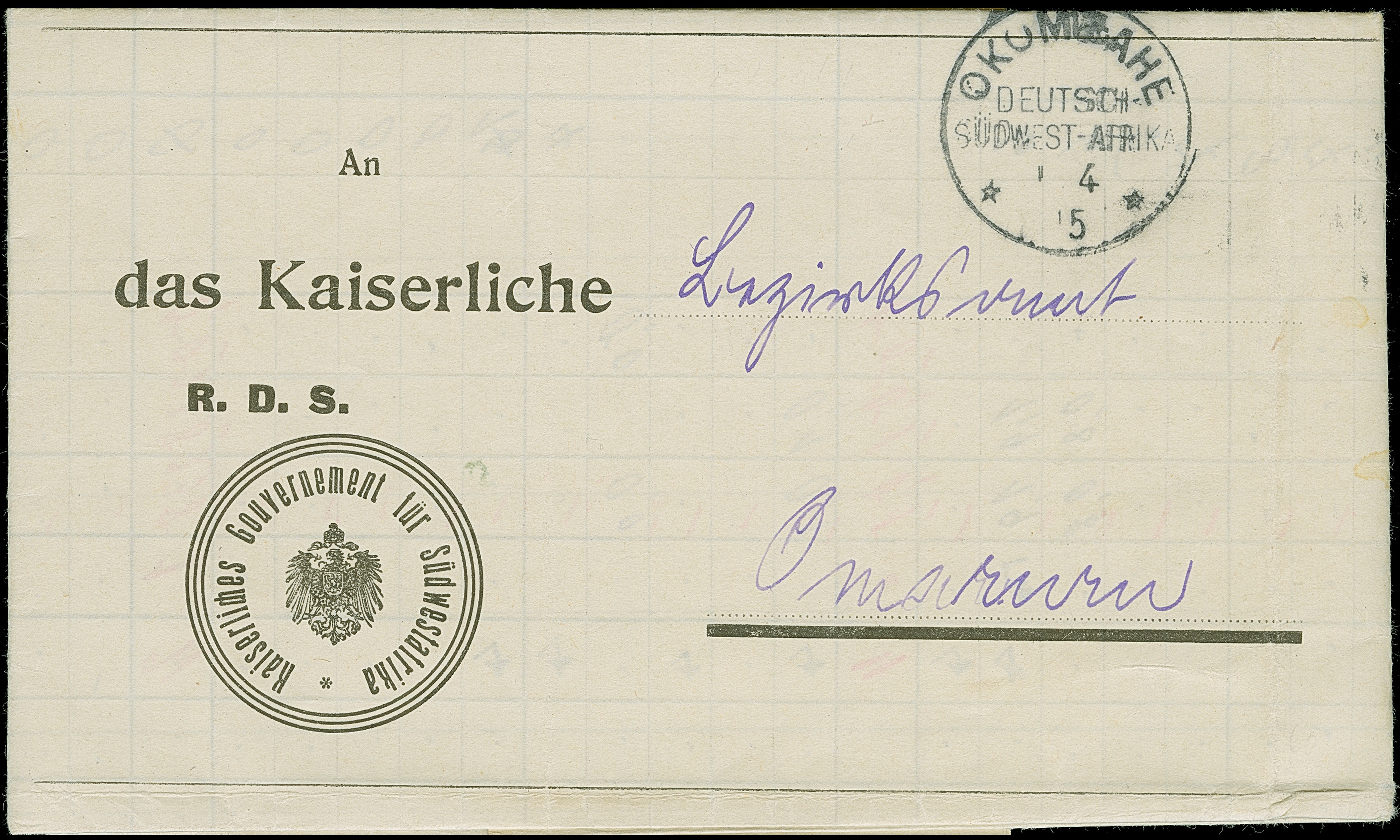 1915, “OKAHANDJA DSWA 4.1.15” auf komplettem “R.D.S.”-Faltbrief (Regenmess-Tabelle) nach Winduk mit Ankunftsstempel, in einwandfreier Erhaltung