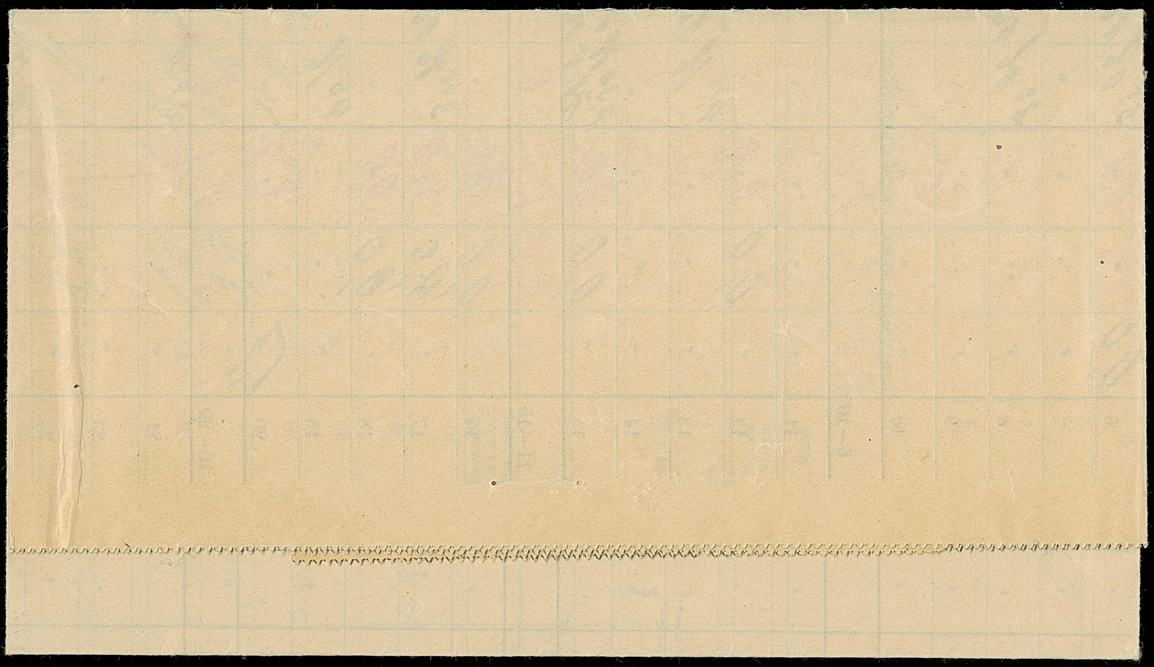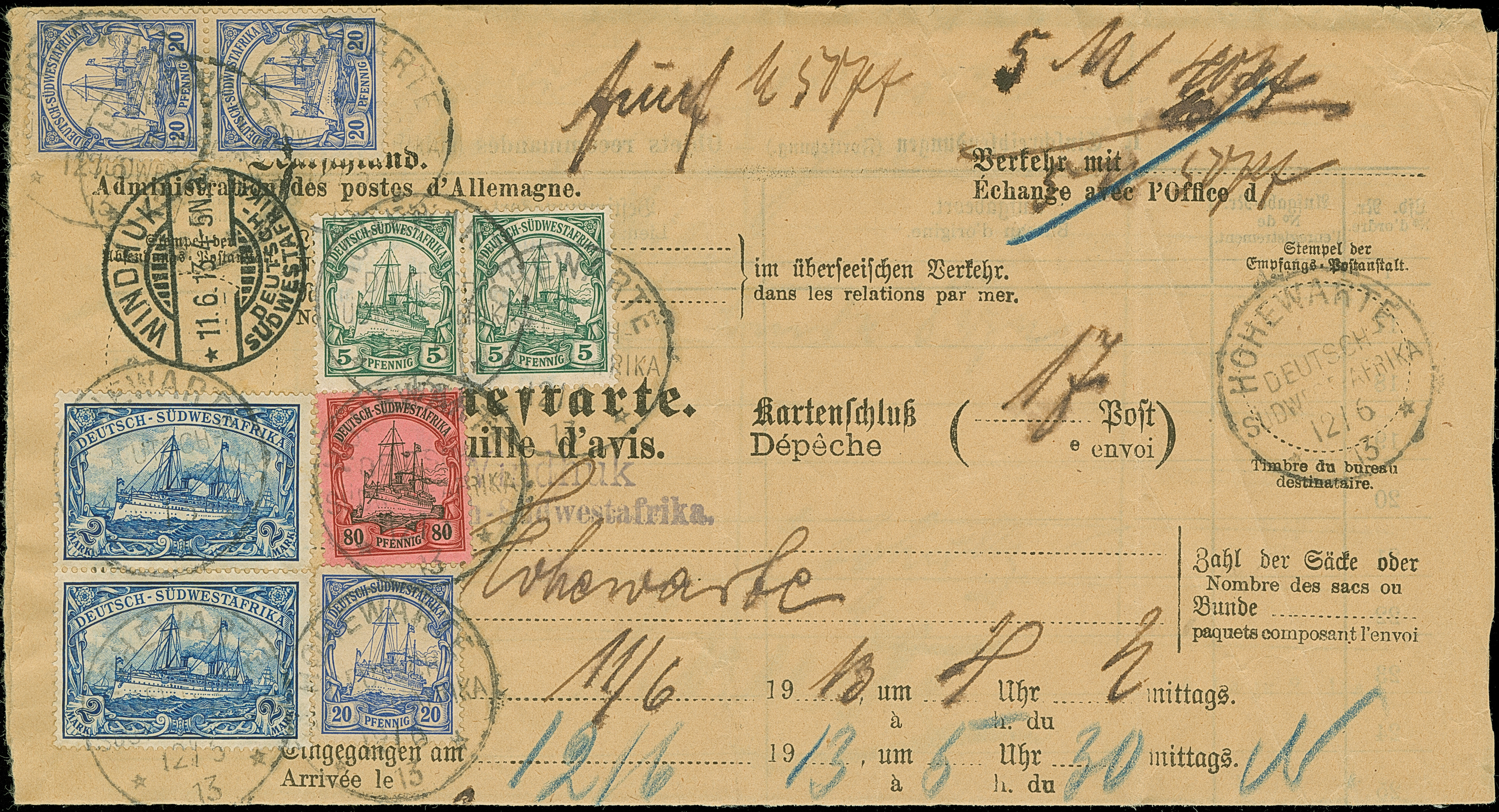 "Arahoab 12/12 08" jeweils sauber handschriftlich auf senkrechtem 6er-Block 10 Pfg. auf Postanweisungsabschnitt mit Ankunftsstempel von Windhuk. Ein Wert Zahnfehler und die Einheit senkrecht gefaltet. Ein äußerst seltenes Stück; größte von PROFI registrierte Einheit mit dieser Aushilfsentwertung.