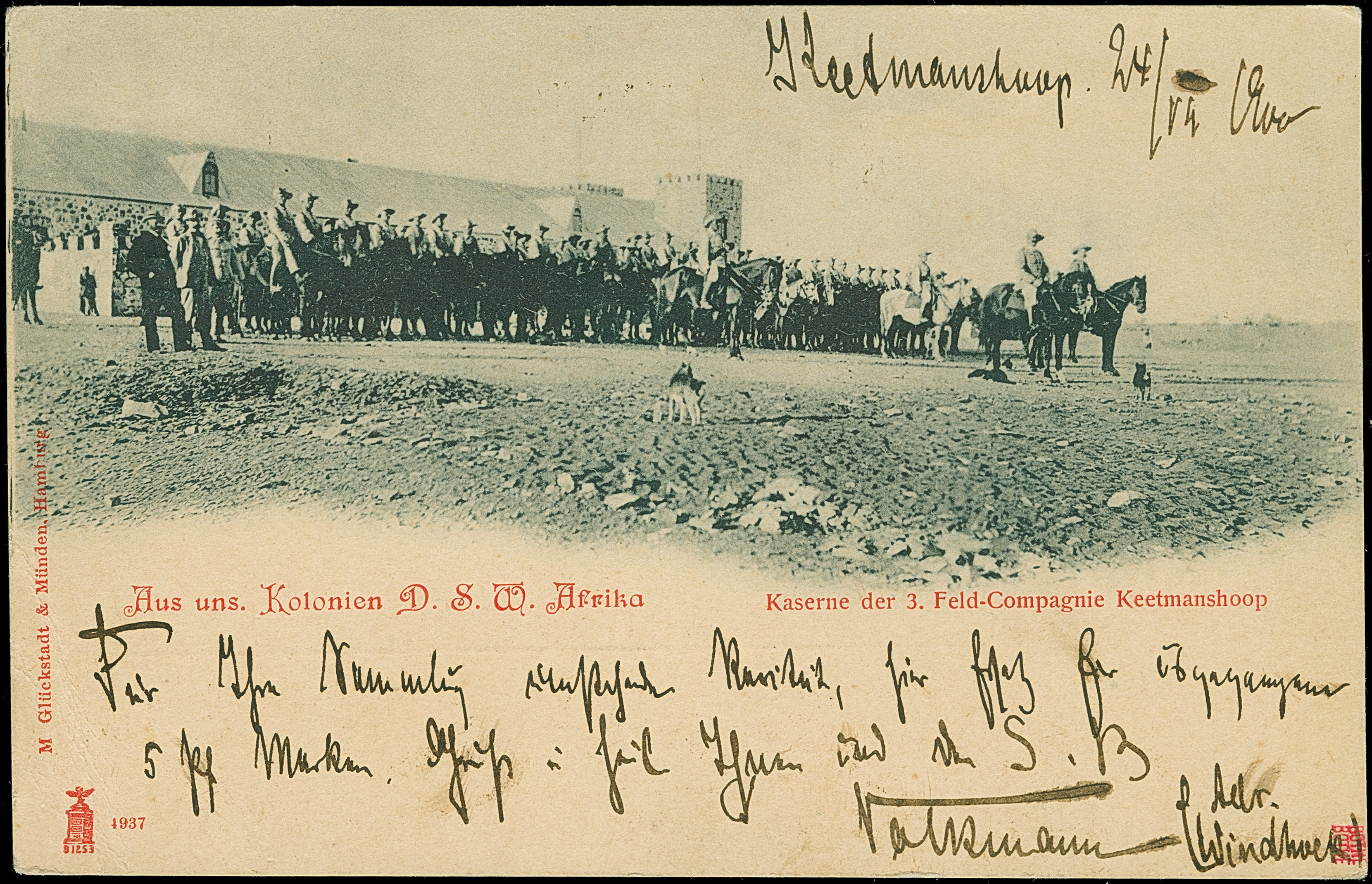 “Gochas” handschriflich und Wanderstempel vom 27.2.04 auf Feldpost-Ansichtskarte mit Text und Dienstsiegel “OKANGAVA” mit handschriftlicher Änderung “Goachas” nach Beurig mit vorderseitigem Ankunftsstempel, in guter Erhaltung. In dieser Kombination sehr selten, doppelt signiert Dr. Steuer BPP