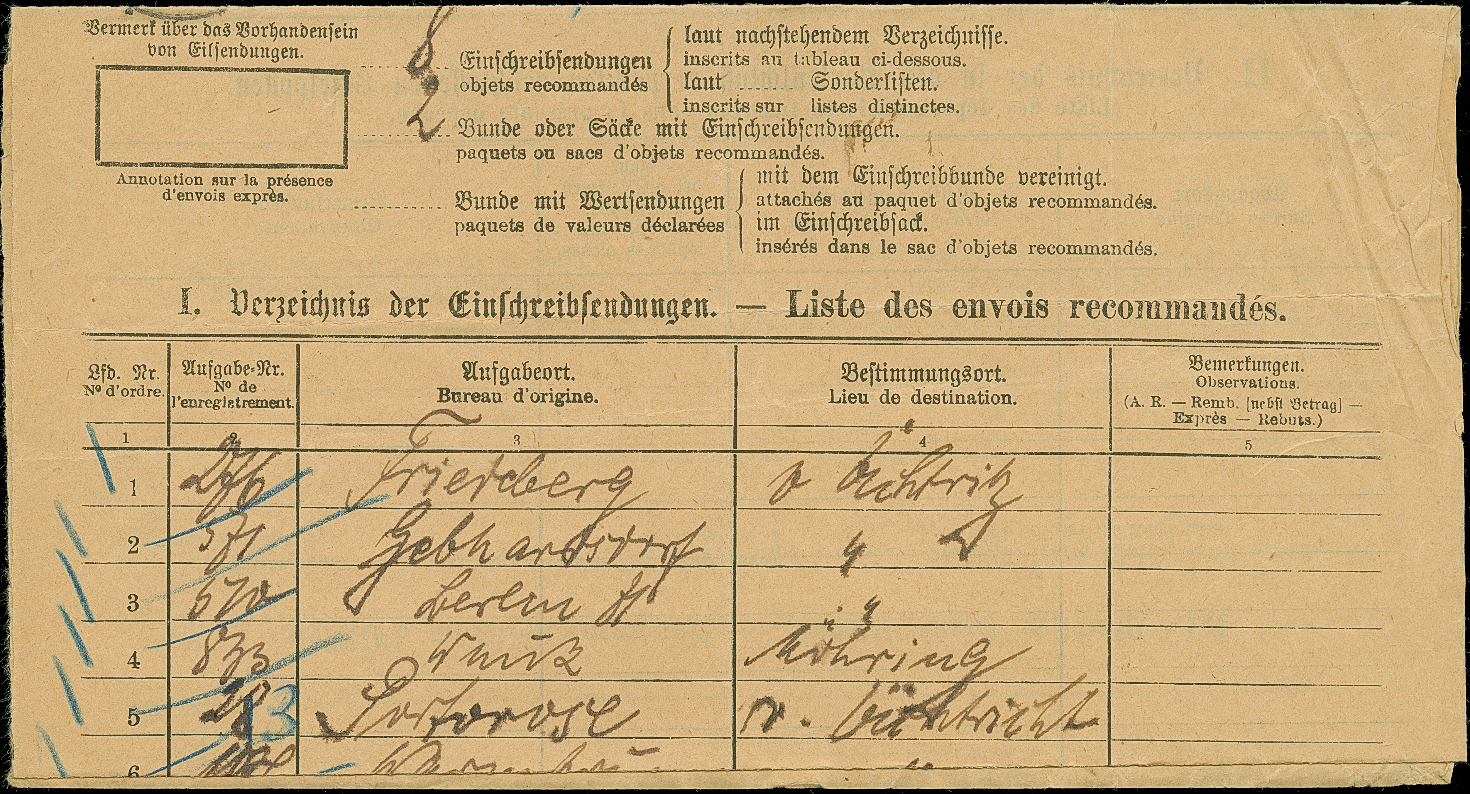 1897/19612, sechs Posteinlieferungsscheine mit violettem L1/L2 “Gibeon Deutsche-Südwestafrika (1905), ”Gobabis Deutsch-Südwest-Afrika" (1911), “Hasuur Deutsch-Südwestafrika” (1912), “Kuis (Kub) Süd.-W.-Afrika” (1906) und “Swakopmund” (1907) bzw. handschriftlich “Otjmbingue” (18979. Die Postscheine mit üblichen Falt- und Randspuren, zwei Stück haben Aktenlochung