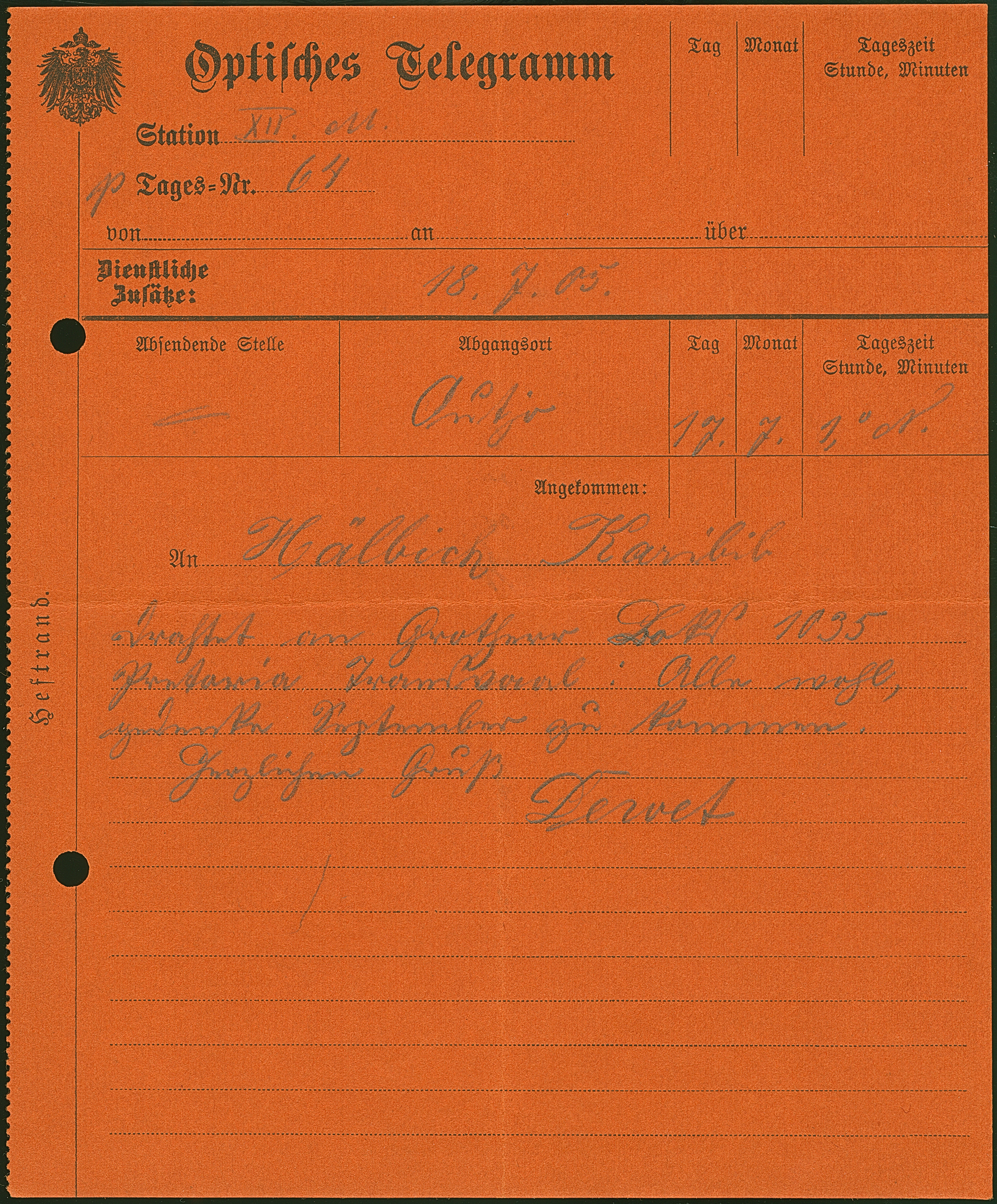 1905, Optisches Telegramm aus Outjo vom 17.7.1905 nach Karibib ohne weitere Vermerke. Das Formular ist zweimal gefaltet und links mit Aktenlochung445, ansonsten in guter Erhaltung