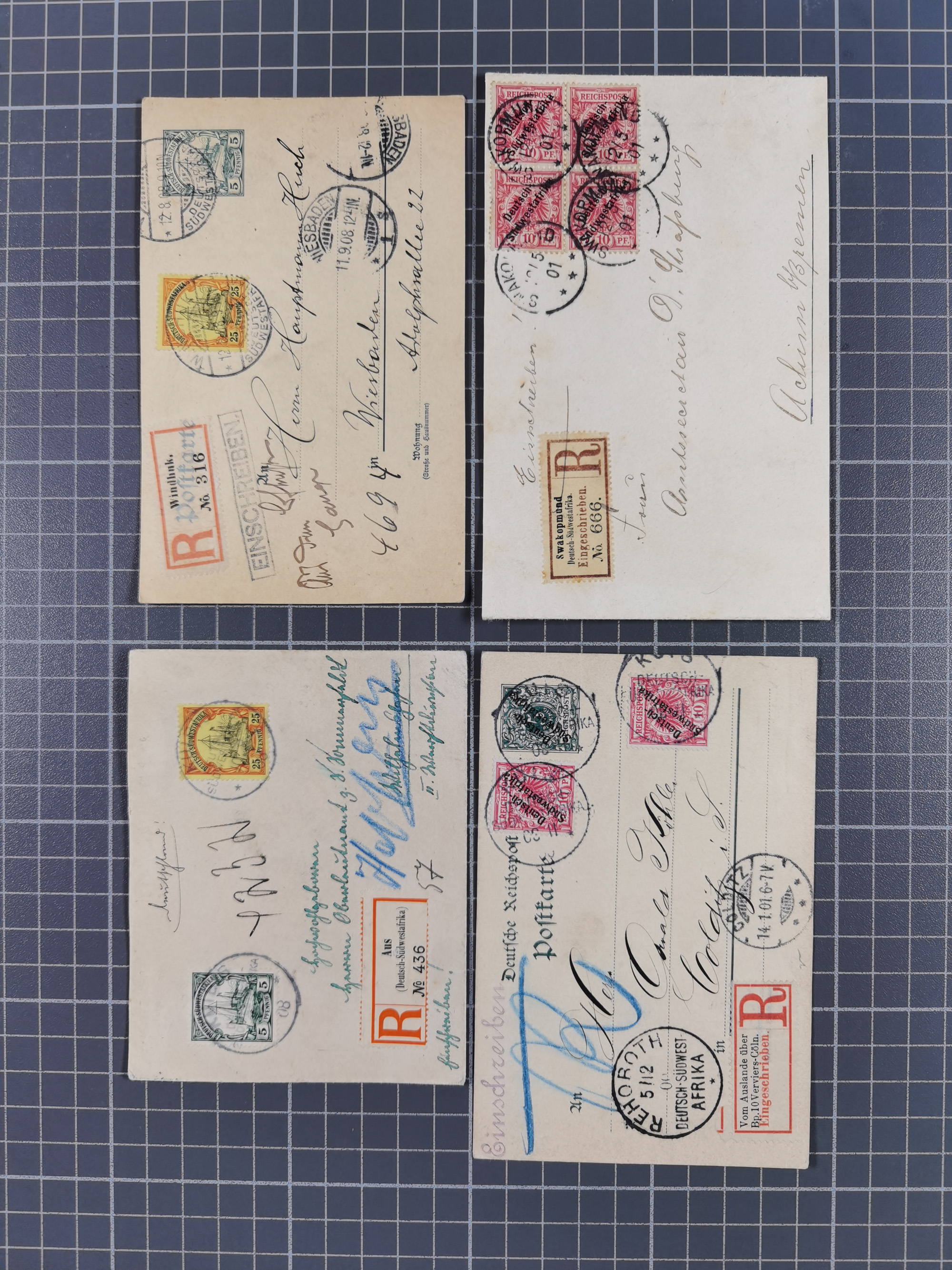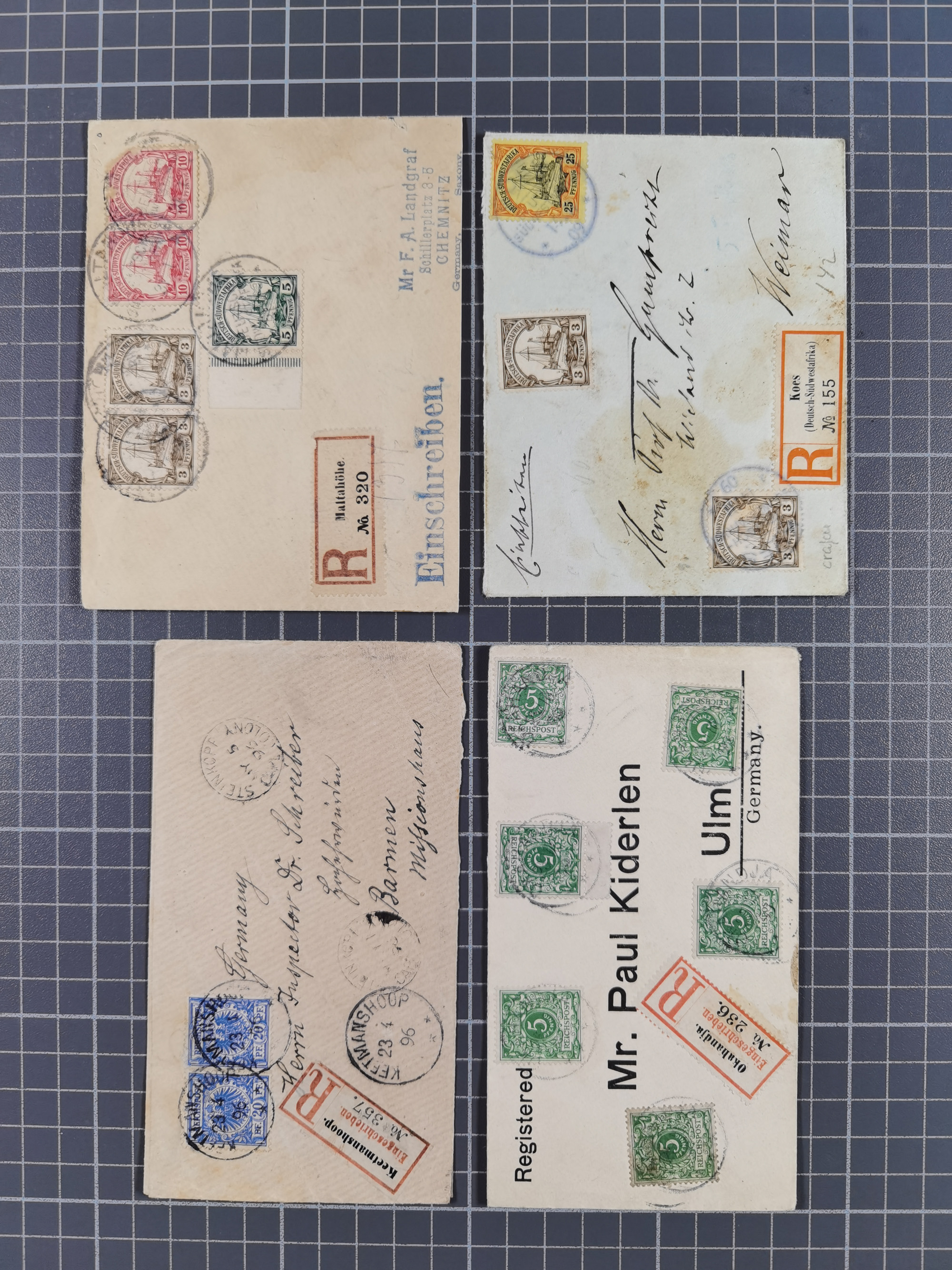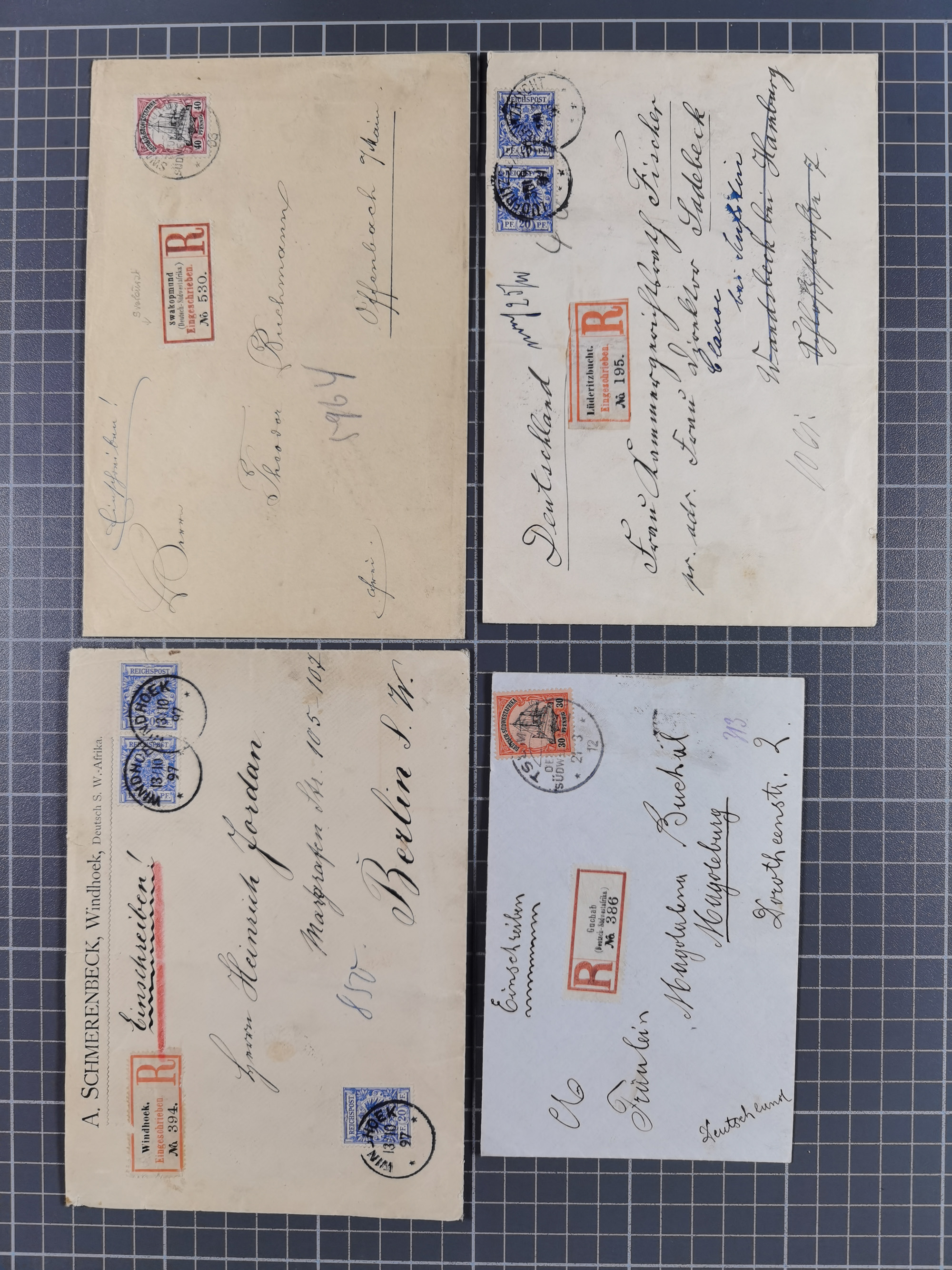 1896/1912, 23 R-Briefe ab Vorläufer-Ausgaben inkl. zwei R-Briefen aus der Mandatszeit mit alten deutschen R-Zetteln und zwei Rückscheine für den Auslandsverkehr. Dabei fast nur verschiedene R-Zetteltypen, bessere Stempel mit u.a. Koes, Maltahöhe, Onguati mit Blanko-R-Zettel mit handschriftlichem Zusatz “Onguati”, Wiedhafen und Wilhelmsthal sowie interessante Frankaturen inkl. Mehrfachfrankaturen. Bei vier Briefen ist ein Teil der Adresse ausgeschnitten, ansonsten meist in guter Erhaltung