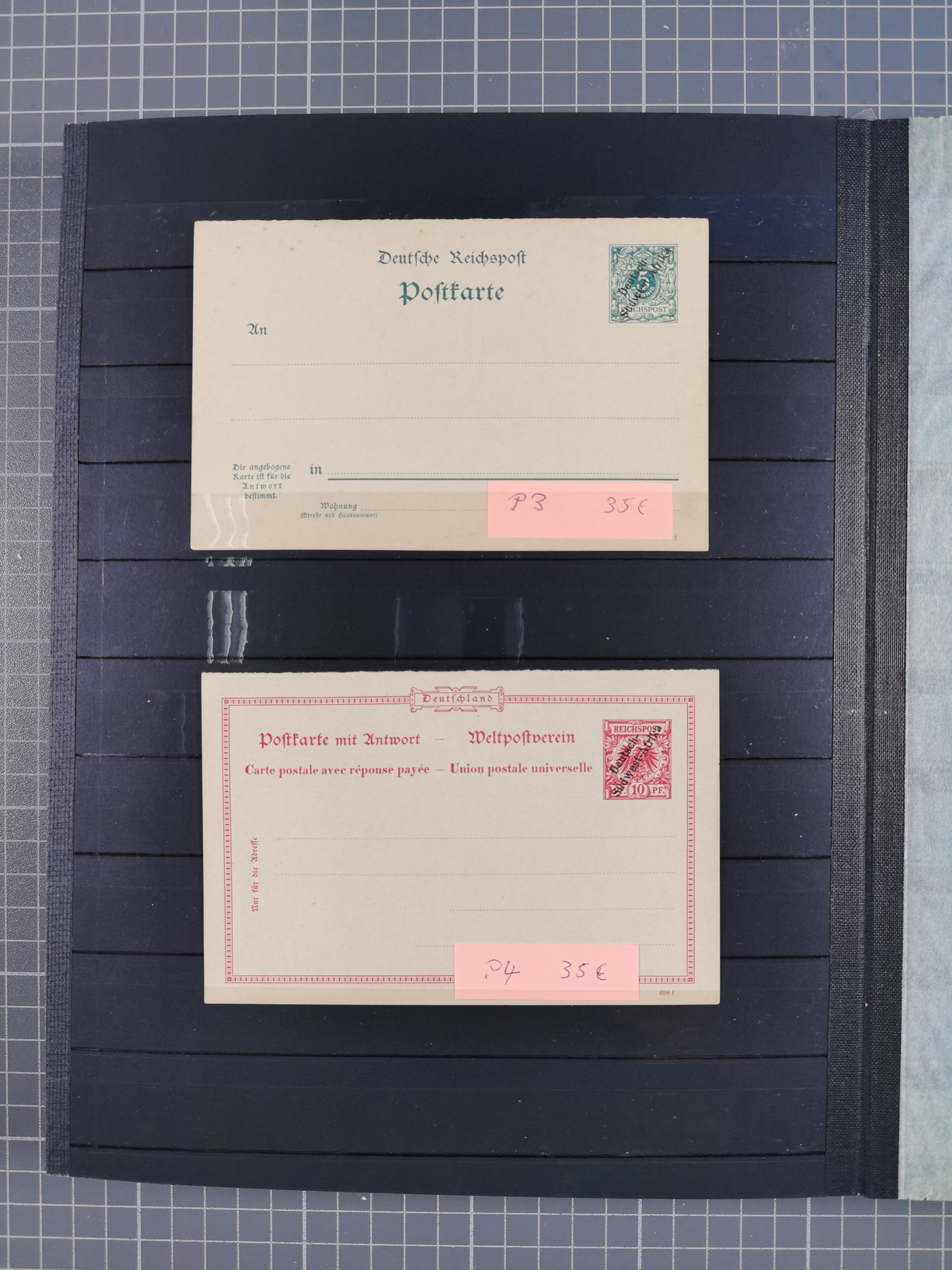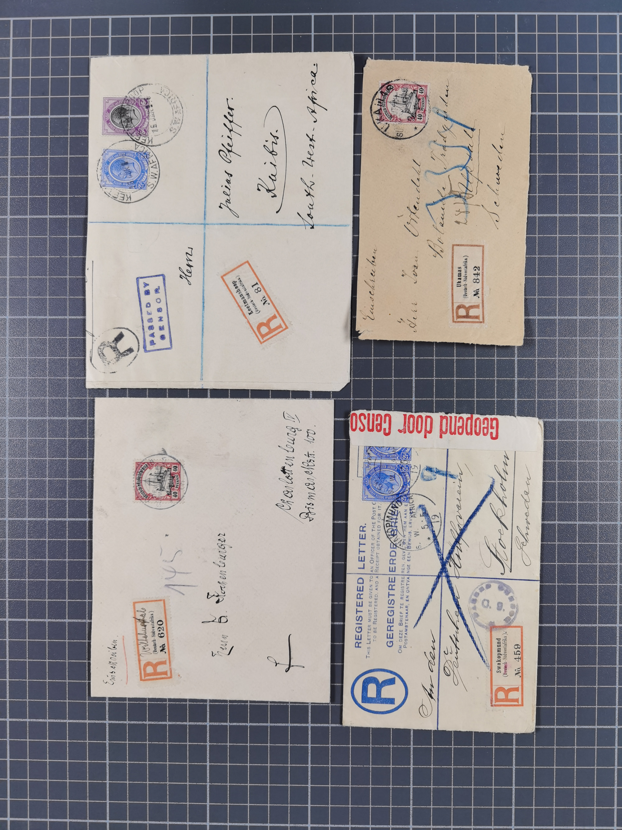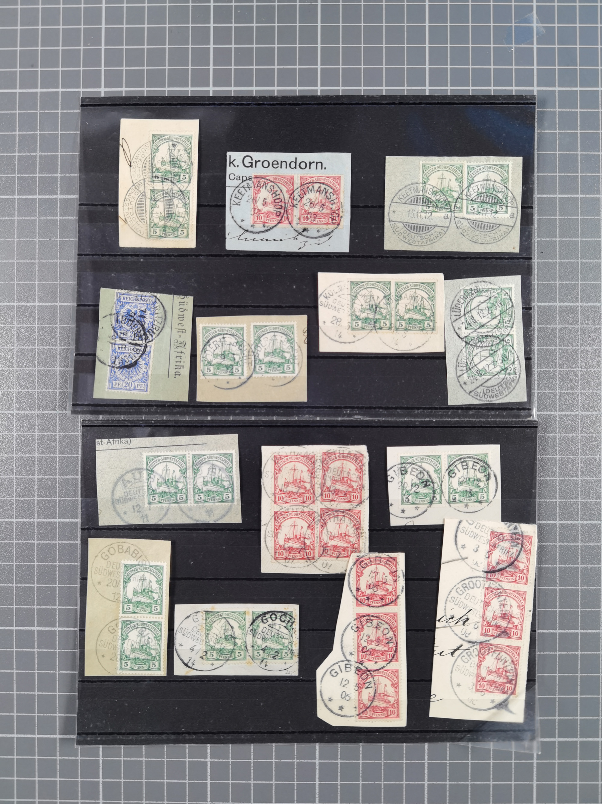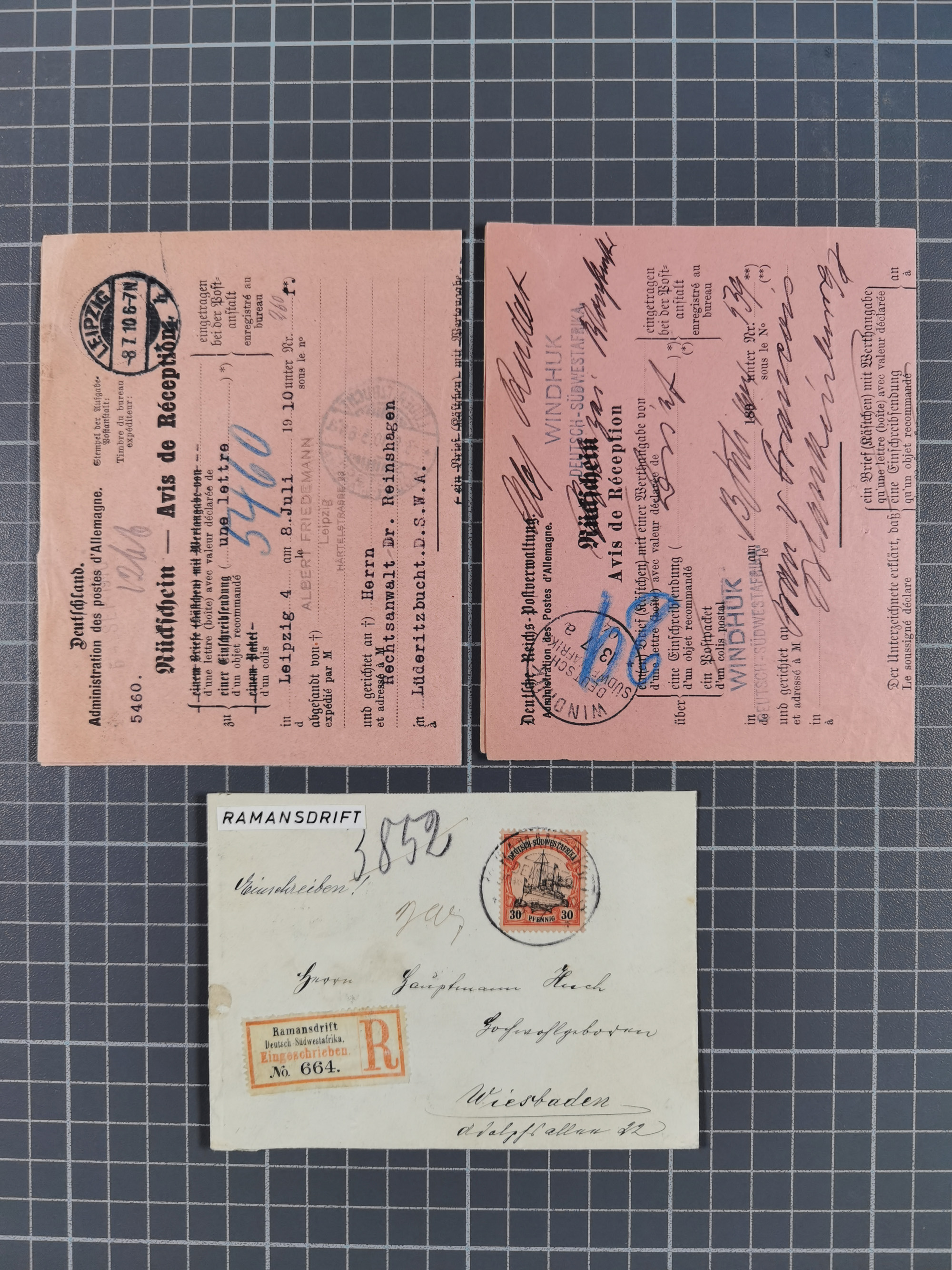1896/1912, 23 R-Briefe ab Vorläufer-Ausgaben inkl. zwei R-Briefen aus der Mandatszeit mit alten deutschen R-Zetteln und zwei Rückscheine für den Auslandsverkehr. Dabei fast nur verschiedene R-Zetteltypen, bessere Stempel mit u.a. Koes, Maltahöhe, Onguati mit Blanko-R-Zettel mit handschriftlichem Zusatz “Onguati”, Wiedhafen und Wilhelmsthal sowie interessante Frankaturen inkl. Mehrfachfrankaturen. Bei vier Briefen ist ein Teil der Adresse ausgeschnitten, ansonsten meist in guter Erhaltung