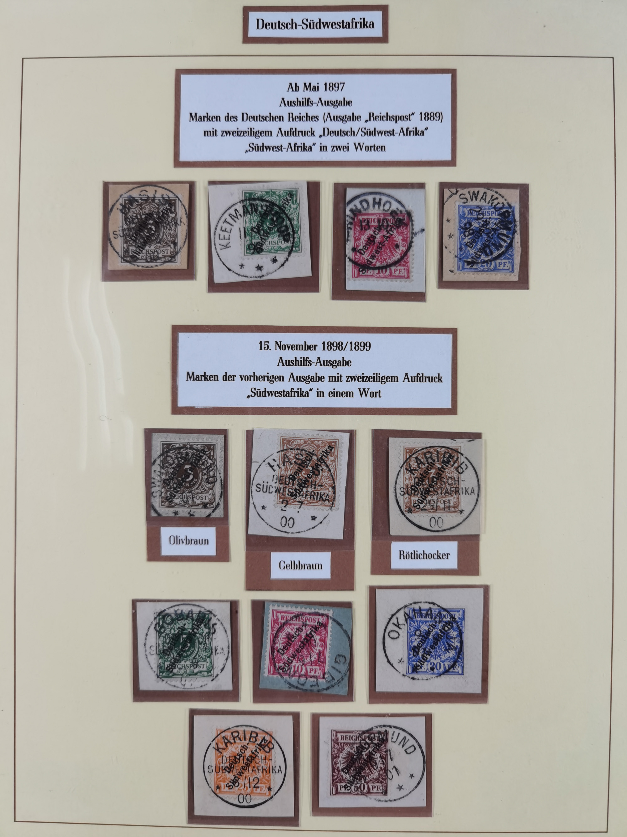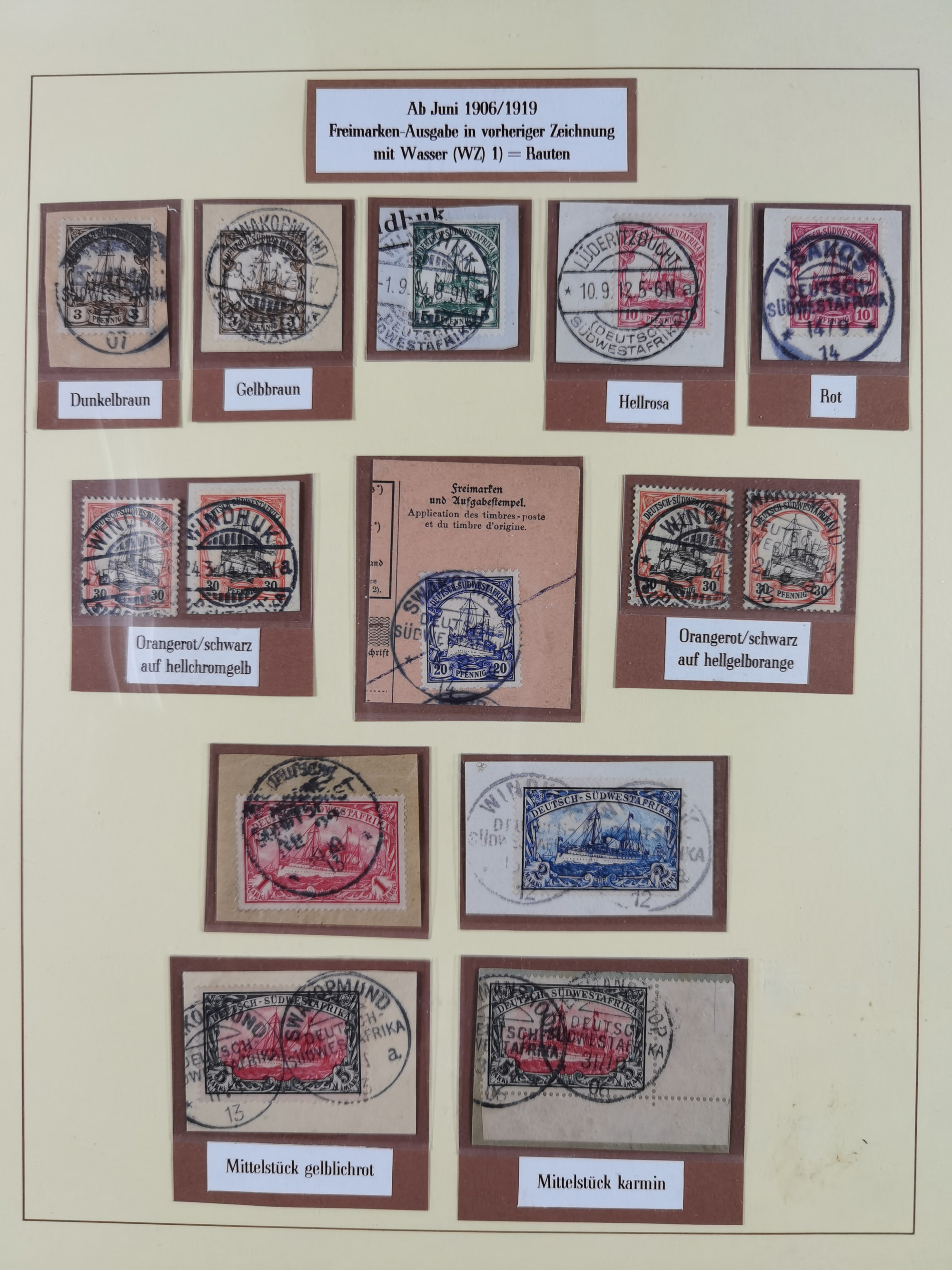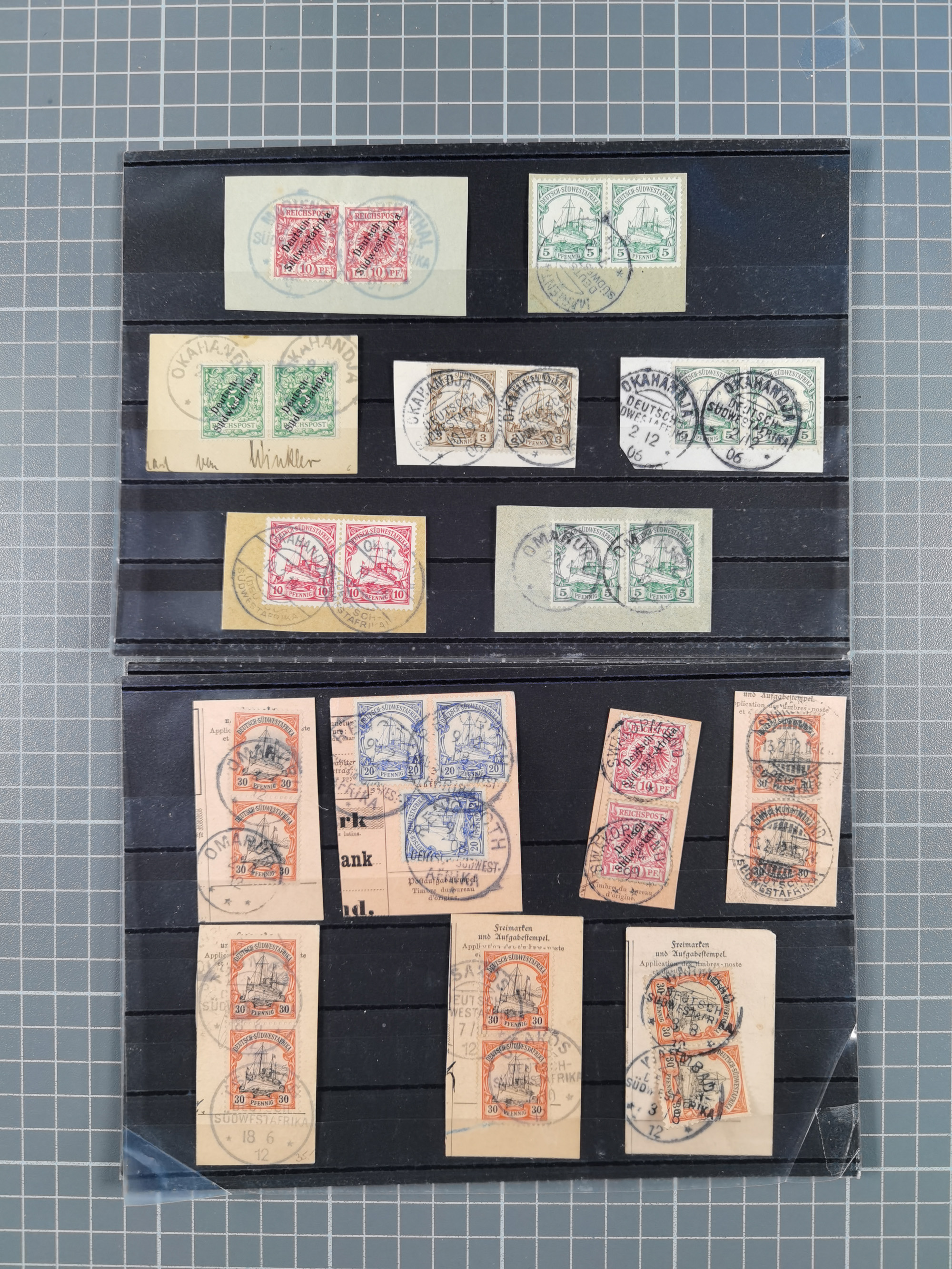 1899 /1913, Partie mit 14 verschiedenen Postscheinen, dabei handschriftliche Ortsvermerke, einige mit Innendienst-Stempeln mit u.a. L1 “Seeheim” und drei Postscheine mit Poststempeln von “ABBABIS” 1906, “HASUUR” 1906 und “ONGUATI” 1907. Dazu Postkarte verwendet als Einlieferungsschein 1907 mit Dienstsiegel von Outjo, übliche Faltspuren, in guter Erhaltung