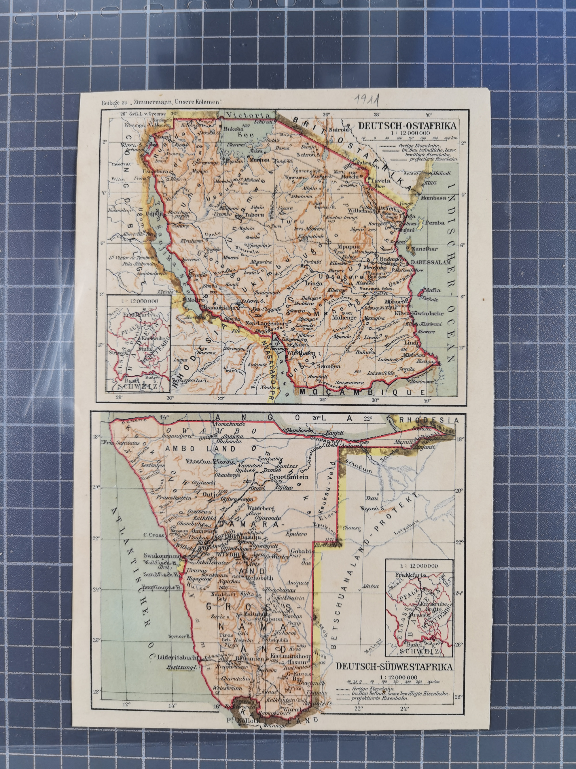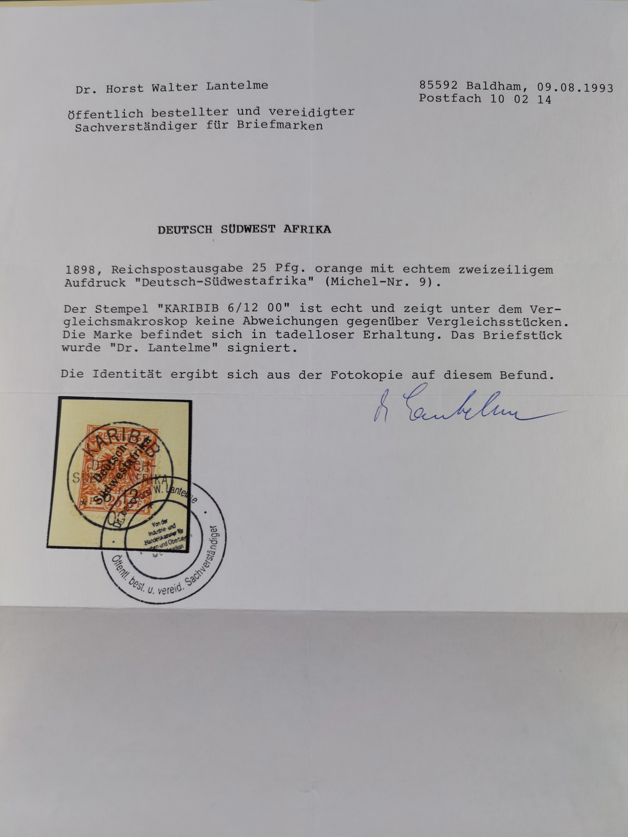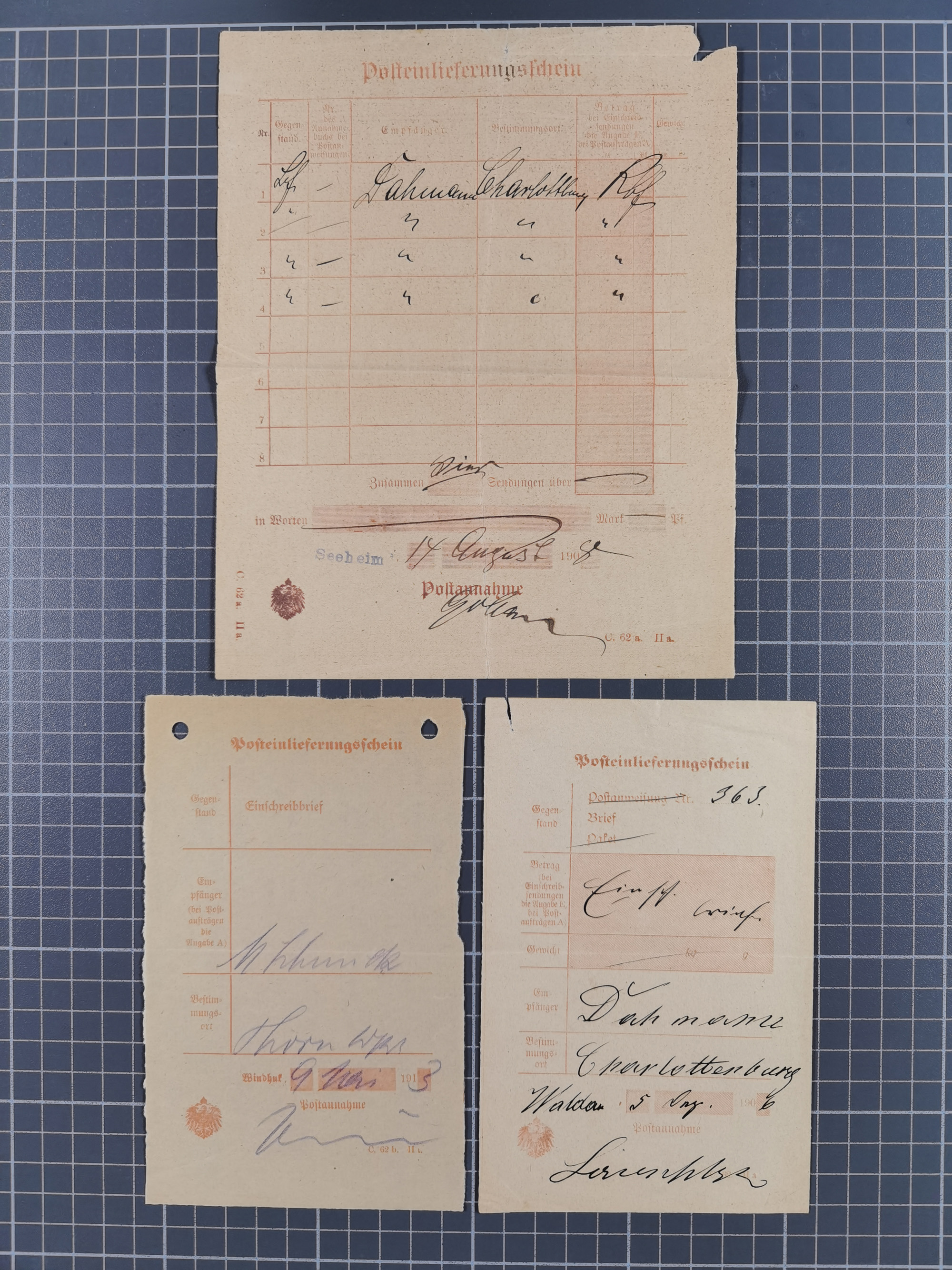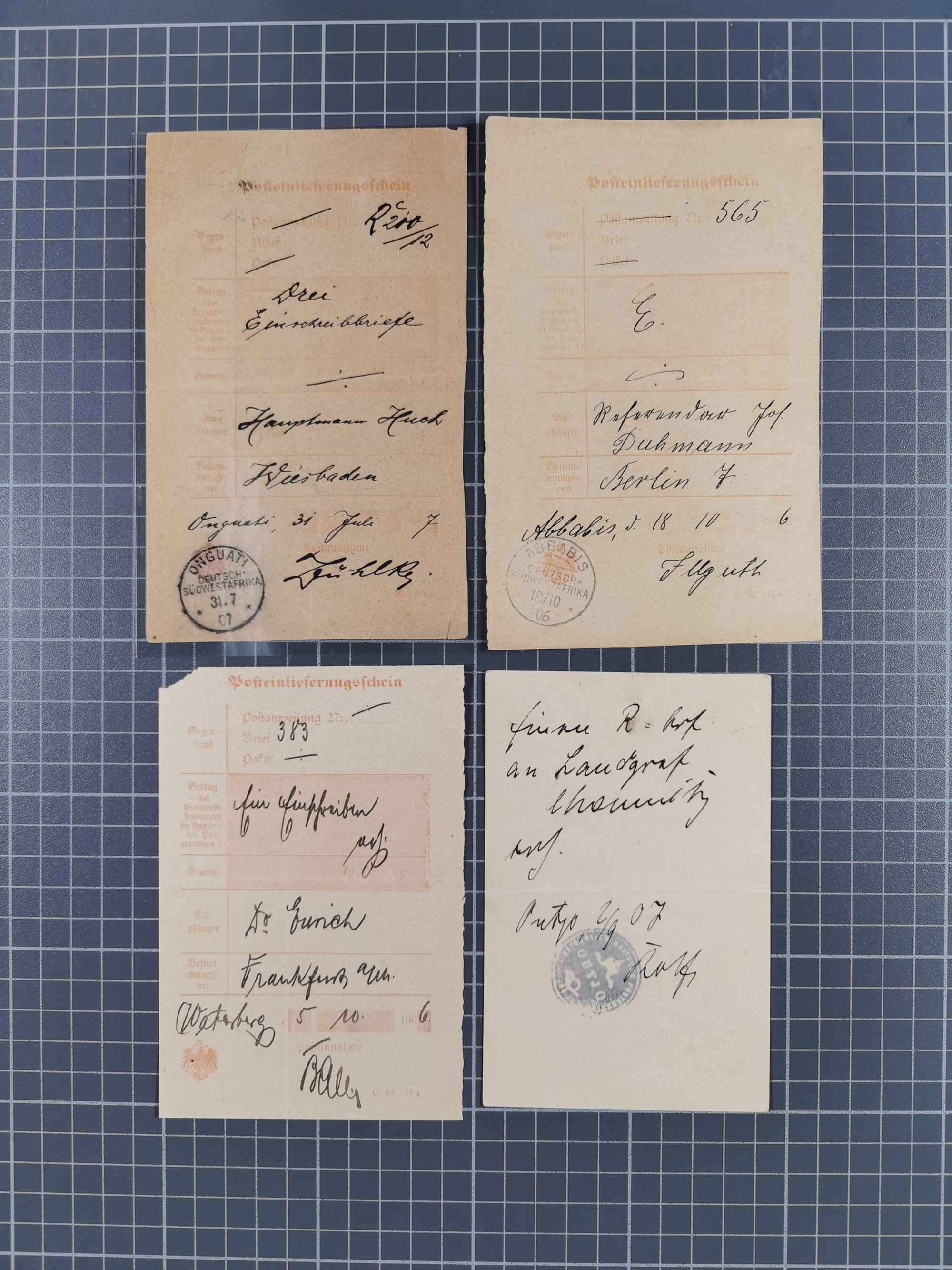 1899 /1913, Partie mit 14 verschiedenen Postscheinen, dabei handschriftliche Ortsvermerke, einige mit Innendienst-Stempeln mit u.a. L1 “Seeheim” und drei Postscheine mit Poststempeln von “ABBABIS” 1906, “HASUUR” 1906 und “ONGUATI” 1907. Dazu Postkarte verwendet als Einlieferungsschein 1907 mit Dienstsiegel von Outjo, übliche Faltspuren, in guter Erhaltung