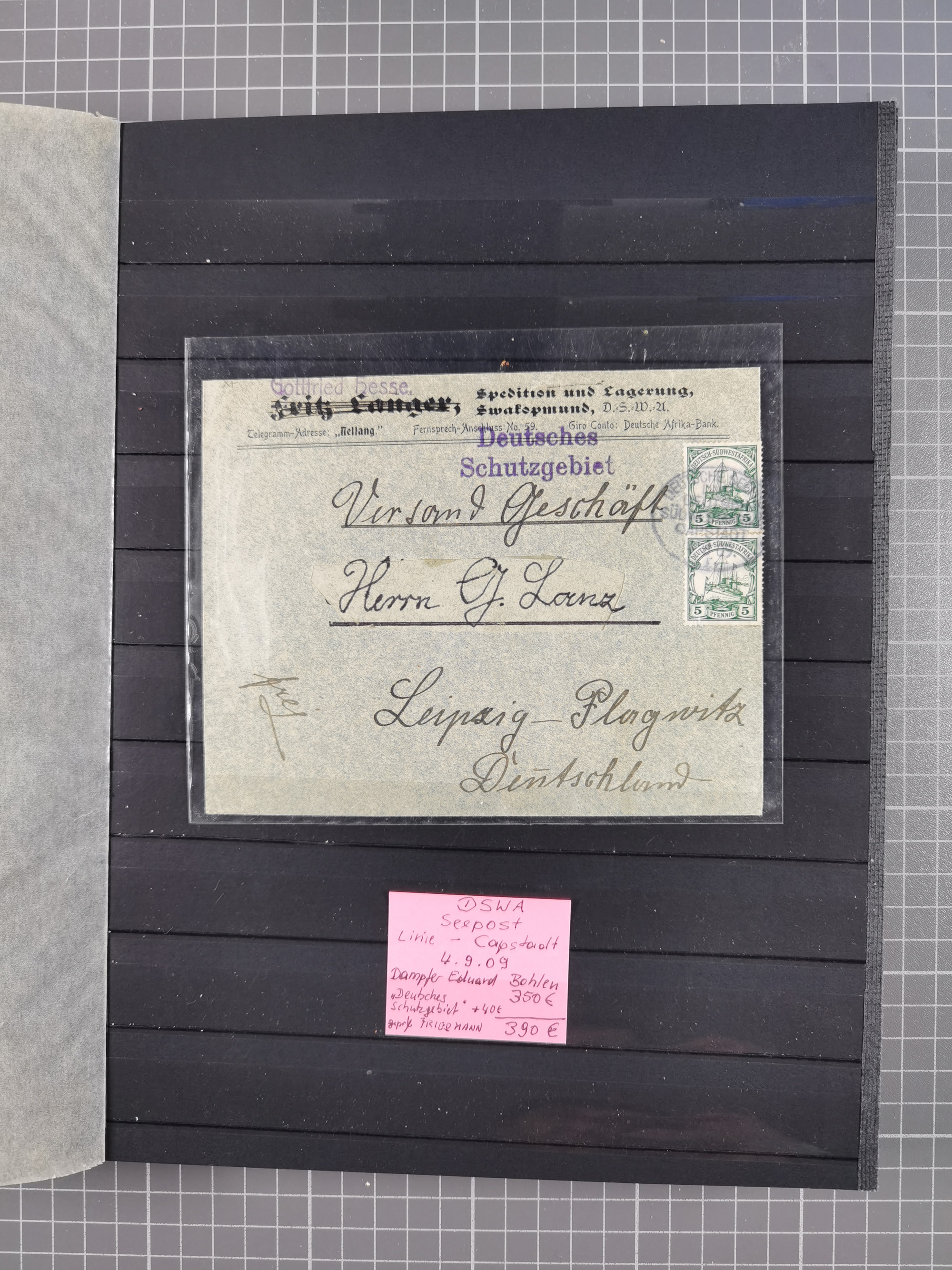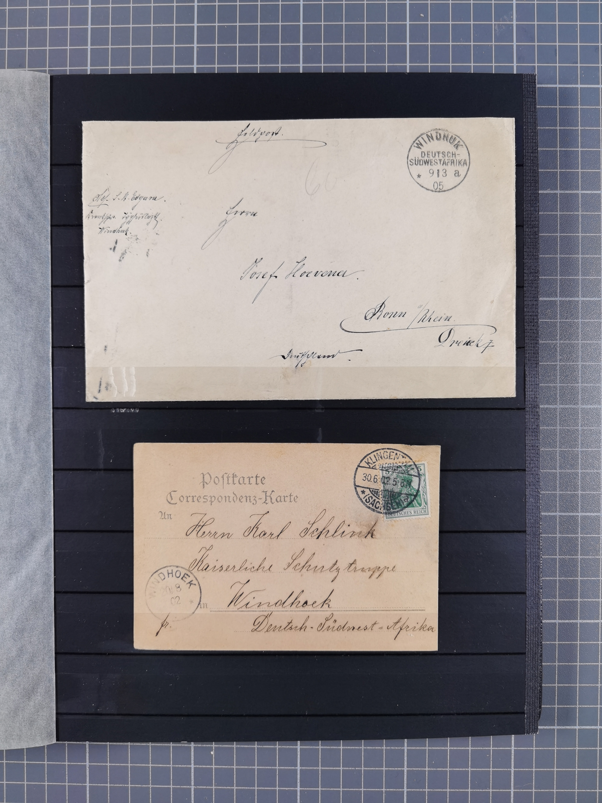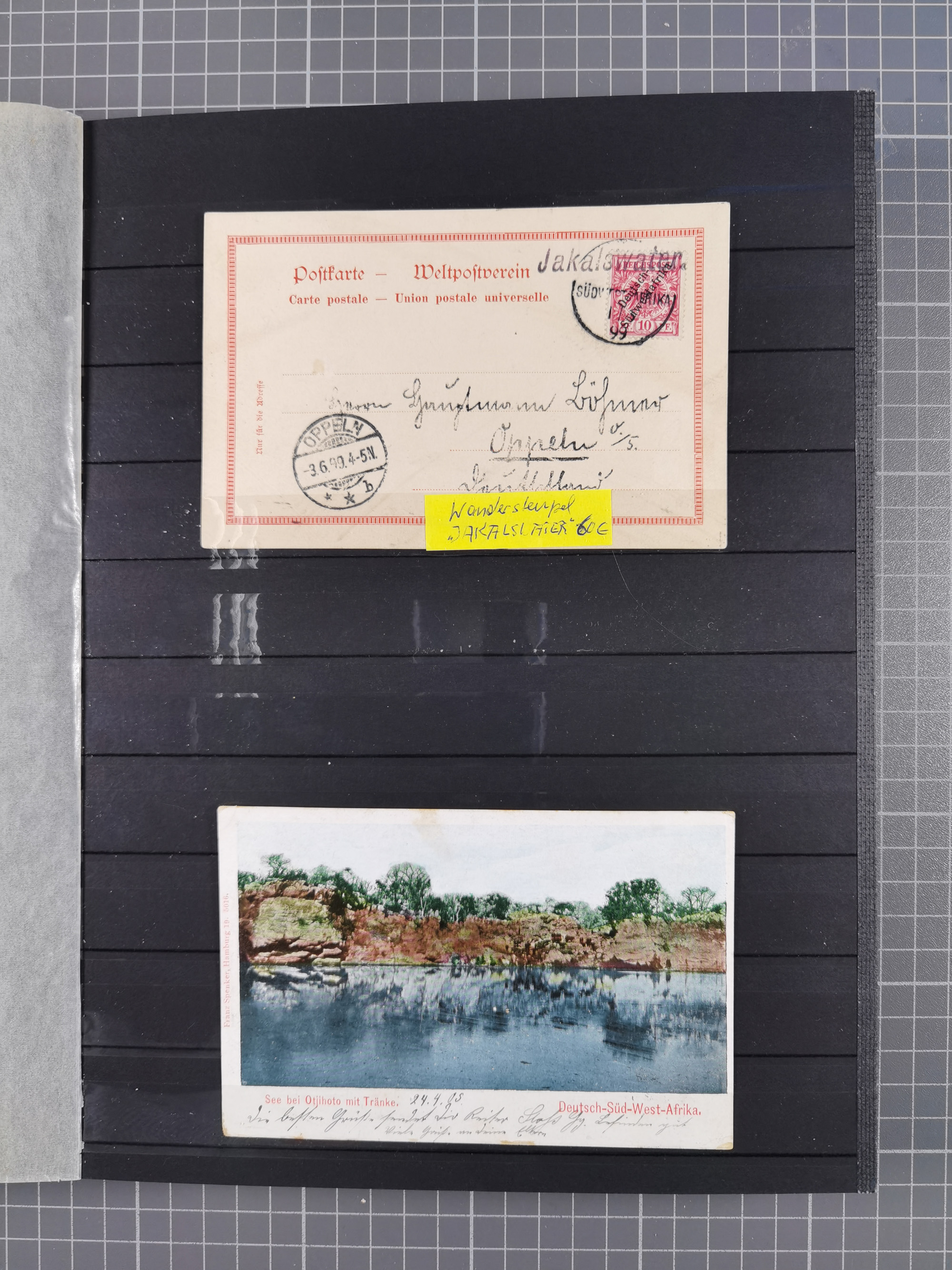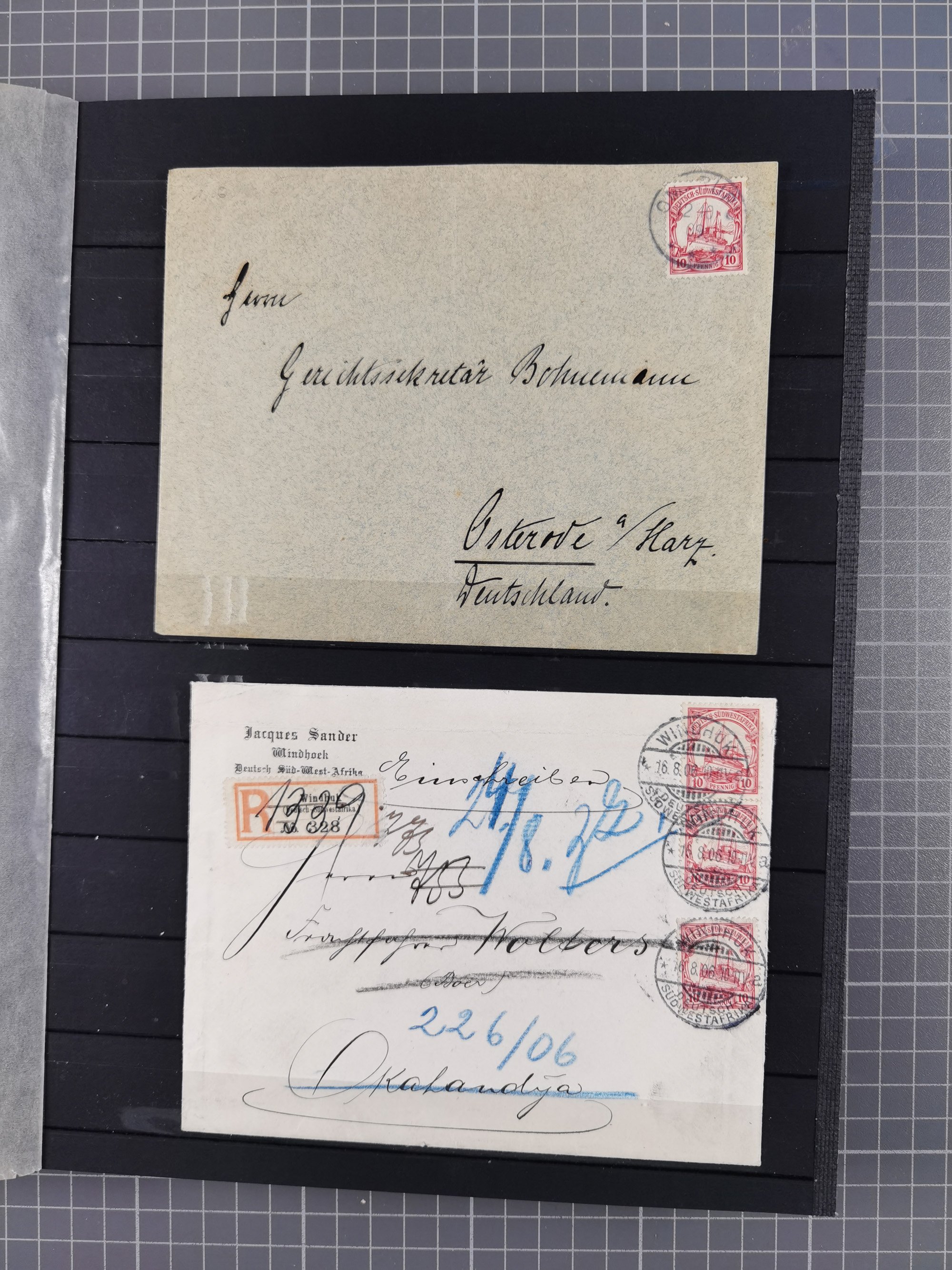 1898/1906(ca.), Briefalbum mit 26 Briefen, viele Ansichtskarten und Ganzsachen, dabei etliche bessere Belege u.a. Seepostbrief LINIE DSWA-Capstadt Dampfer Eduard Bohlen", E-Brief, GZ mit Wanderstempel Jakalswater", usw., meist gute Erhaltung