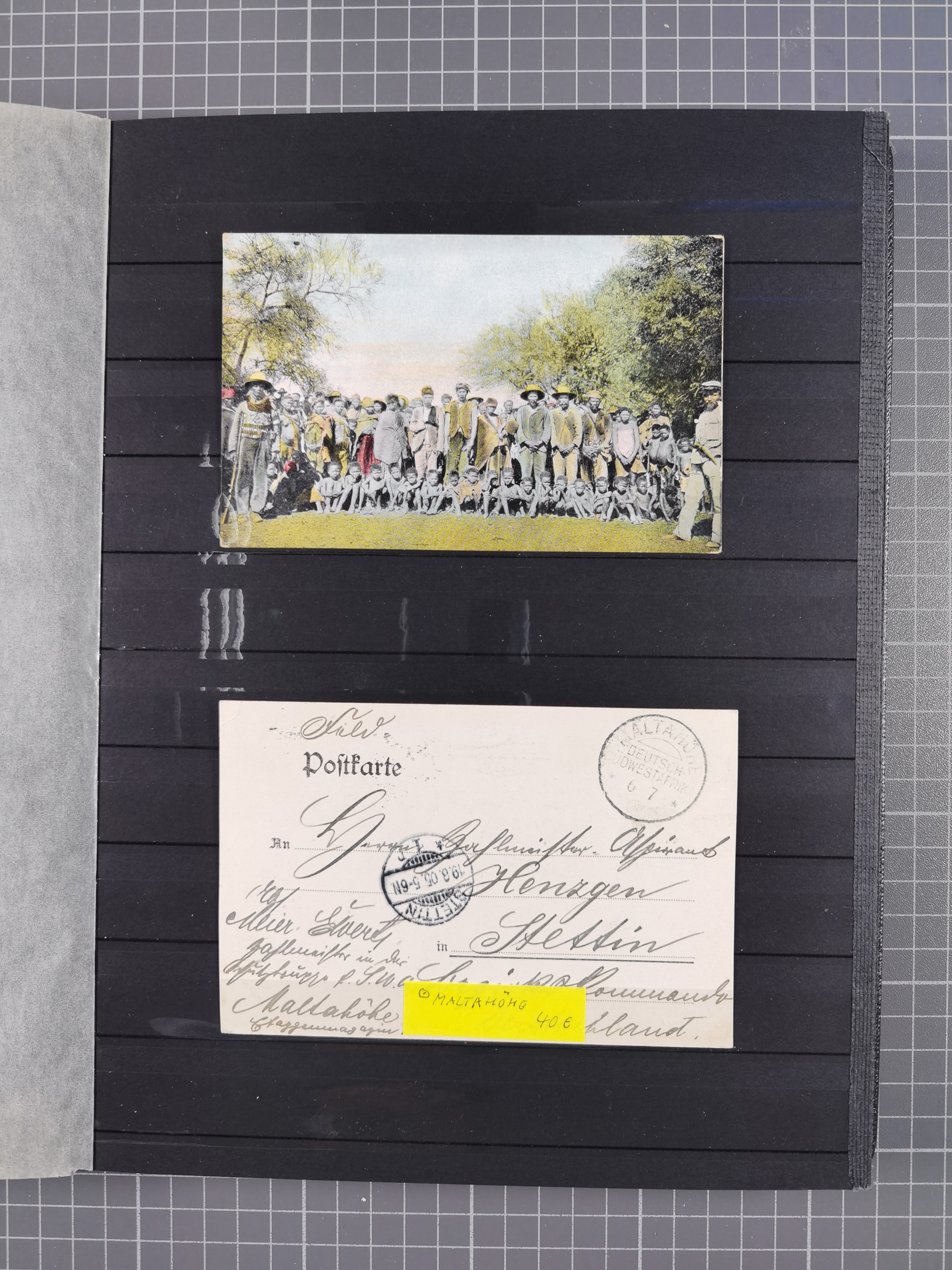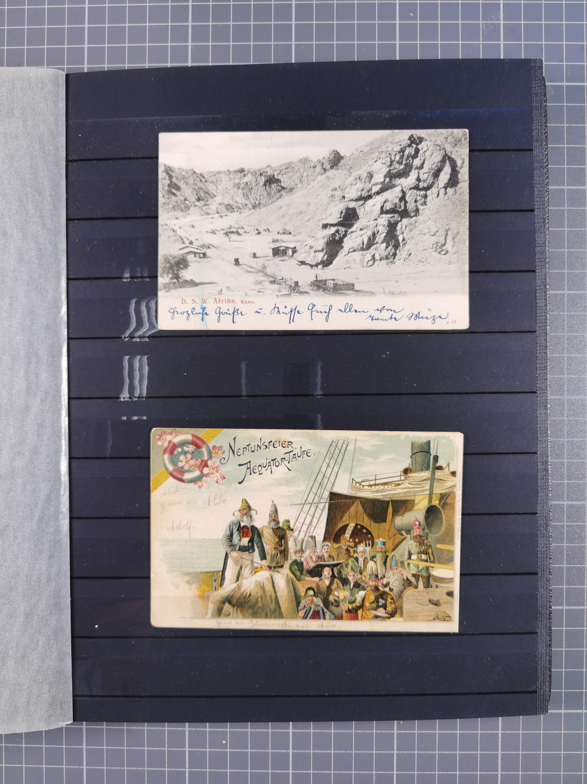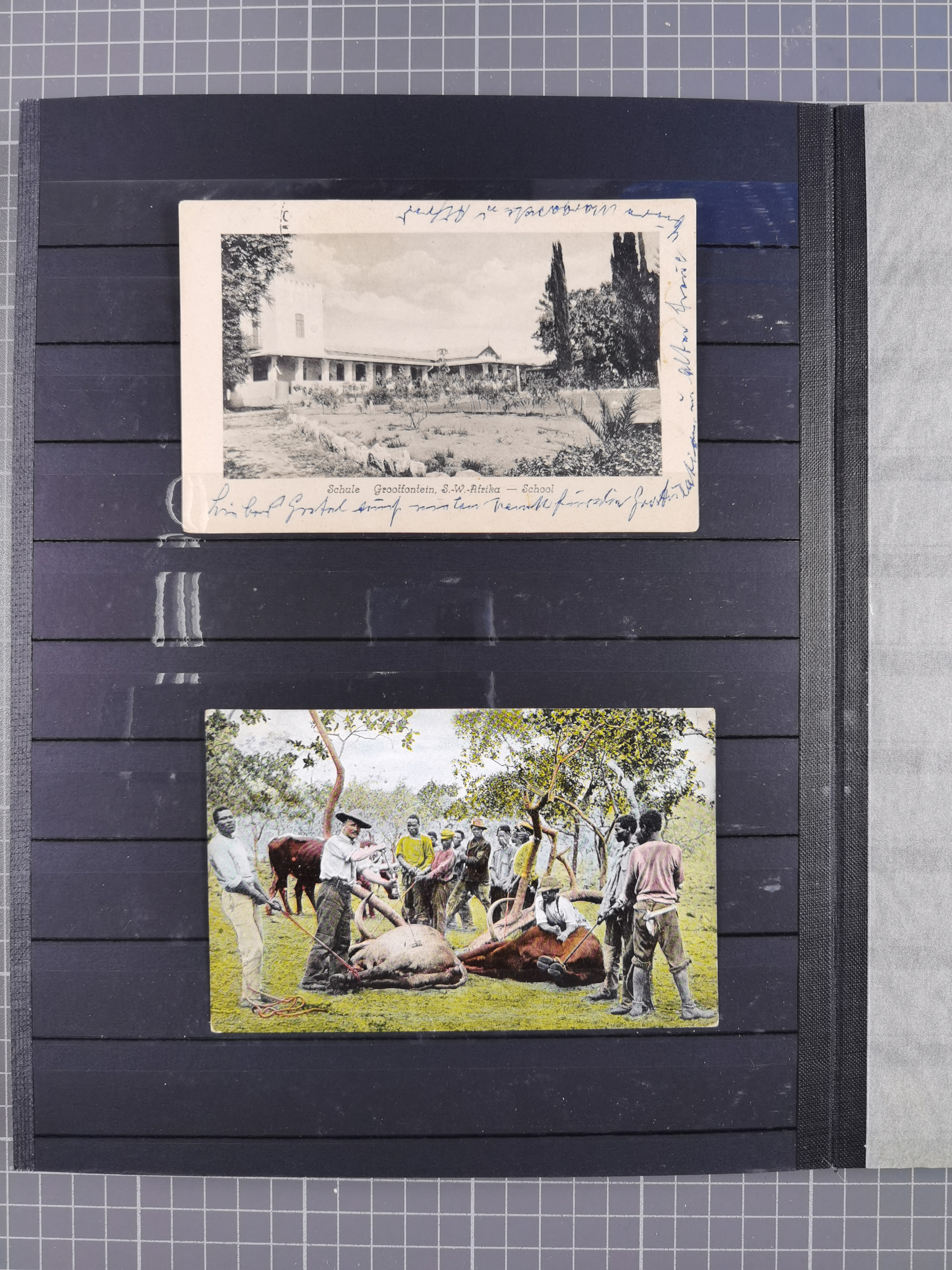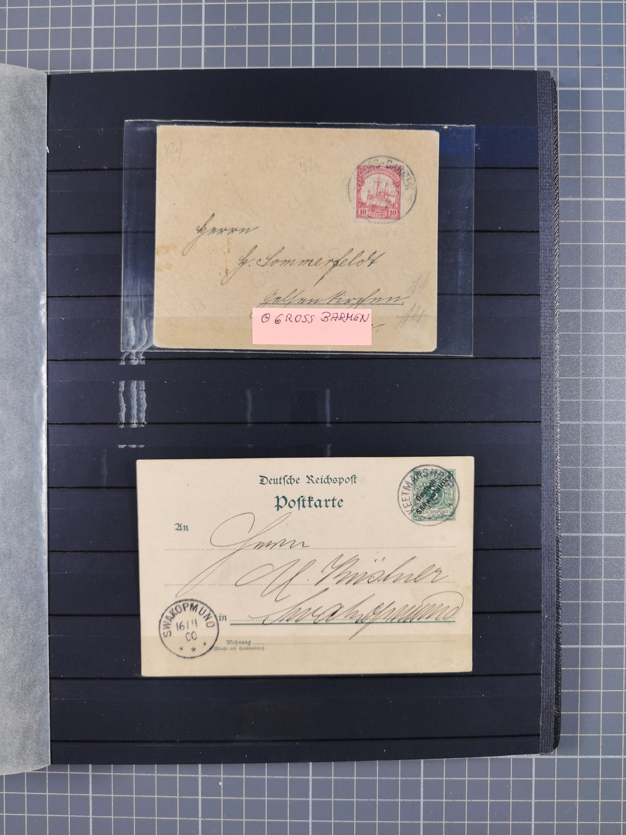 1898/1906(ca.), Briefalbum mit 26 Briefen, viele Ansichtskarten und Ganzsachen, dabei etliche bessere Belege u.a. Seepostbrief LINIE DSWA-Capstadt Dampfer Eduard Bohlen", E-Brief, GZ mit Wanderstempel Jakalswater", usw., meist gute Erhaltung