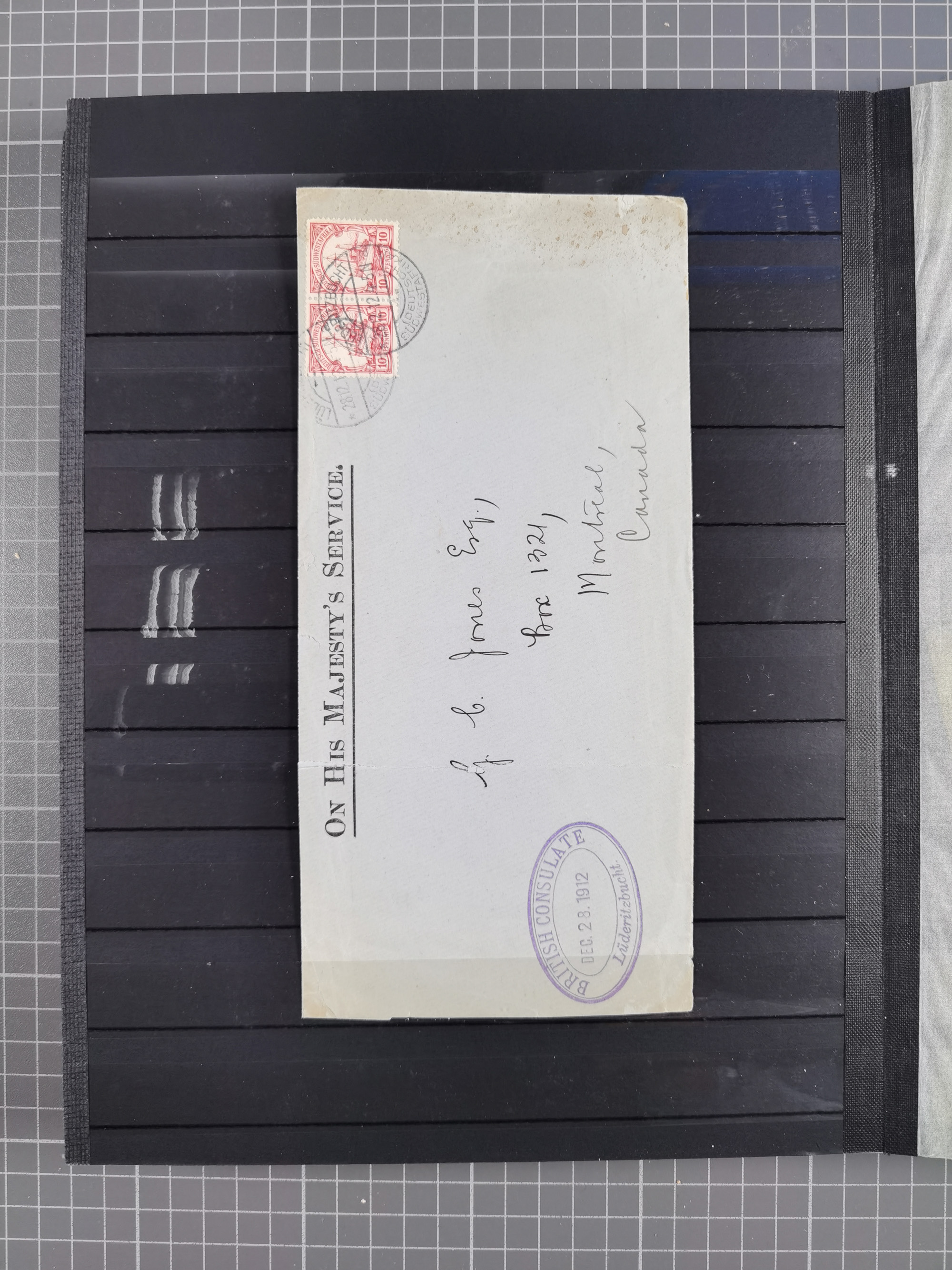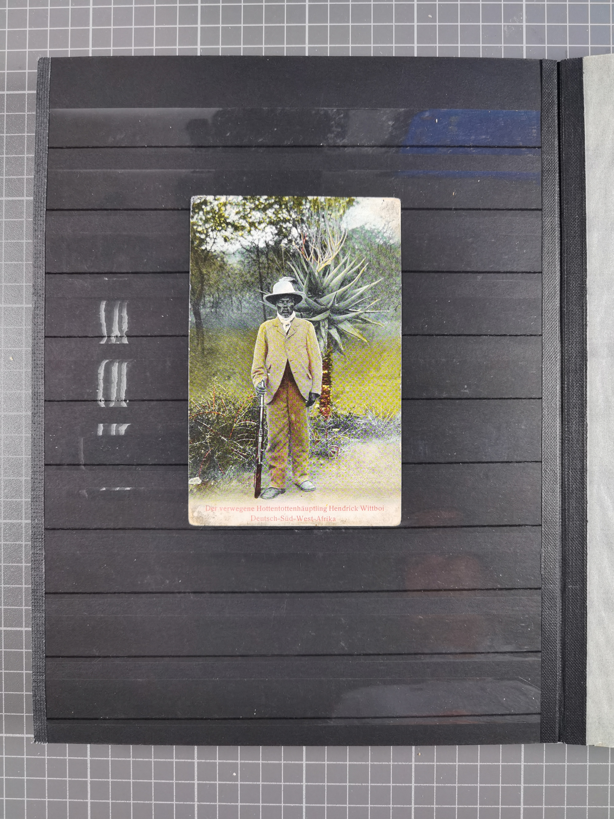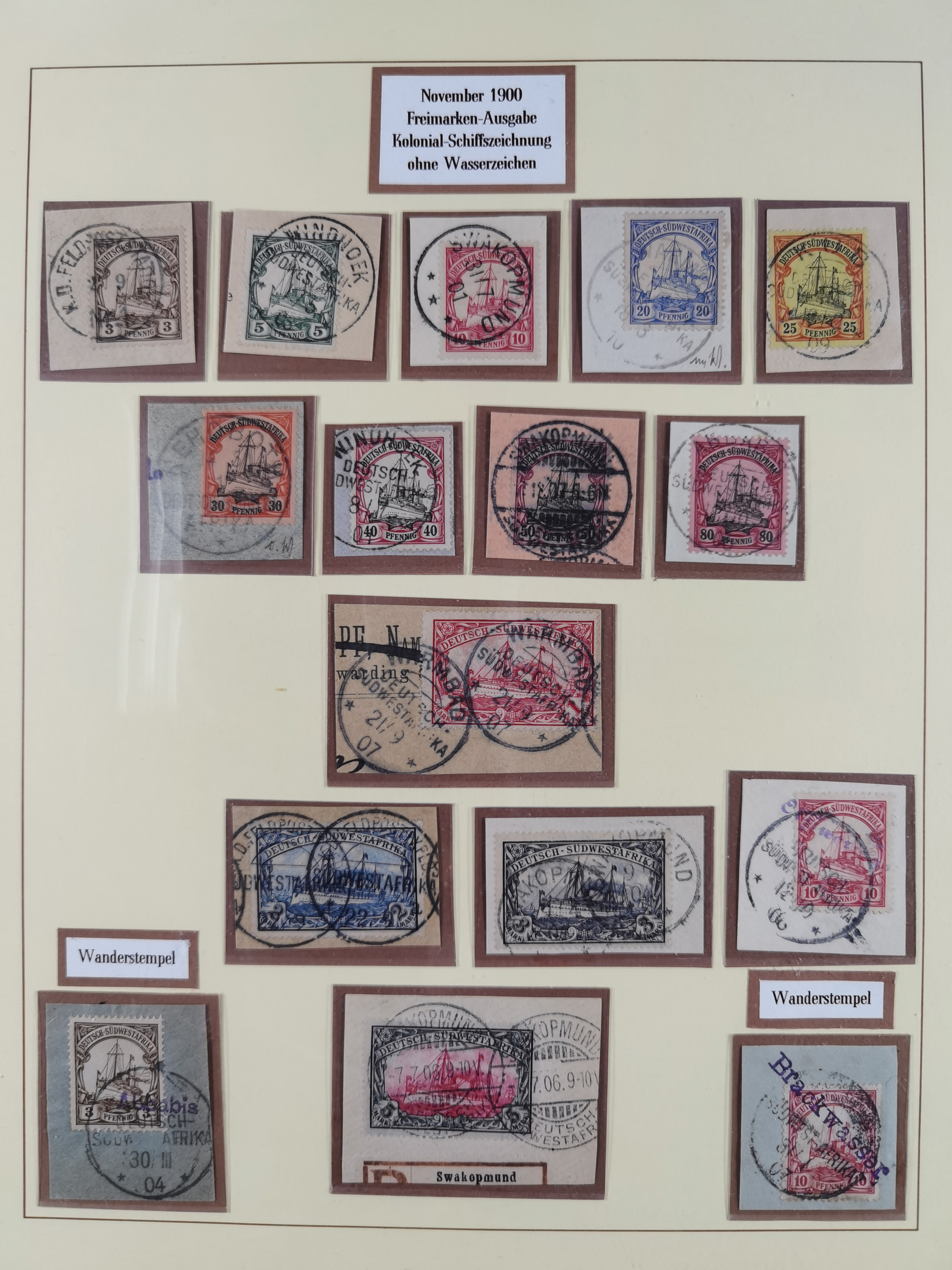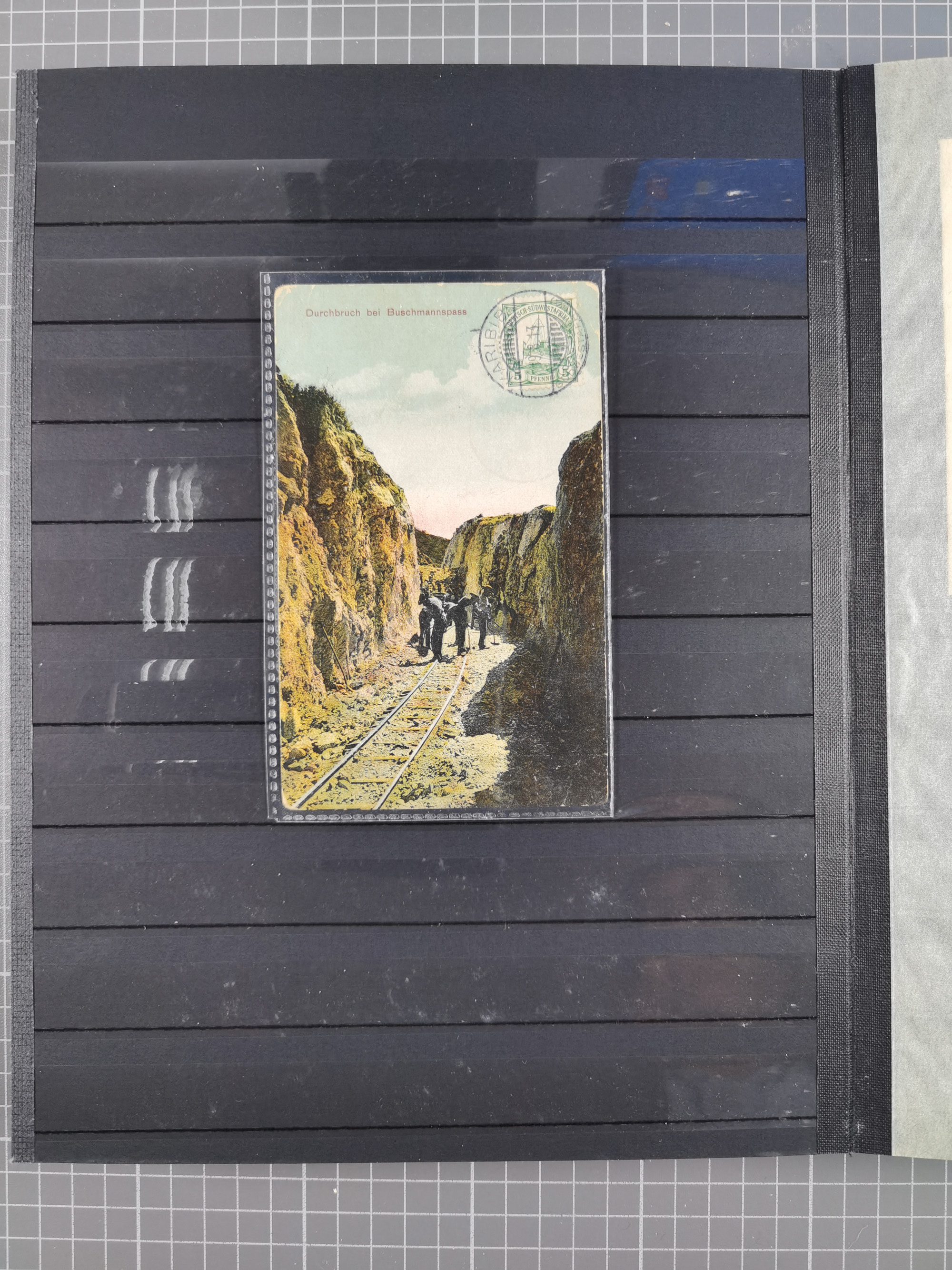 1898/1906(ca.), Briefalbum mit 26 Briefen, viele Ansichtskarten und Ganzsachen, dabei etliche bessere Belege u.a. Seepostbrief LINIE DSWA-Capstadt Dampfer Eduard Bohlen", E-Brief, GZ mit Wanderstempel Jakalswater", usw., meist gute Erhaltung