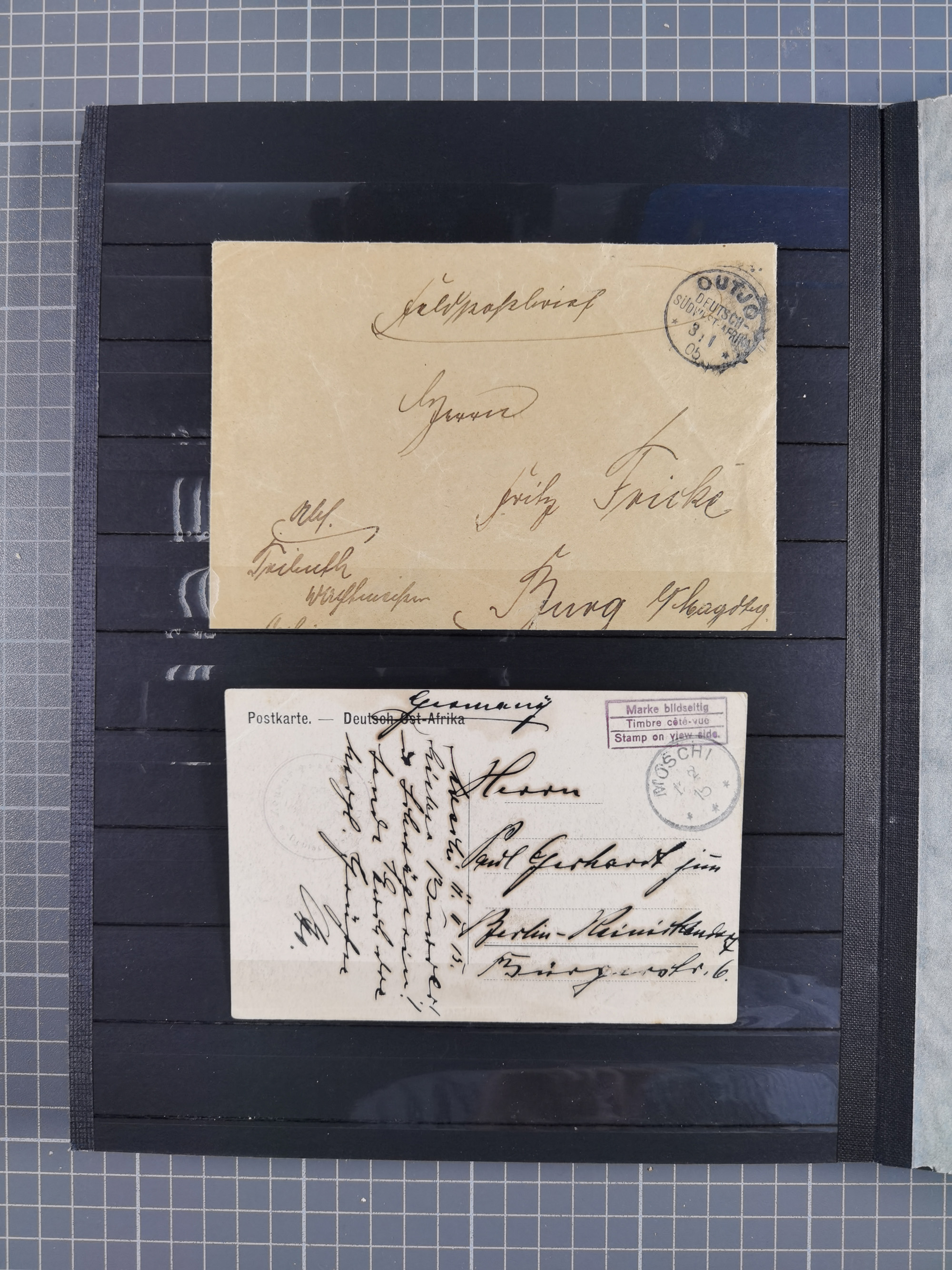 1890/1909 (ca.), DSWA und DOA, Partie mit 39 Briefen und Karten, interessanten Frankaturen und Verwendungen, dabei u.a DOA Mi.-Nr. 6d (x2), 7-9 mit “DEUSTCHE SEEPOST OST-AFRIKANISCHE HAUPTLINIE 7/10 00” auf eingeschriebenem Brief (KB Provinsky BPP), Schiffspost mit L2 “AUS WESTAFRIKA” auf 20 Pfg. auf Brief nach Hamburg mit rückseitigem Ankunftsstempel, etc., meist in guter Erhaltung