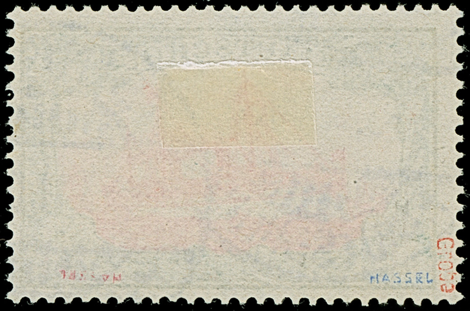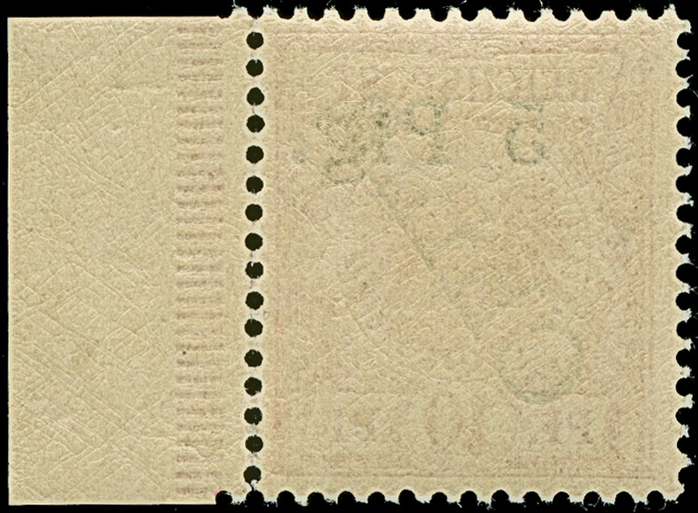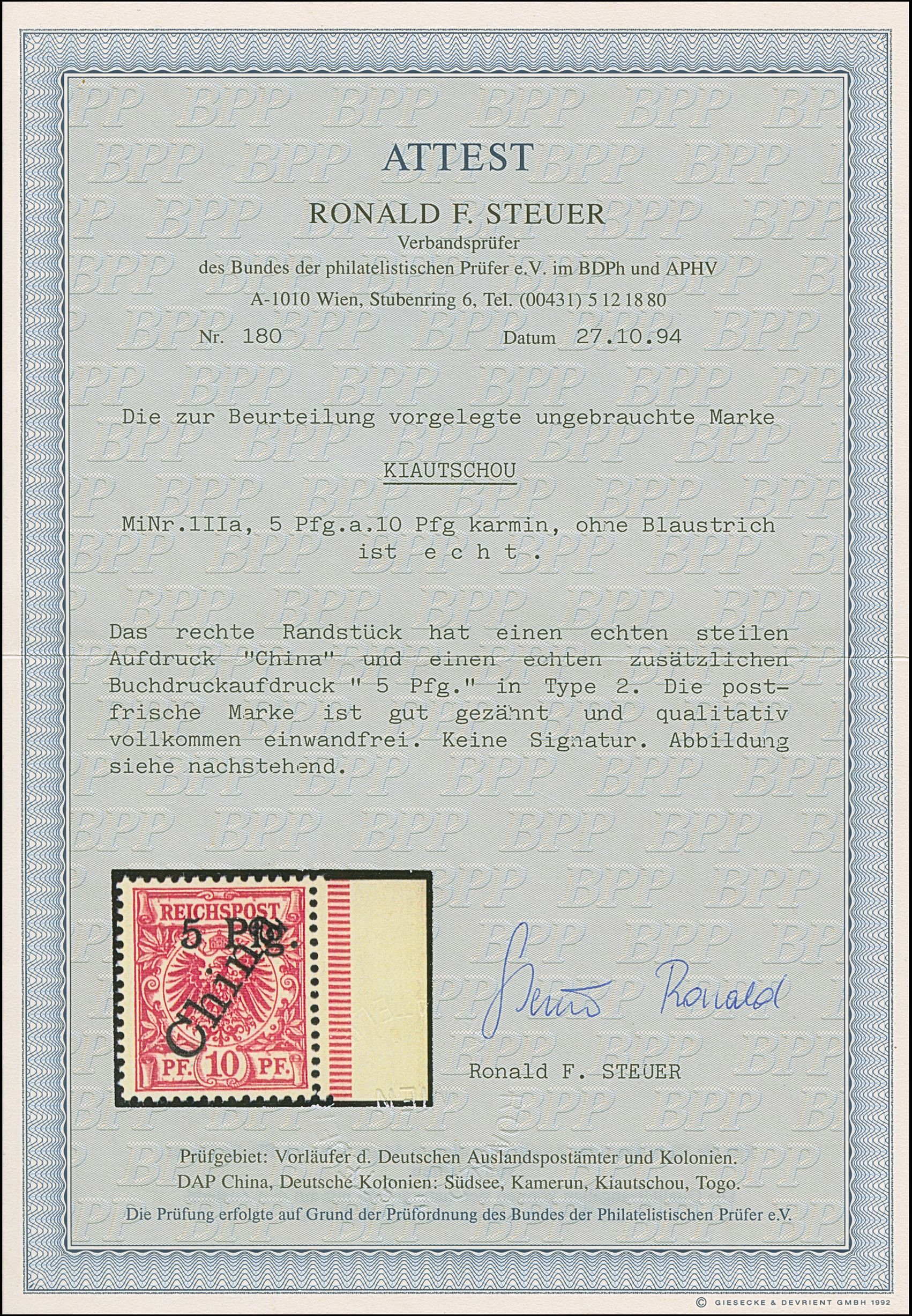 1900, 5 Pfg. auf 10 Pfg. mit steilem Aufdruck ohne Blaustrich (Aufdrucktype 2) mit Bogenrand rechts (vorgefaltet). Die farbfrische und postfrische Marke ist tadelloser Erhaltung, unsigniert mit Fotoattest R. Steuer BPP (1994)