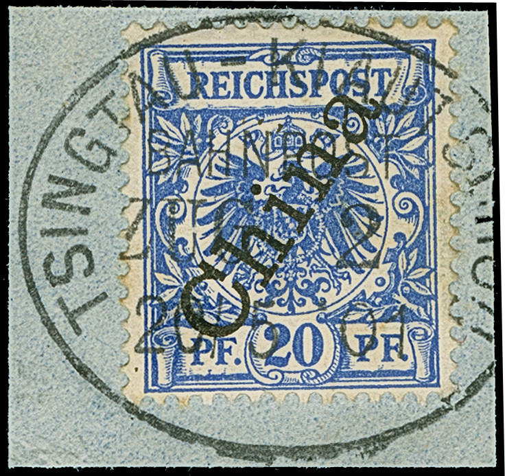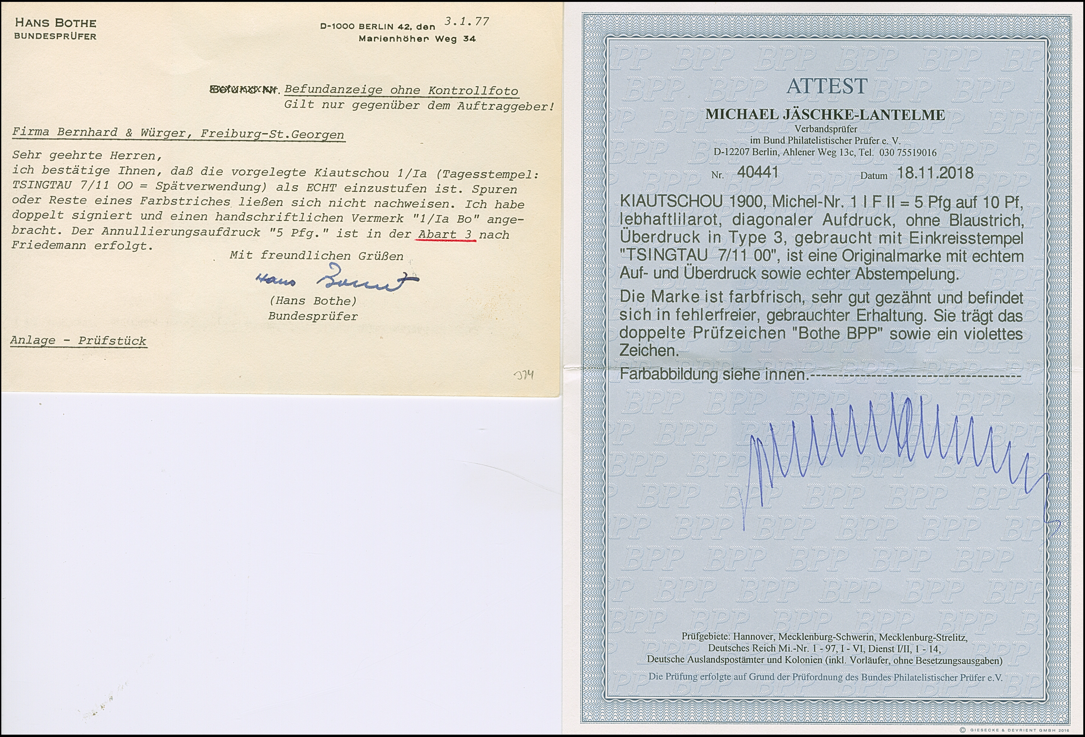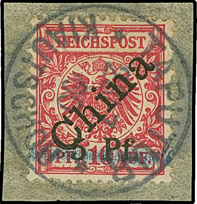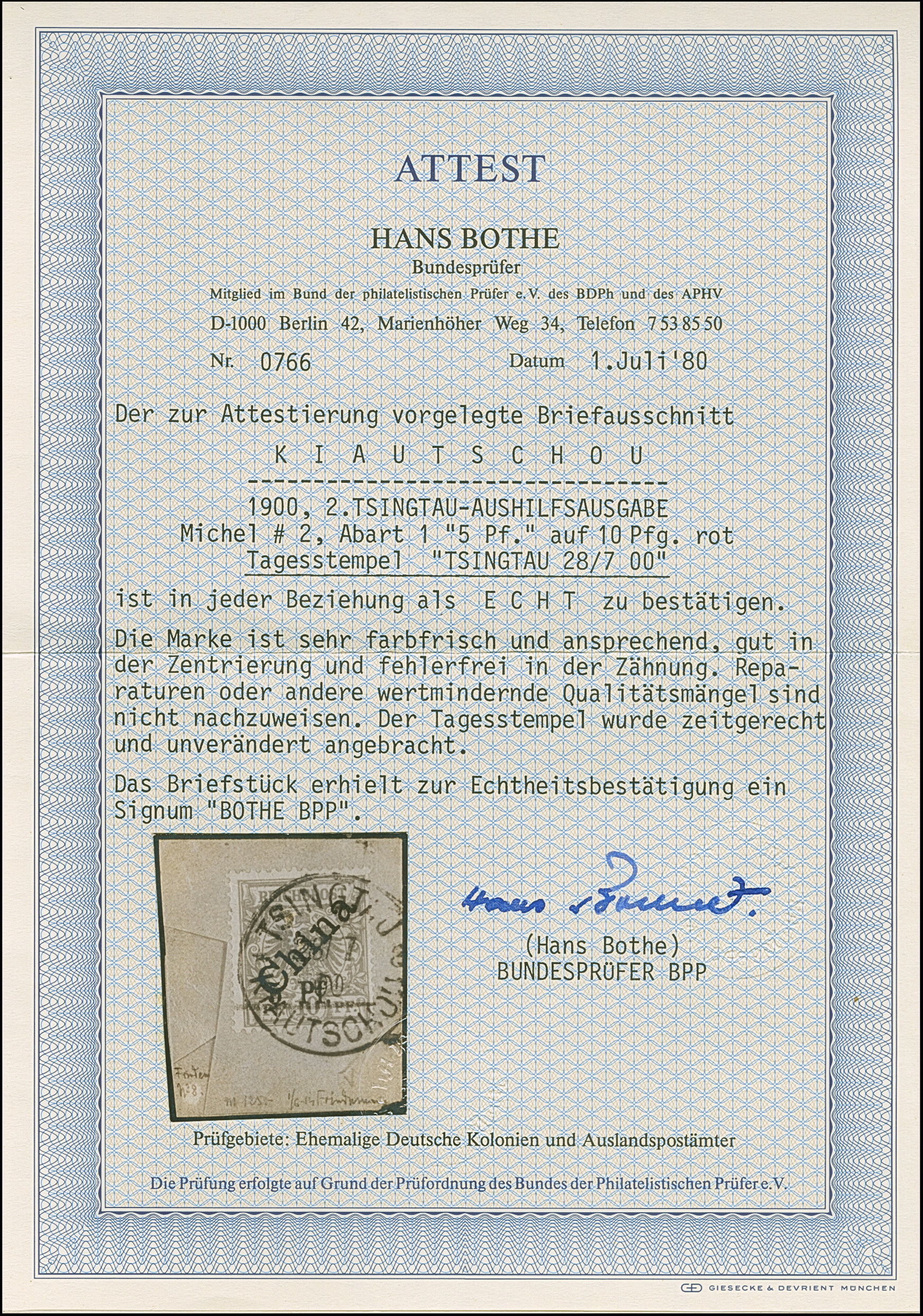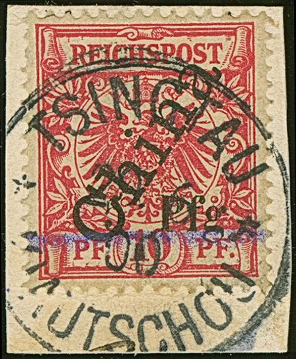 1900, 5 Pf auf 10 Pfg. mit diagonalem Aufdruck, Aufdrucktype 1, klar mit Stempel “TSINTAU KIAUTSCHOU *a 28.7.00” auf Briefstück. Die farbfrische Marke ist gut gezähnt und in einwandfreier Erhaltung, signiert Bothe BPP mit Fotoattest (1980)
