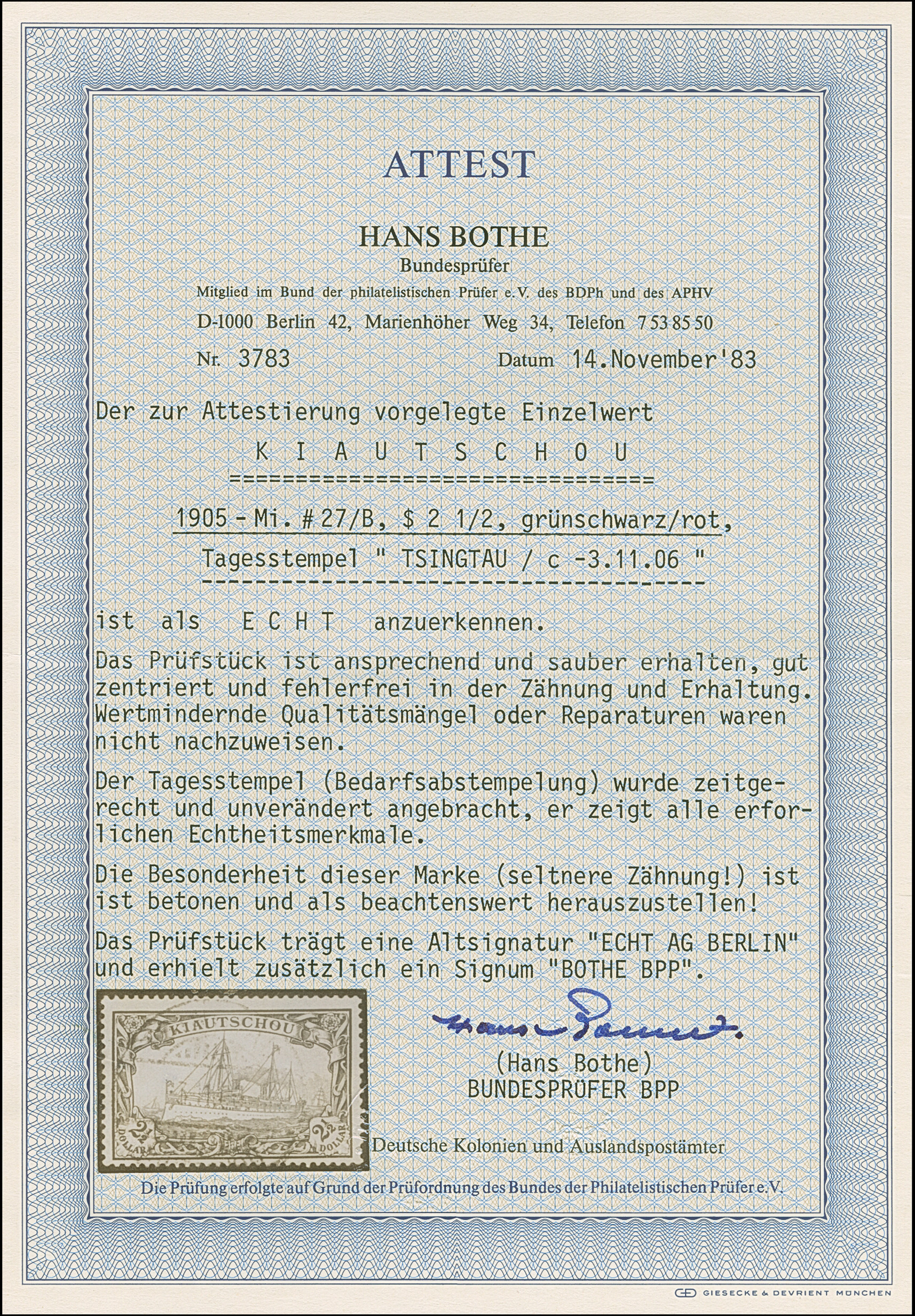 1901, Kaiseryacht 5 M. mit klarem Stempel “TSINGTAU KIAUTSCHOU *a20.2.04”, in einwandfreier Erhaltung, u.a. sign. Bothe BPP