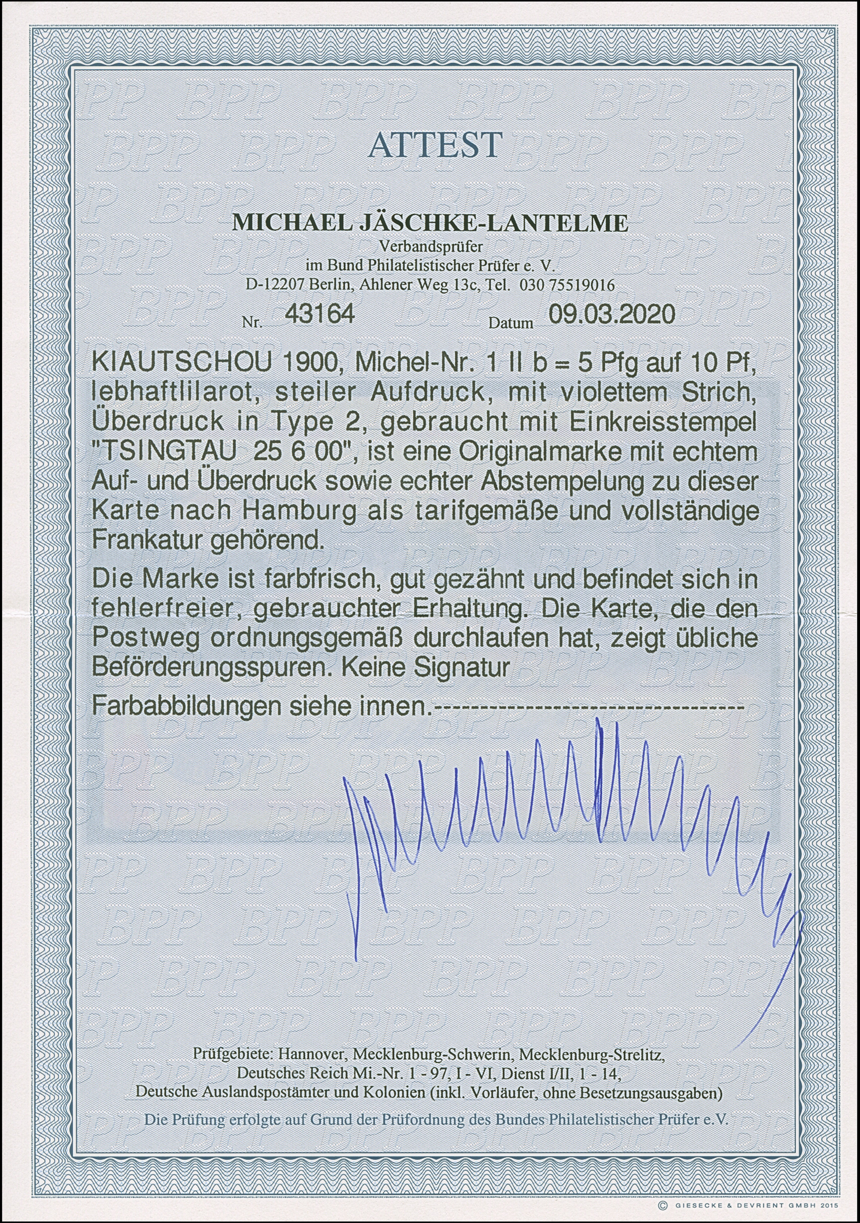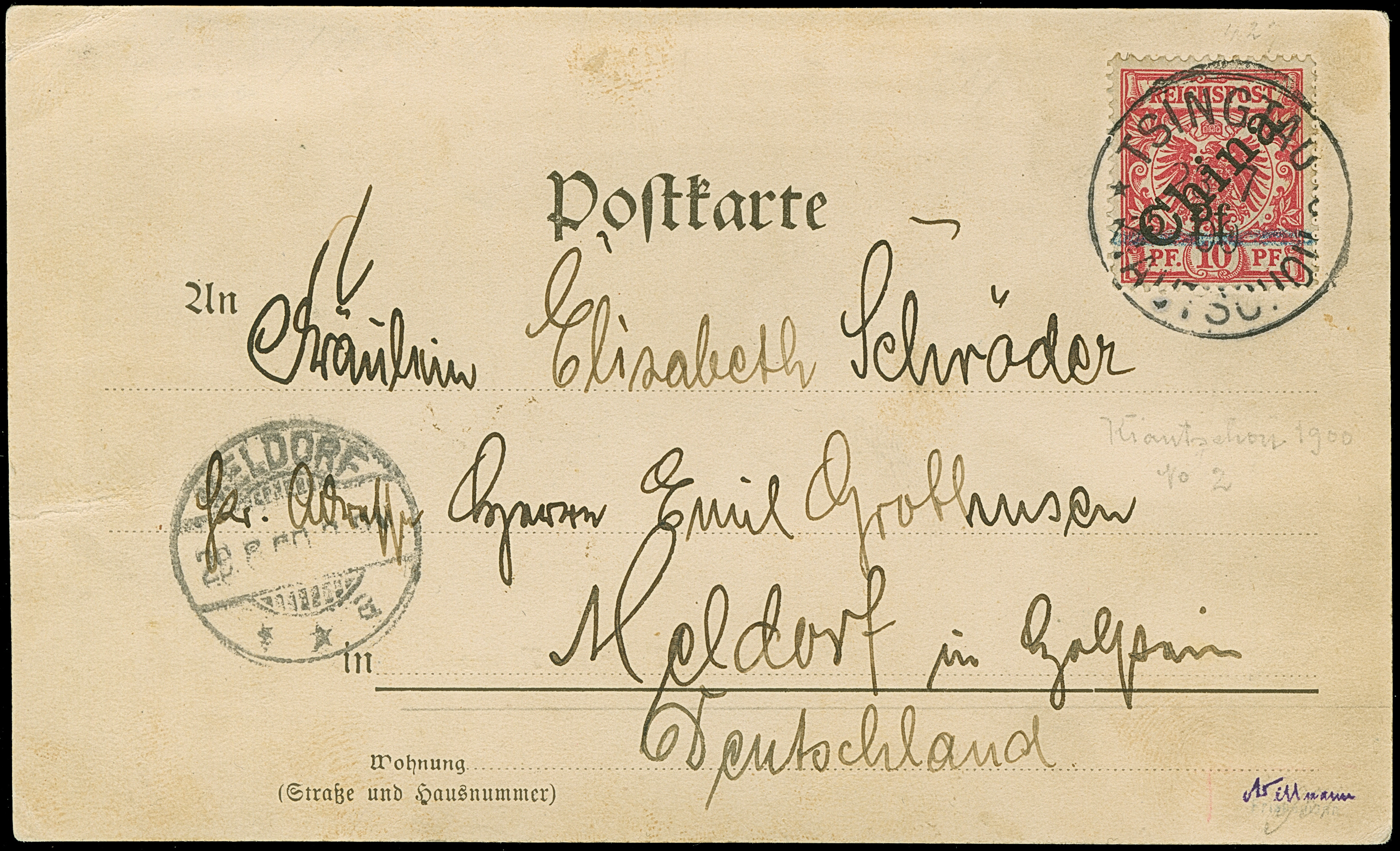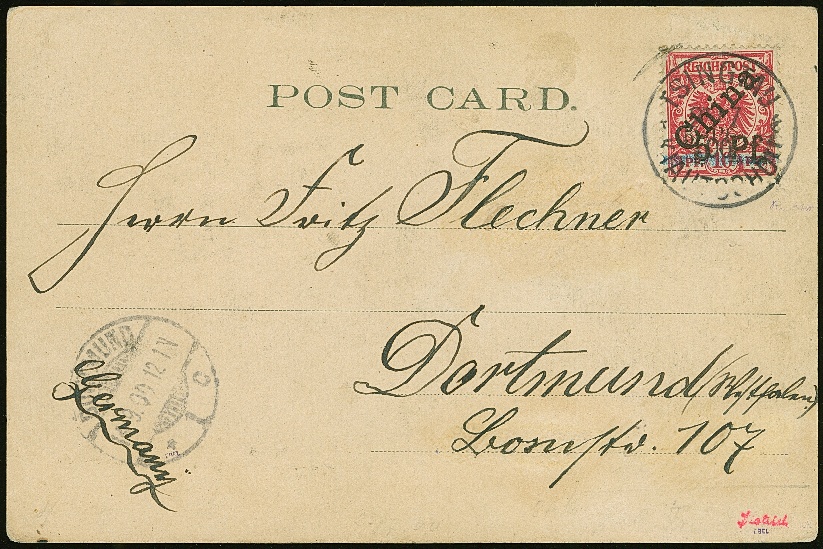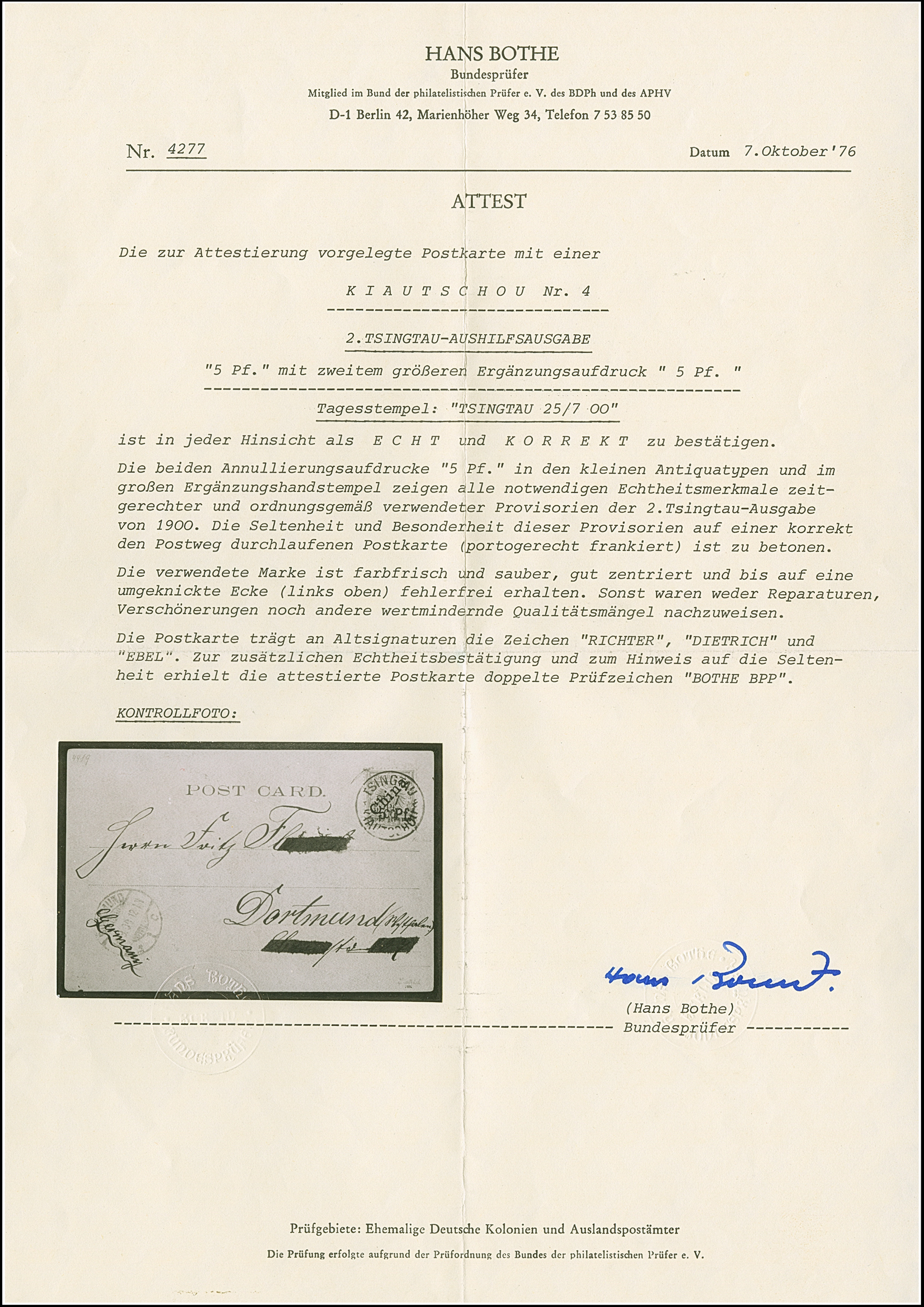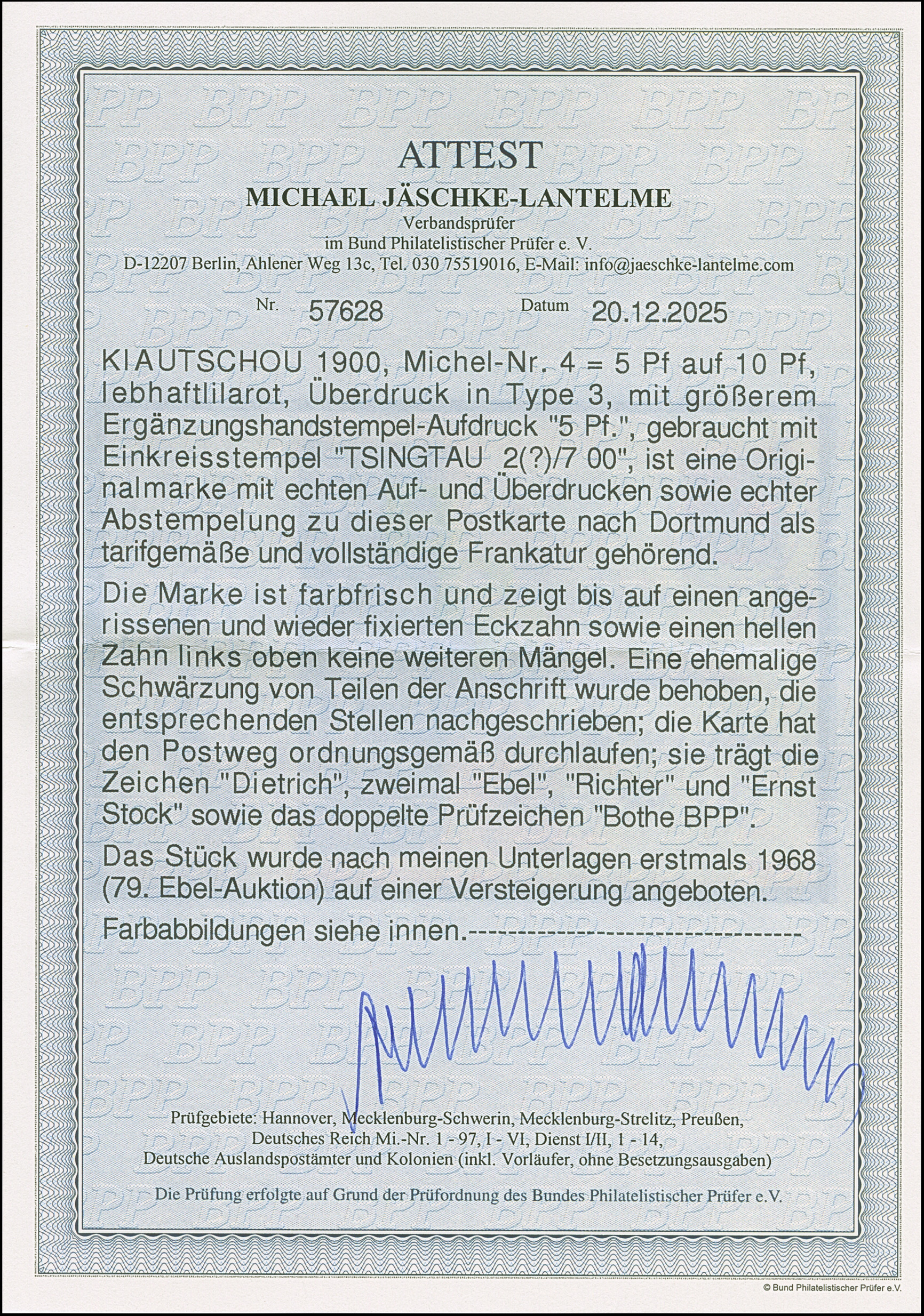 1900. 5 Pf auf 10 Pfg. lebhaftlilarot mit zusätzlichem Handstempel “5 Pf.” (größere Type), mit Stempel “TSINGTAU KIAUTSCHOU 23.7.00” auf Postkarte mit Text nach Dortmund mit Ankunftsstempel. Die Marke mit kleinem Eckzahnfehler bzw. einen hellen Zahn links oben und Karte mit Patina bzw. ein Teil der ursprünglich geschwärzter Adresse wurde entfernt und nachbeschriftet, ansonsten in guter Erhaltung. Diese Marke zählt zu den Seltenheiten von Kiautschou und ist in nur ganz wenigen gebrauchten Exemplaren bekannt, signiert Dietrich, Ebel, Richter und Ernst Stock sowie doppelt signiert Bothe BPP mit Fotoattest (1976) und Fotoattest Jäschke-L. BPP (2025)