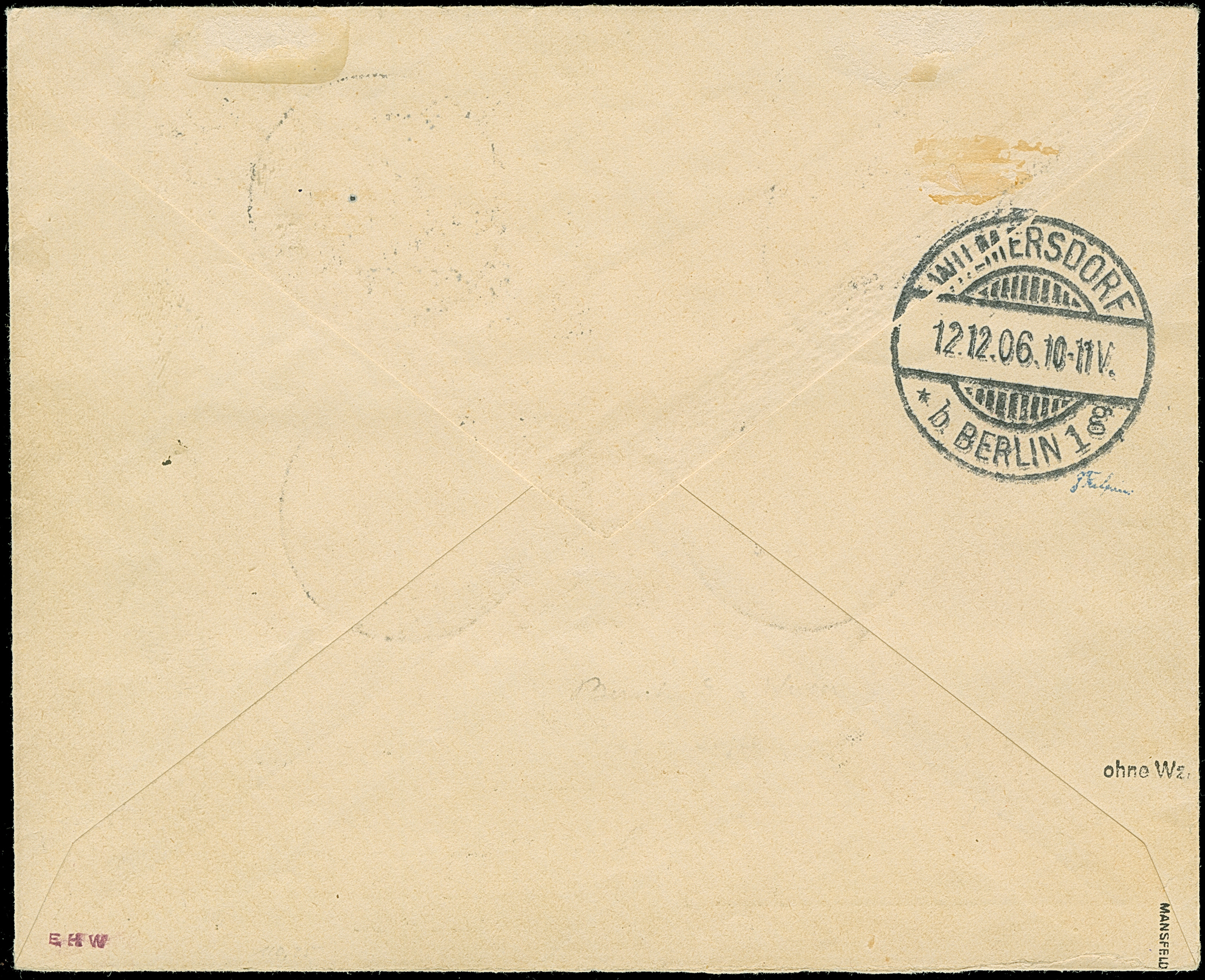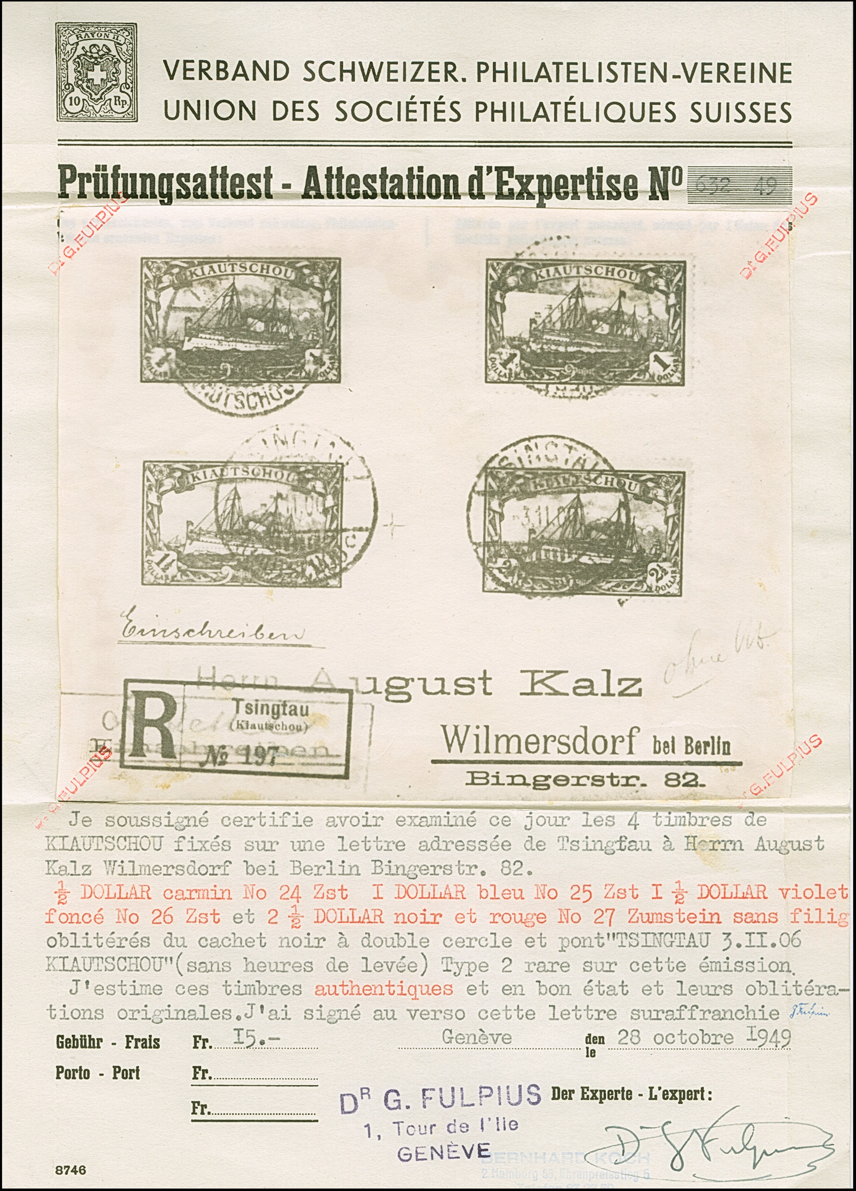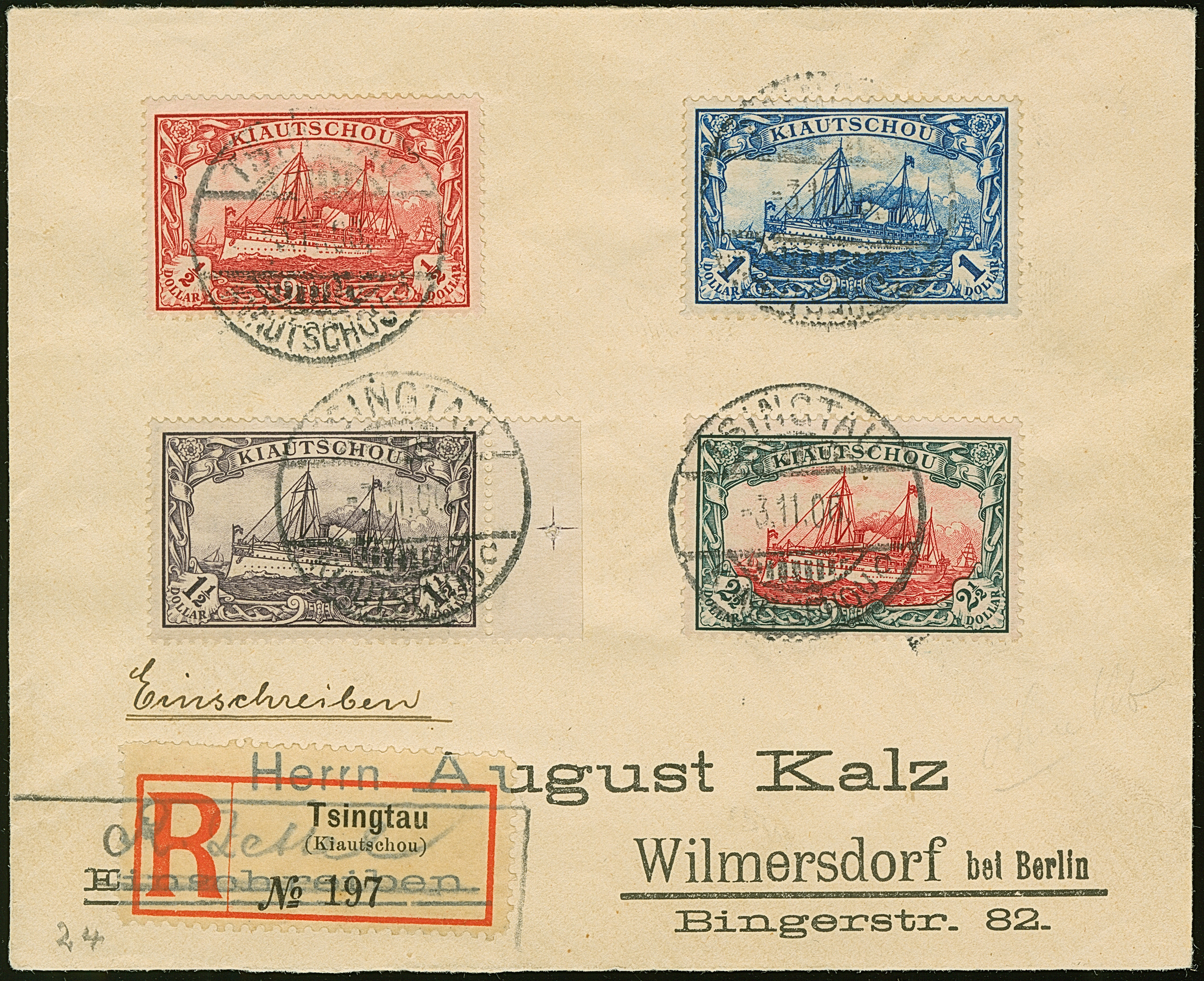 1905, Kaiseryacht ½-1 Dollar und 2½ Dollar. mit Zähnungslöcher 25:16 und Randstück 1½ Dollar mit Zähnungslöcher 26:17, jeweils mit Stempel “TSINGTAU KIAUTSCHOU c 3.11.06” auf überfrankiertem R-Brief nach Wilmersdorf mit Ankunftsstempel. Die farbfrischen Marken sind bis auf einen leichten Eckzahnbug bei der 1 Dollar-Marke in einwandfreier Erhaltung. Ein dekorativer und seltener Brief, sign. Mansfeld und Fulpius mit Fotoattest (1949)