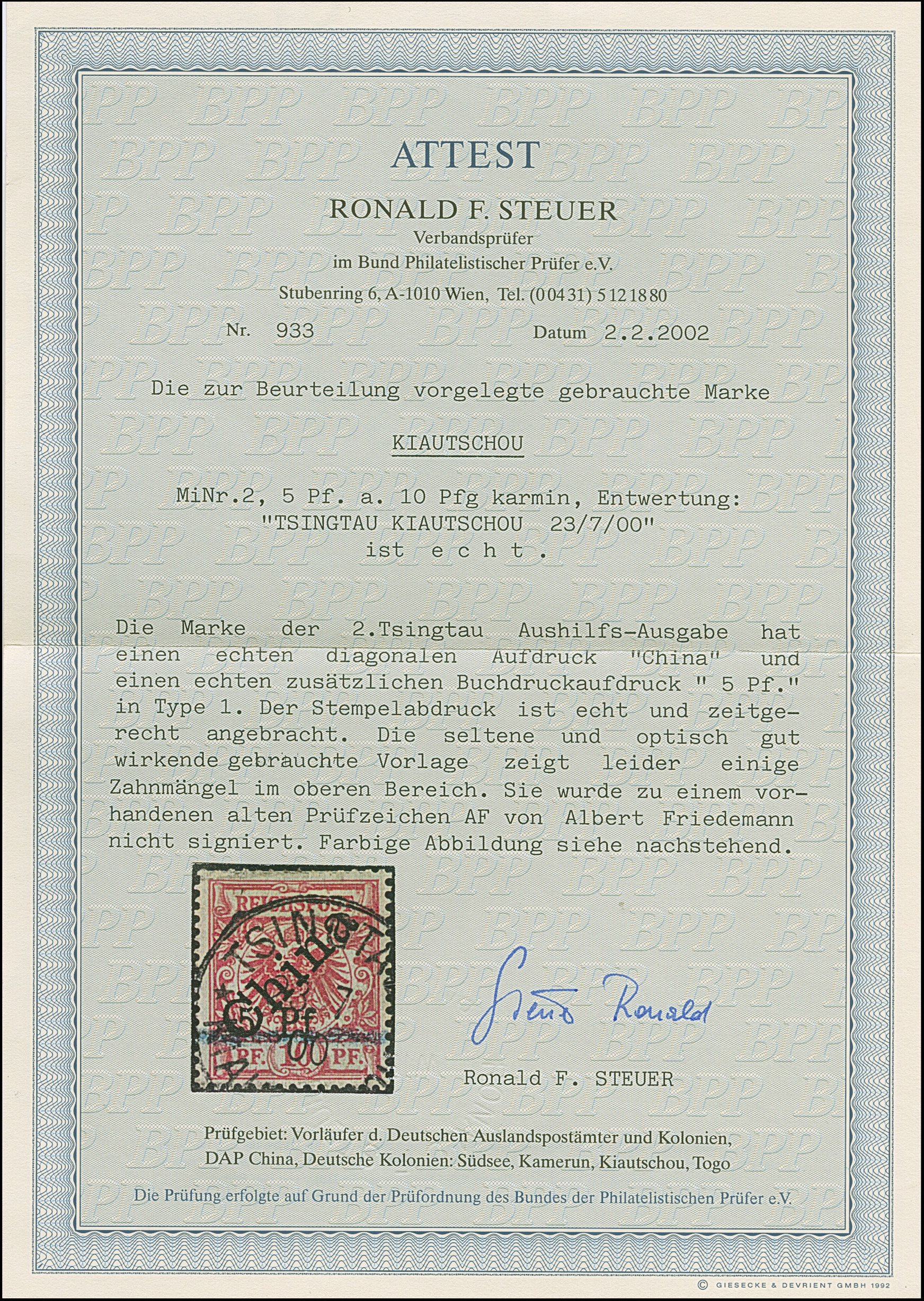 5 Pf. a. 10 Pfg.,Aufdruck in Type I, die obere Zähnung leicht bestoßen, sonst gut gezähnt und farbfrisch, sauber entwertet durch EKr. "TSIGTAU 23/7 00". Fotoatteste Friedemann (1931) und Steuer BPP (2002)