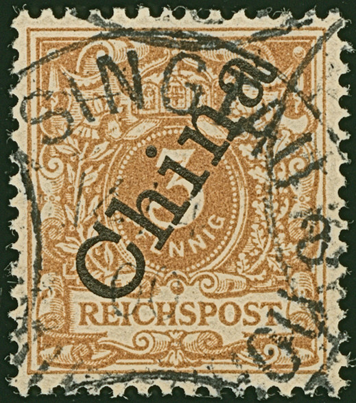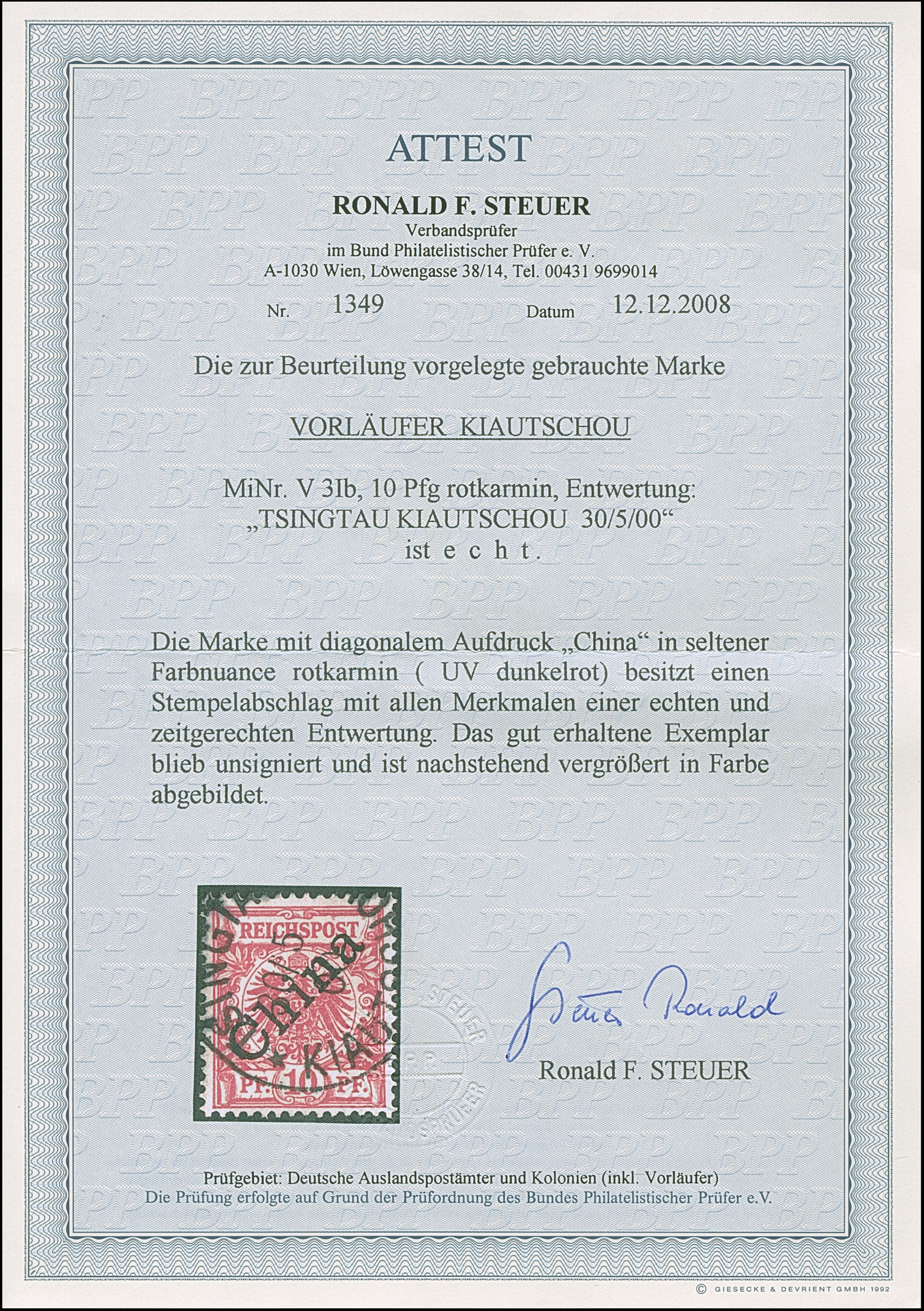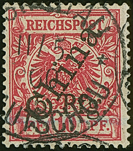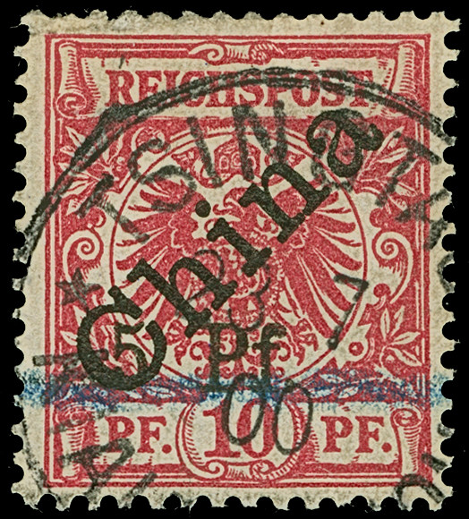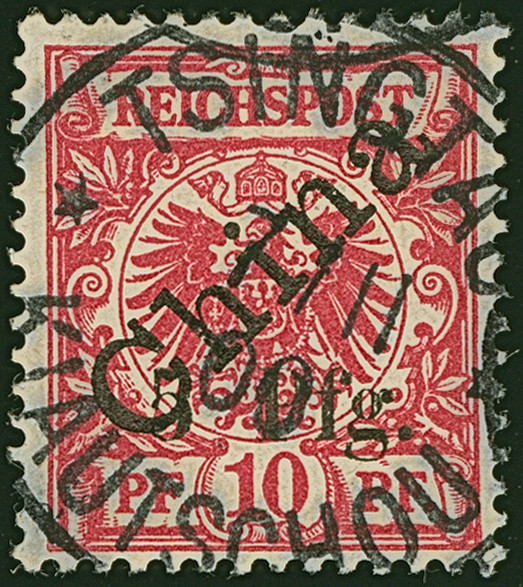 1898/1901, China Diagonaler Aufdruck 10 Pfg. rotkarmin, farbfrisch und gut gezähnt, sauber mit Stempel “TSINGTAU KAIUTSCHOU 30/5 00” entwertet, tadellos, ein schönes Stück dieser seltenen Marke, Fotoattest Steuer BPP (2008)