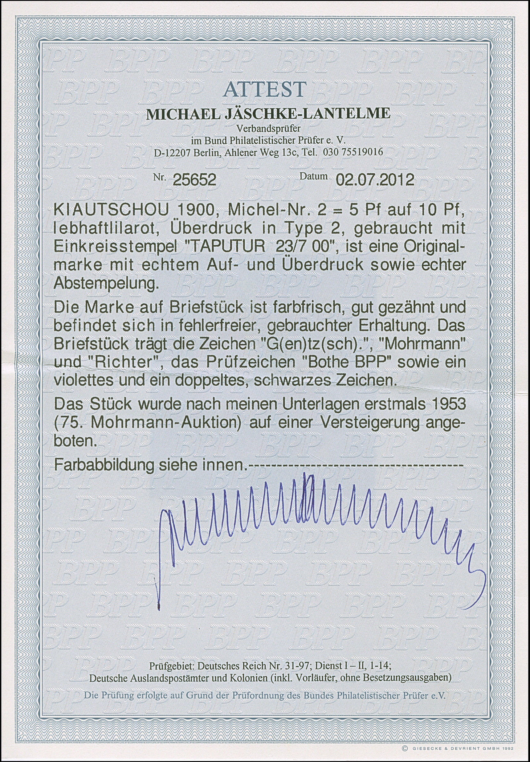 1900, 2. Tsingtau-Ausgabe 5 Pf. auf 10 Pfg. lebhaftlilarot, Aufdrucktype 2, farbfrisch und gut gezähnt, sauber mit klarem EKr. “TAPUTUR 23/7 00” auf kleinem Briefstück, tadellos, ein sehr schönes Stück dieser seltenen Marke, u.a. sign. Bothe BPP und Fotoattest Jäschke-L. BPP (2012)