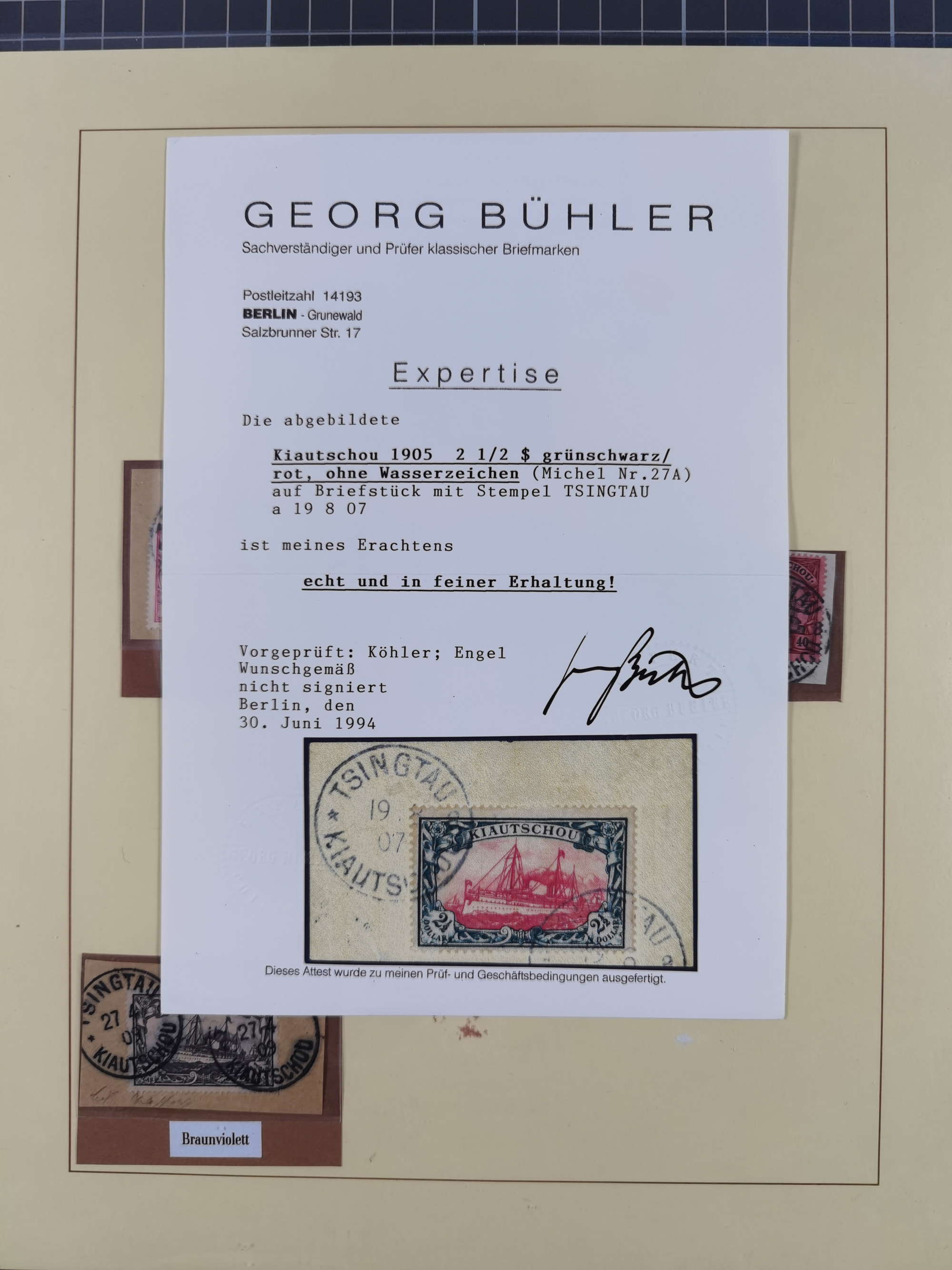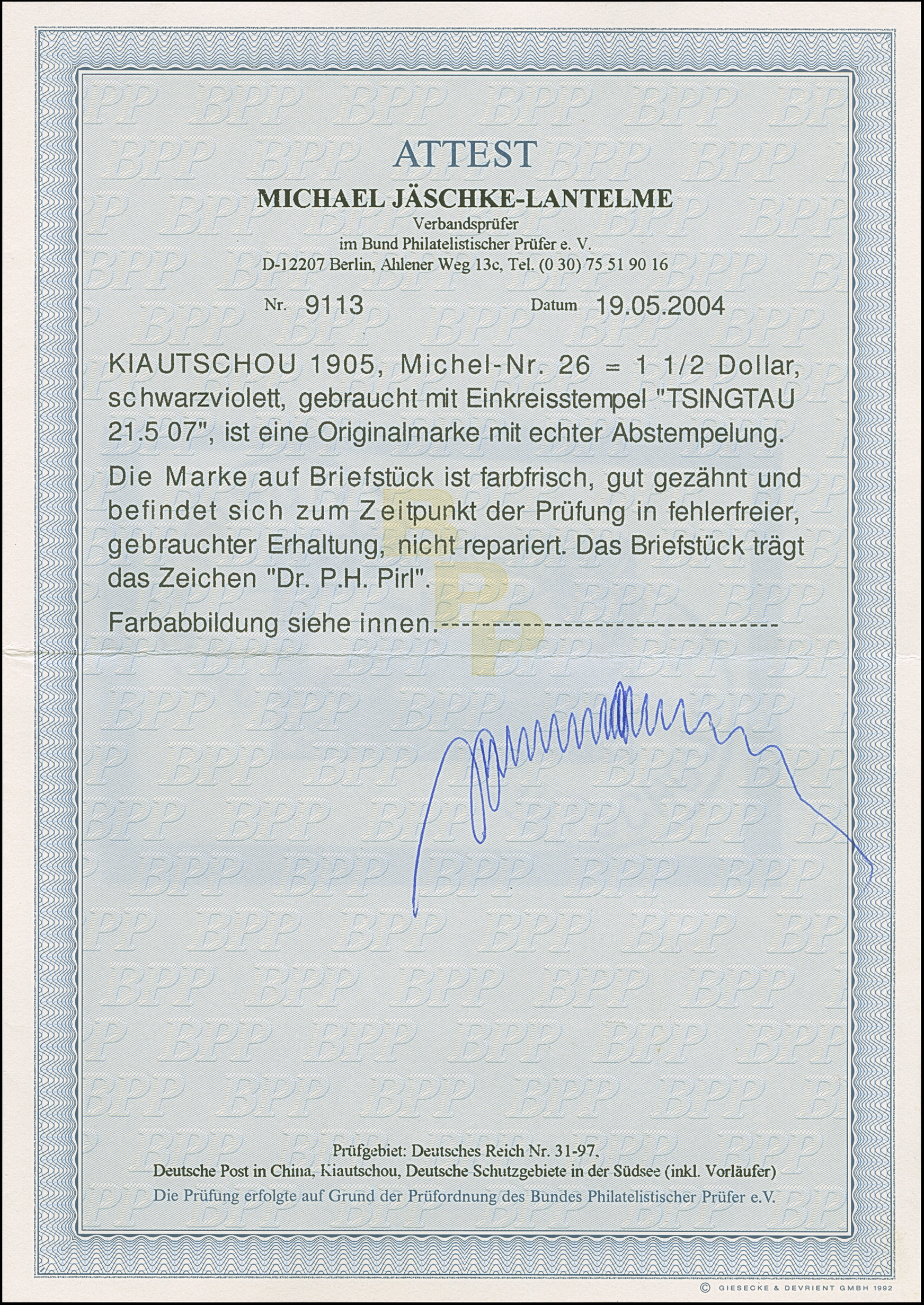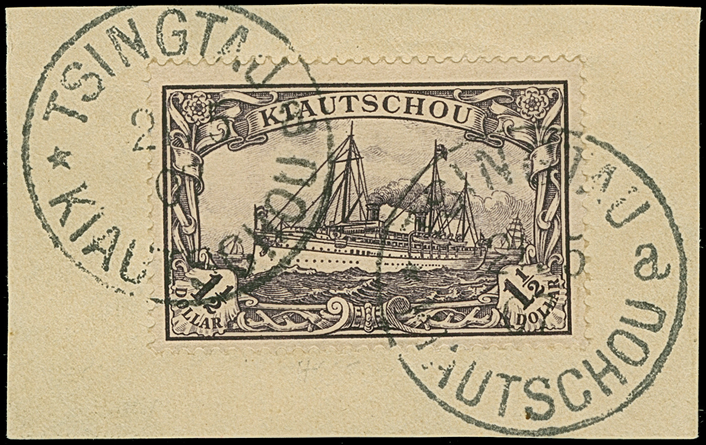 1905, Kaiseryacht 1½ $. schwarzviolett, 26:17 Zähnungslöcher, farbfrisch und gut gezähnt, sauber mit EKr. “TSINGTAU 21 5 07” auf Briefstück, tadellos, sign. Pirl sowie Fotoattest Jäschke-L. BPP (2004)