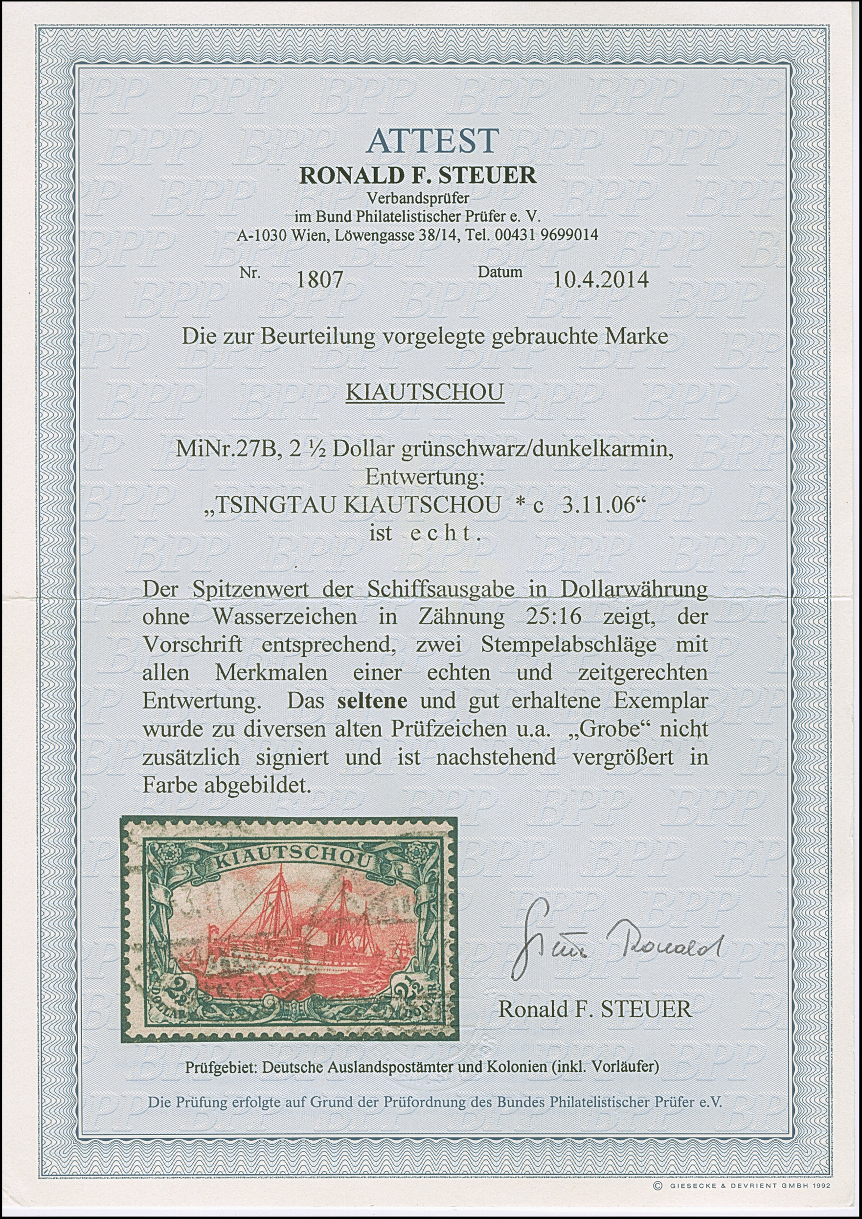 1905, Kaiseryacht 2½ $. grünschwarz/dunkelkarmin, 25:16 Zähnungslöcher, farbfrisch und gut gezähnt, sauber mit “TSINGTAU 1.11 06” entwertet, tadellos, ein schönes Stück dieser seltenen Marke, u.a. sign. Grobe sowie Fotoattest Steuer BPP (2014)